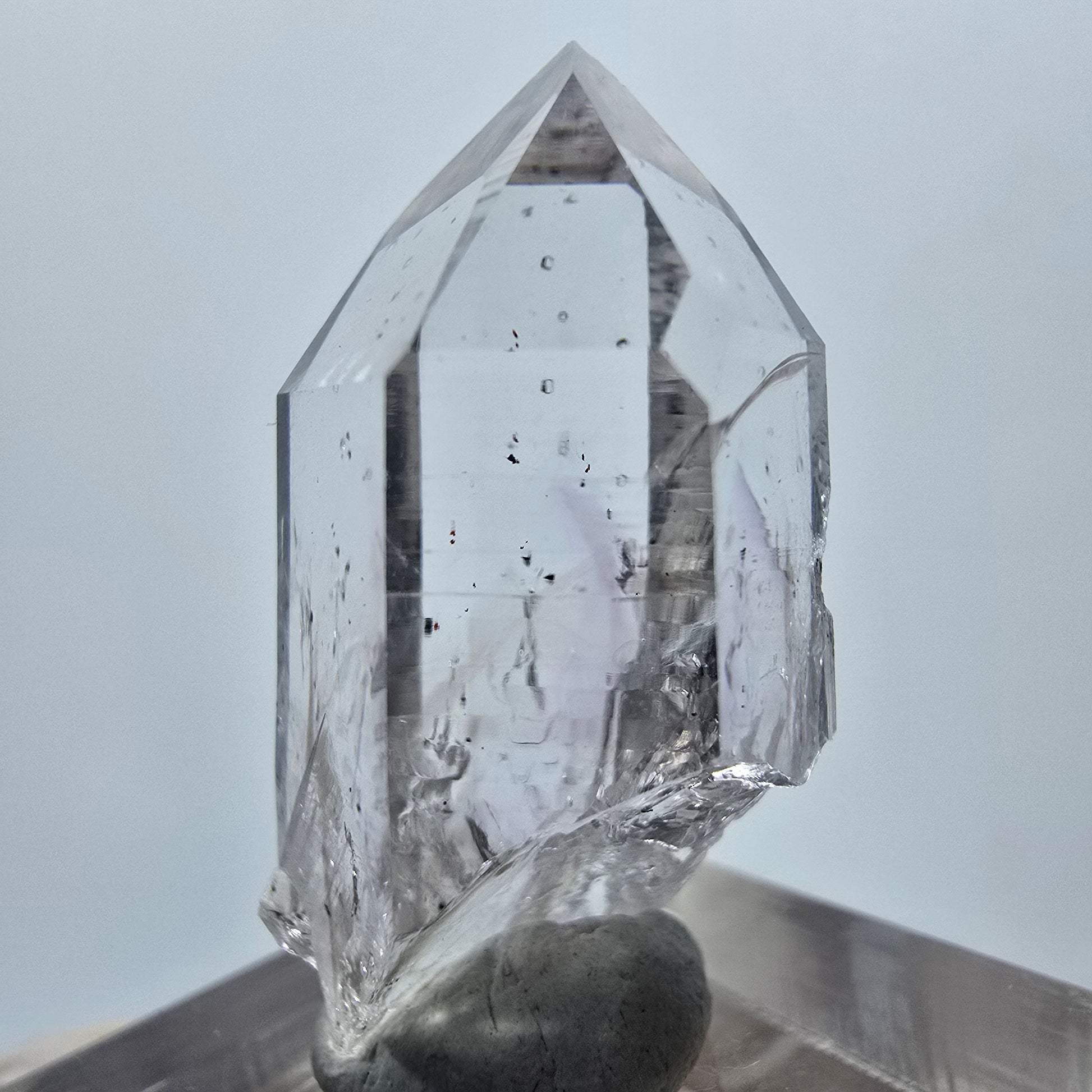 - Farbe: klar, lila, weiß, transparent, mit schwarzen Hämatit-Einschlüssen