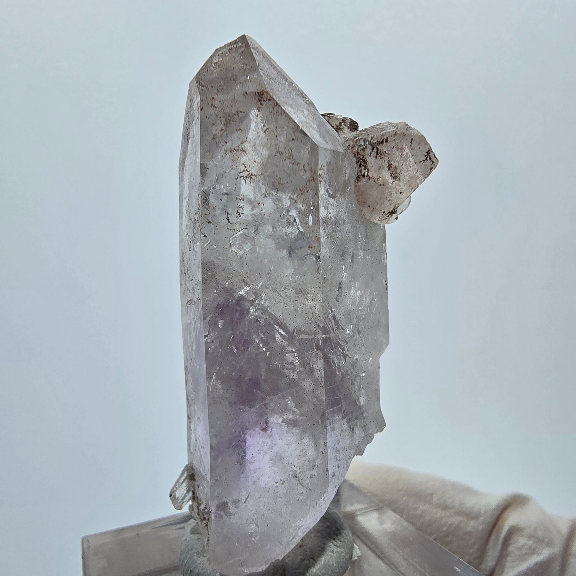 Lemurian Phantom Amethyst mit Hämatit – Eine seltene Kristallspitze aus der berühmten Streep Mine in Namibia mit wunderschönen inneren Phantomen und charakteristischen schwarzen Hämatit-Einschlüssen. Diese transparente Amethyst-Spitze besticht durch ihre klare violette bis weiße Färbung und die typischen horizontalen Querrillen (Lemurian Codes) an der Oberfläche, die für diese besonderen Quarzkristalle charakteristisch sind.