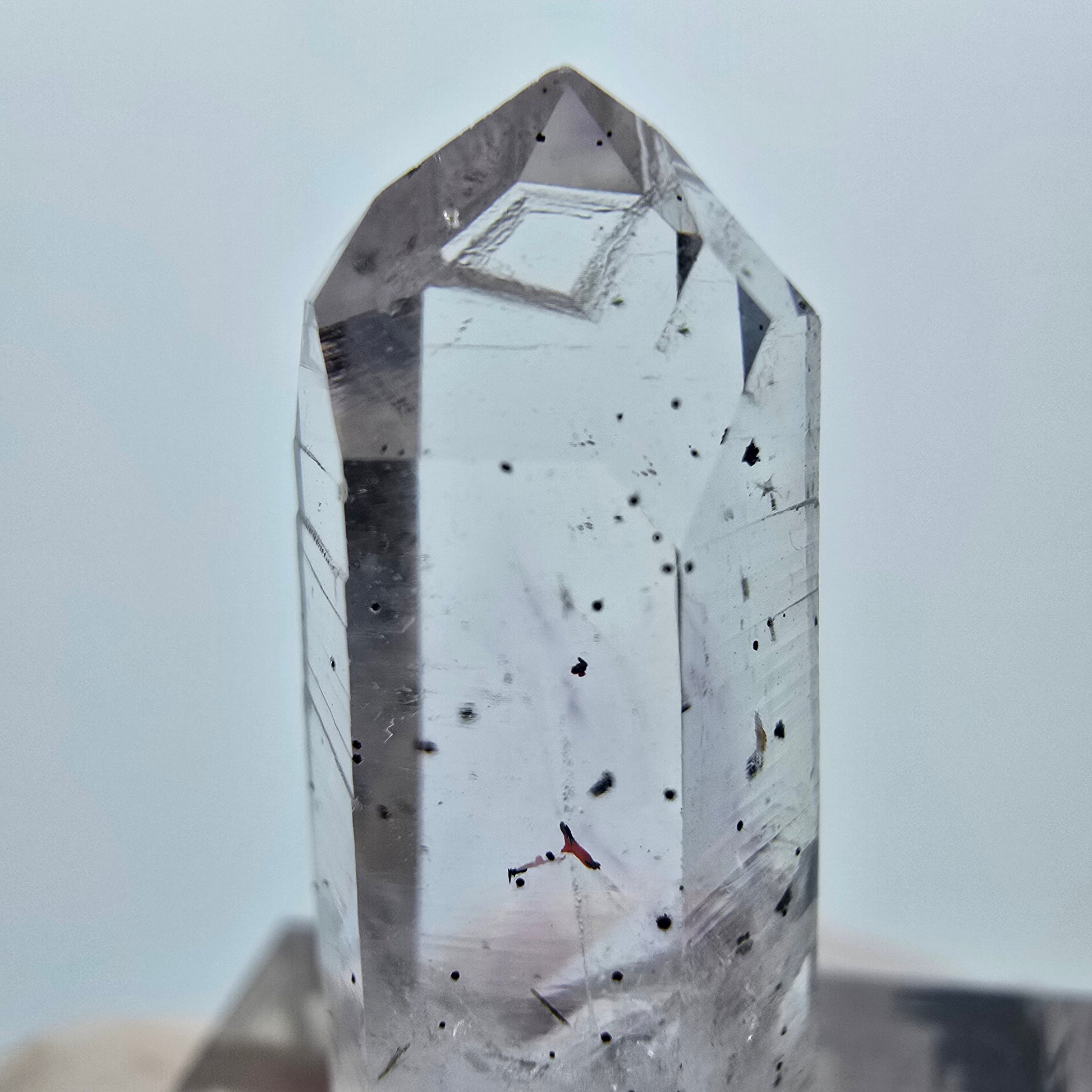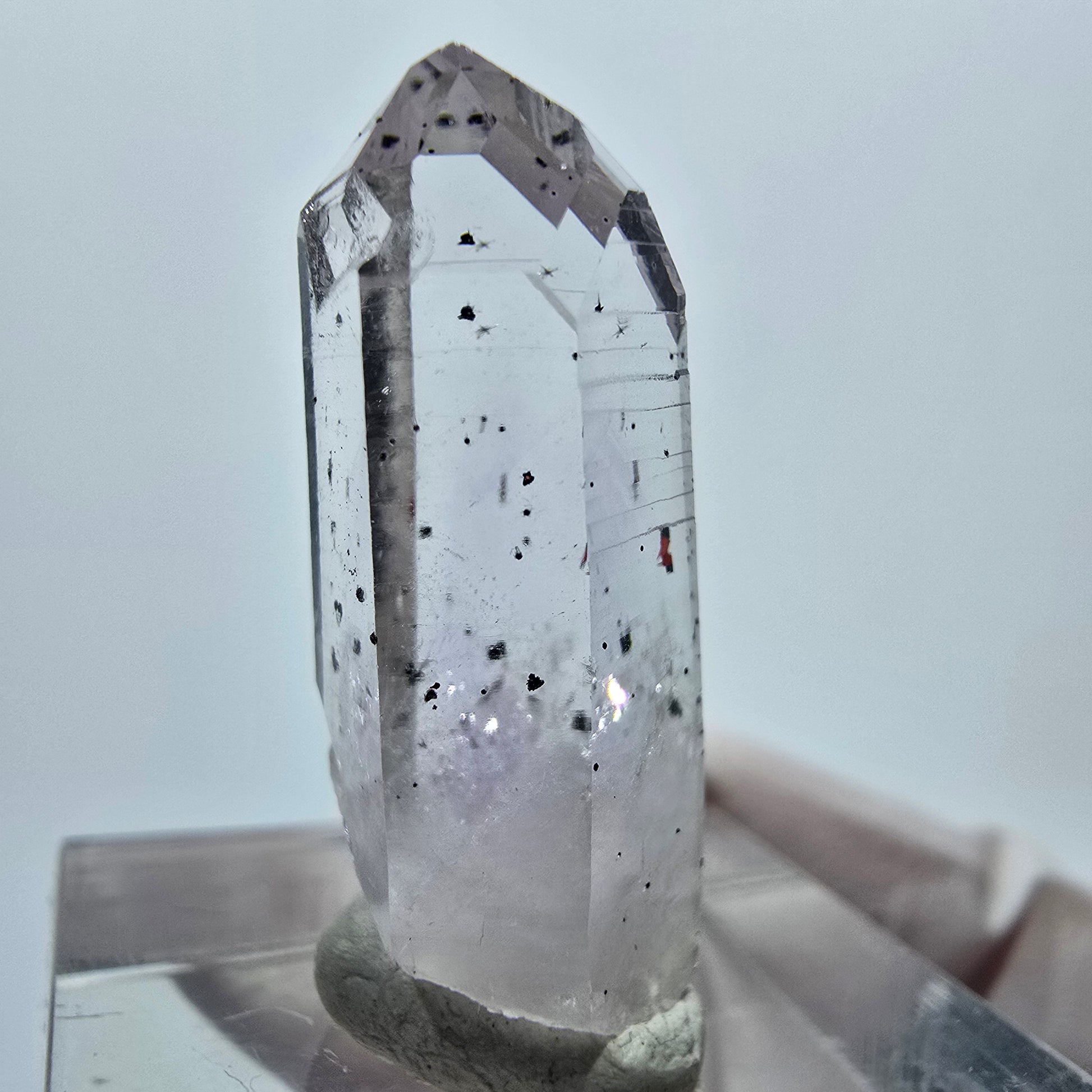 Diese seltene Lemurian Phantom Amethyst Spitze aus der mystischen Streep Mine in Goboboseb, Namibia, besticht durch ihre klare lila und weiße Transparenz mit faszinierenden Hämatit-Phantomen im Inneren. Die charakteristischen horizontalen Querrillen (Lemurian Linien) an der Oberfläche machen diesen Kristall zu einem begehrten Sammlerstück für Mineralienliebhaber.