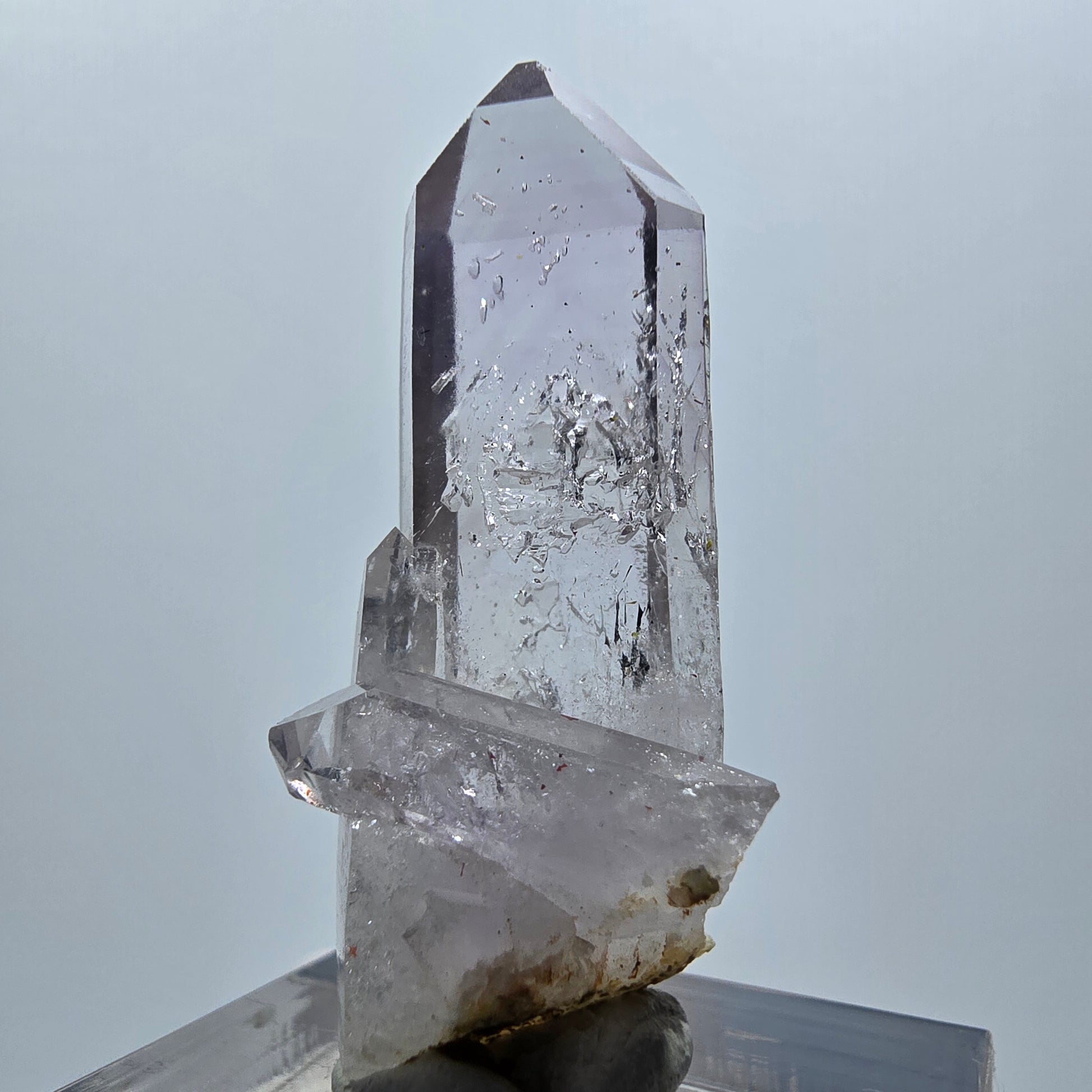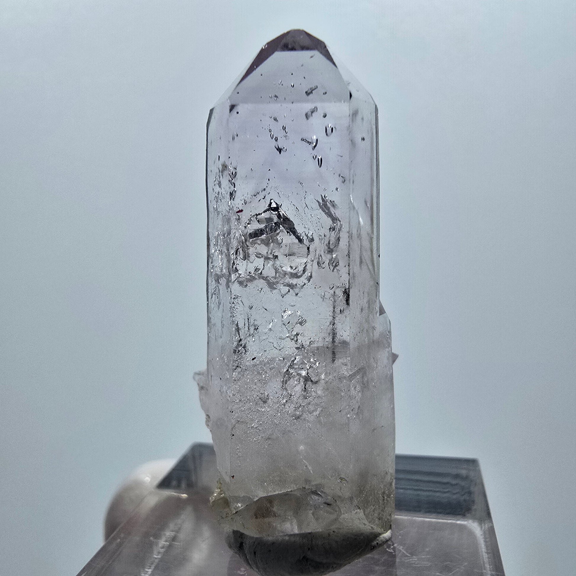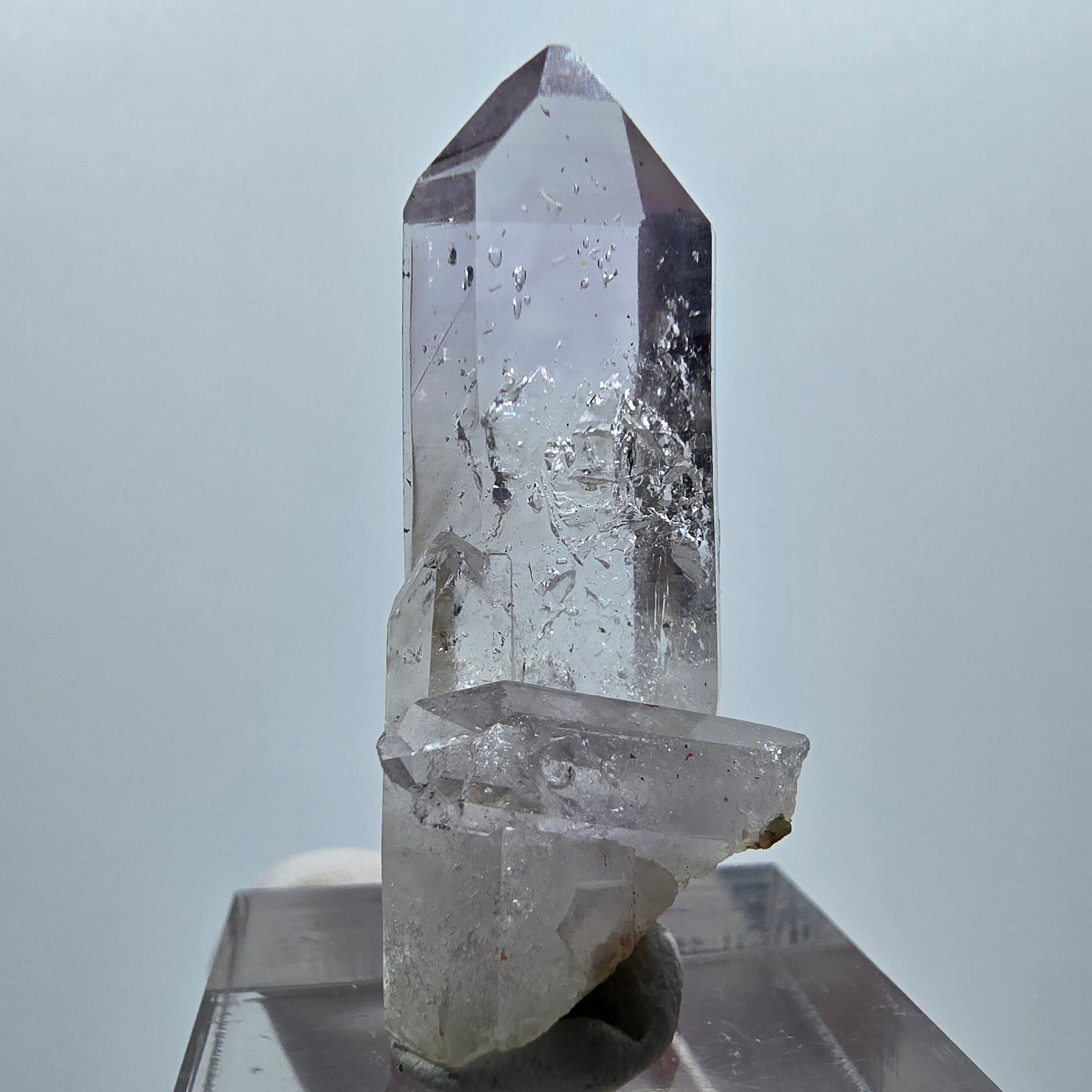 Typisch sind die horizontal gewachsenen Querrillen an der Oberfläche, die den Lemurian-Quarz eindeutig kennzeichnen und diese Spitze zu einem seltenen Sammlerstück machen.