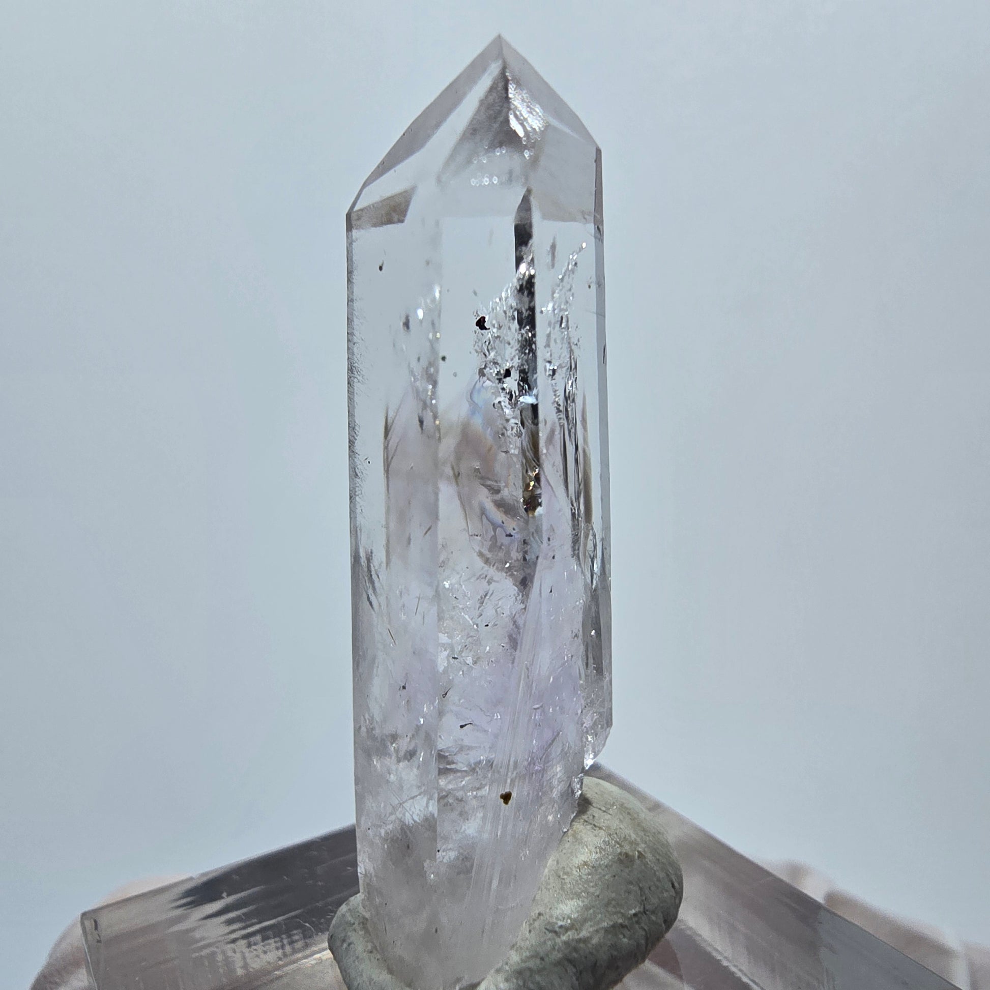 Diese seltene Lemurian Phantom Amethyst Spitze besticht durch ihre klare, lila-weiße Transparenz und faszinierende Phantom-Strukturen im Inneren. Horizontal verlaufende Querrillen an der Oberfläche kennzeichnen die typische Lemurian-Wachstumsstruktur.