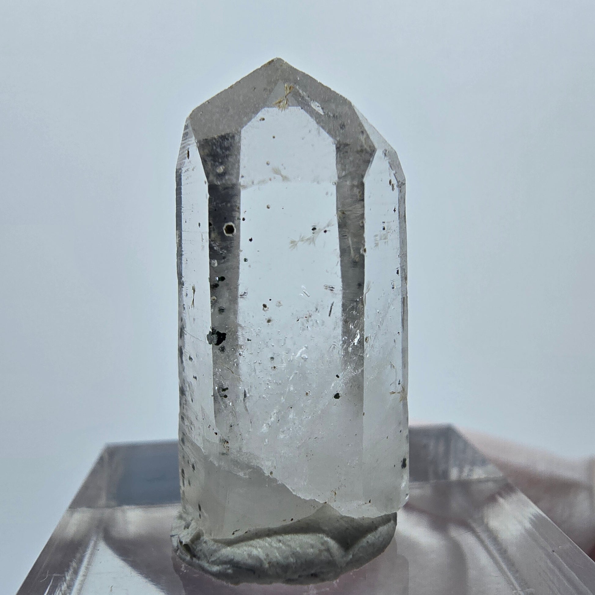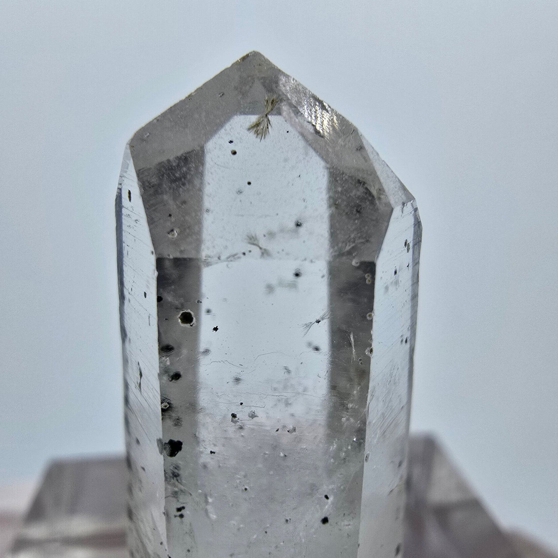 Dieser Kristall besticht durch seine einzigartigen horizontalen Querrillen an der Oberfläche, die für Lemurian Quarze typisch sind, sowie durch die fein ausgebildeten inneren Phantom-Strukturen. Die Kombination aus transparentem Quarz und schwarzem Hämatit ist eine mineralogische Rarität, die Stabilität und emotionale Klarheit fördern soll.