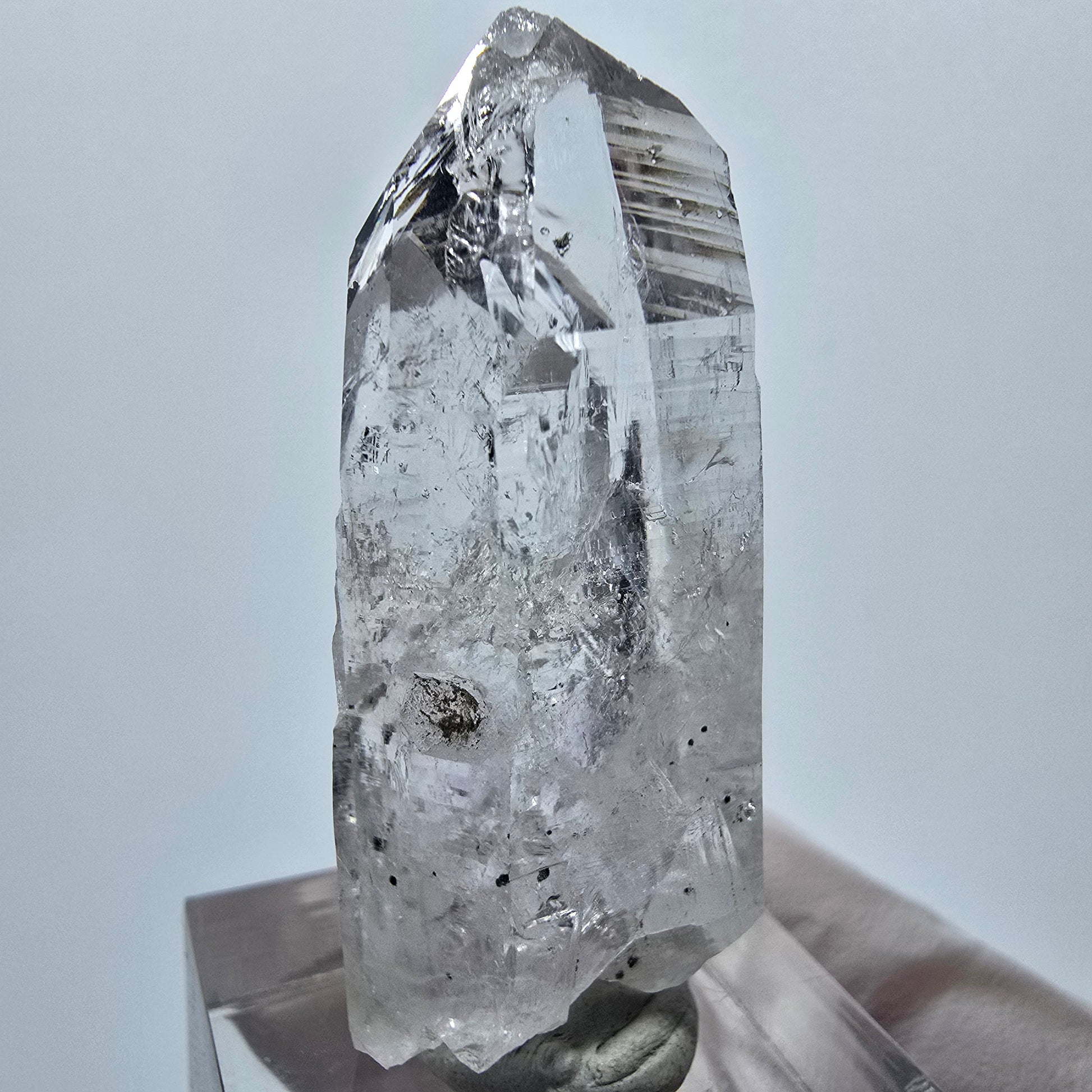 Mit einer Größe von 42 x 19 x 18 mm und einem Gewicht von 18 g ist dieser Quarzkristall ein besonderes Sammlerstück, das klares Wachstum und seltene Einschlussmuster verbindet.