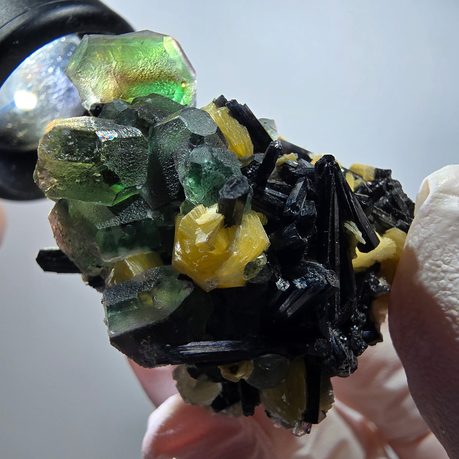 Schöne Mineralienstufe mit grün-braun transparenten, hexagonalen Phantom-Fluorit-Würfeln mit faszinierenden Phantomen im Inneren, ergänzt durch gelb metallisch glänzende Muskovit-Kristalle, schwarze Schörl-Turmalin-Kristalle und Hyalit-Kristalle, die unter UV-Licht neongelb leuchten. Aus dem Erongo in Namibia, Maße 46x32x31 mm, Gewicht 43 g.