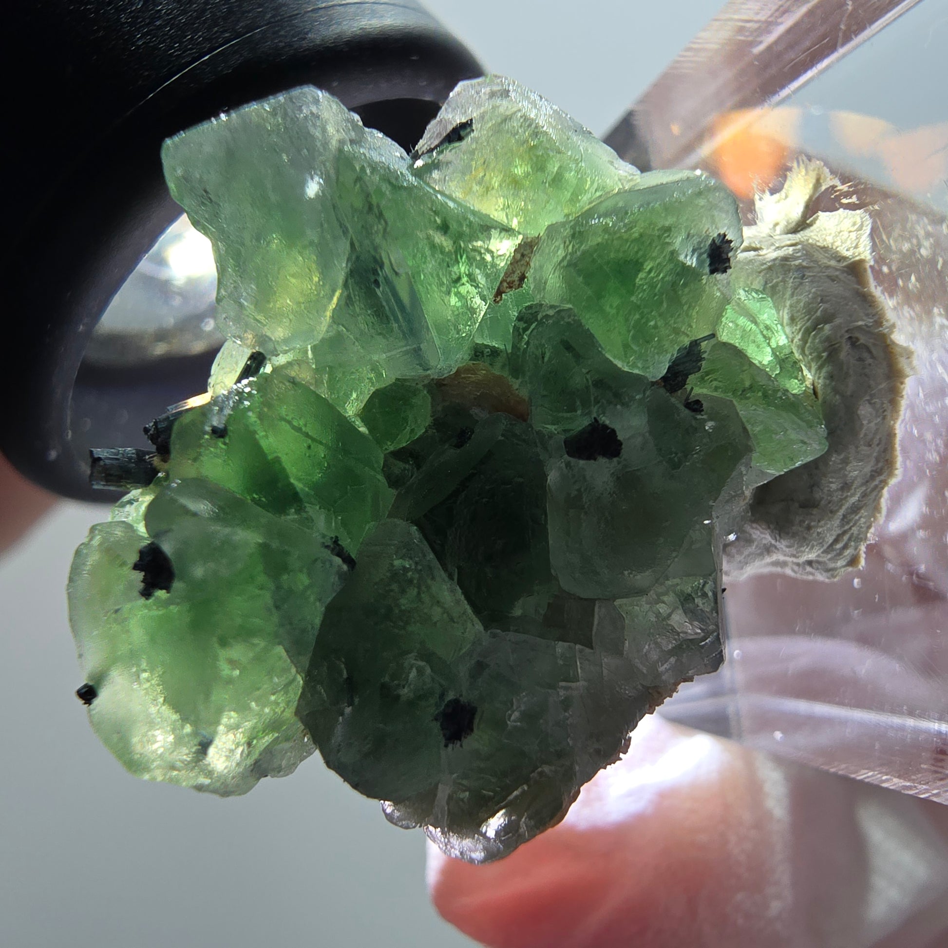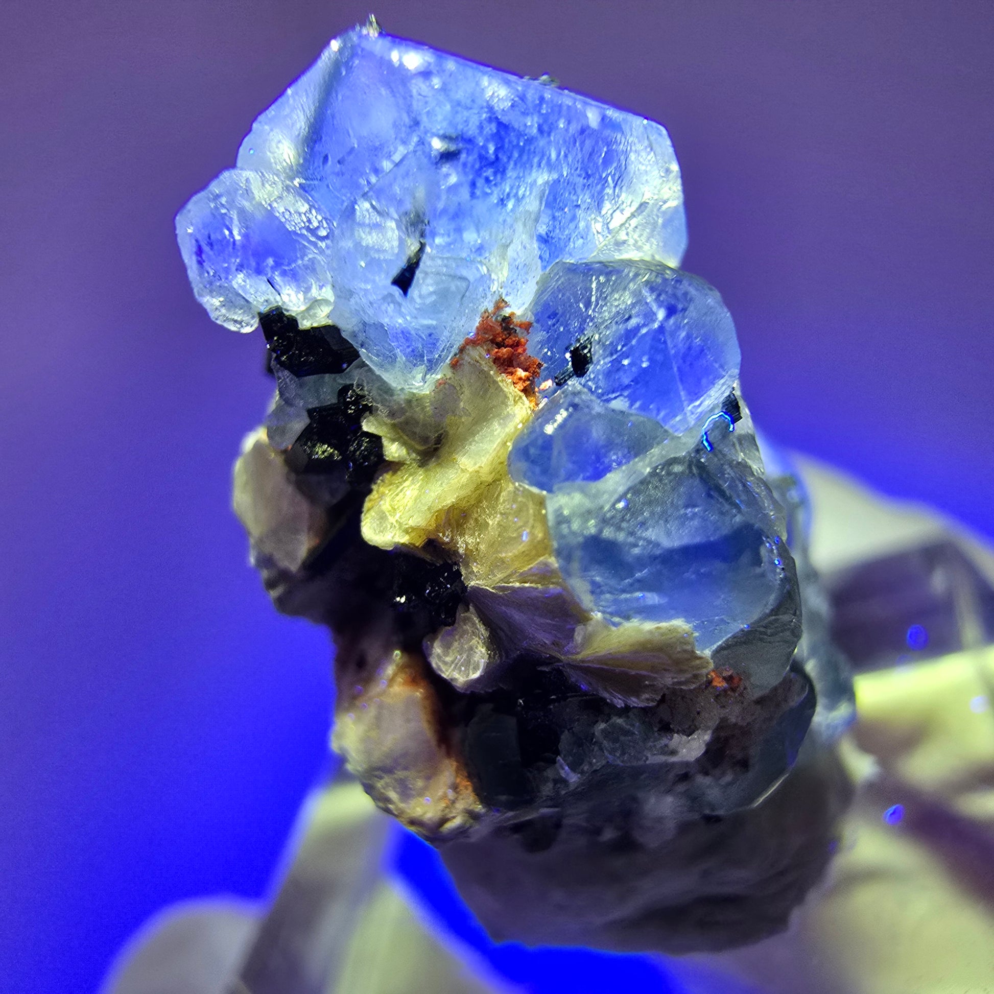 - Mineralien: Phantom Fluorit, Schörl Turmalin, Muskovit, orange-rötliches fluoreszierendes Mineral