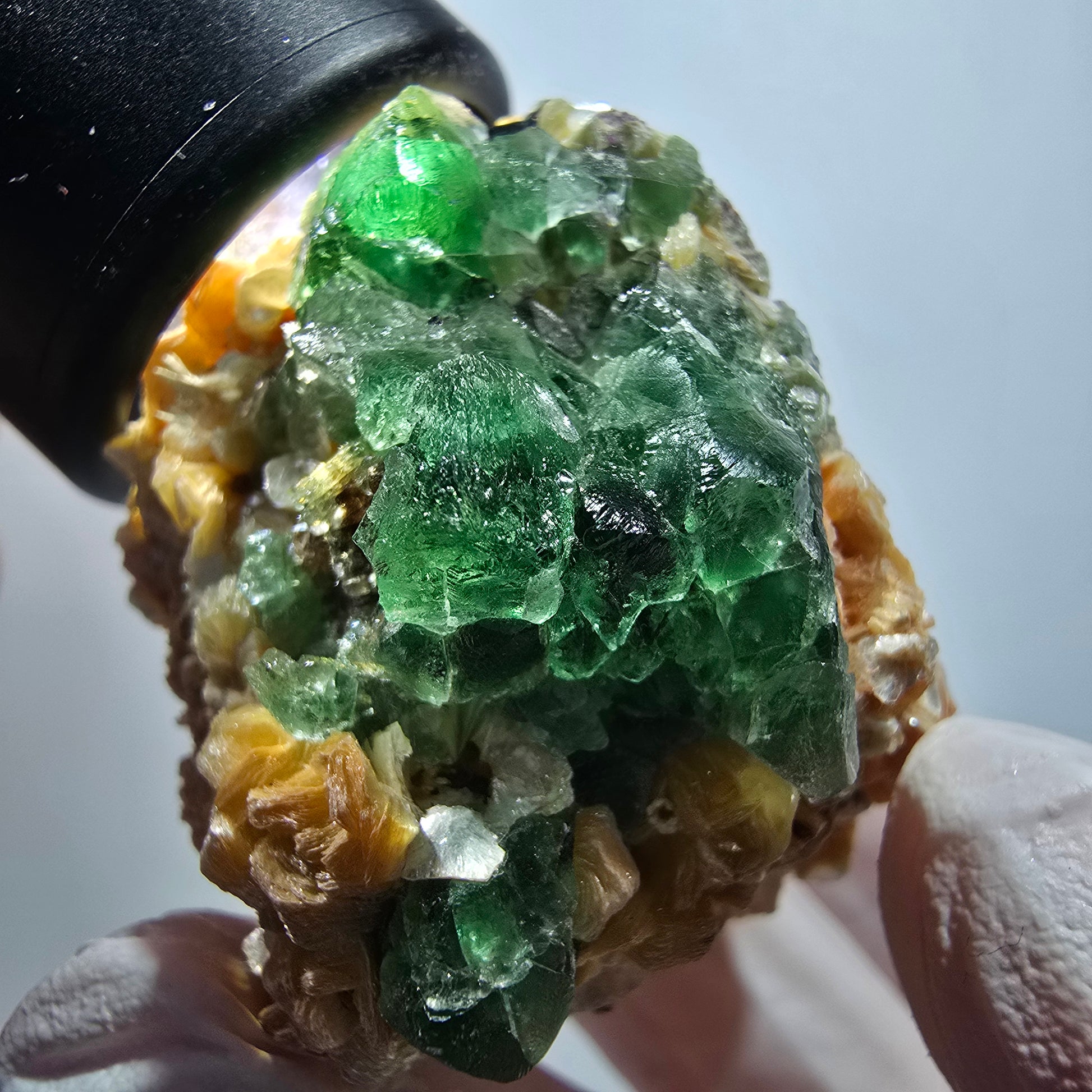 Schöne Mineralienstufe mit grün transparenten **Phantom Fluorit** Würfelkristallen, die faszinierende Phantome im Inneren zeigen. Ergänzt durch gelb metallisch glänzende **Muskovit** Kristalle und schwarze **Schörl Turmalin** Kristalle auf **Muskovit Stufe**.