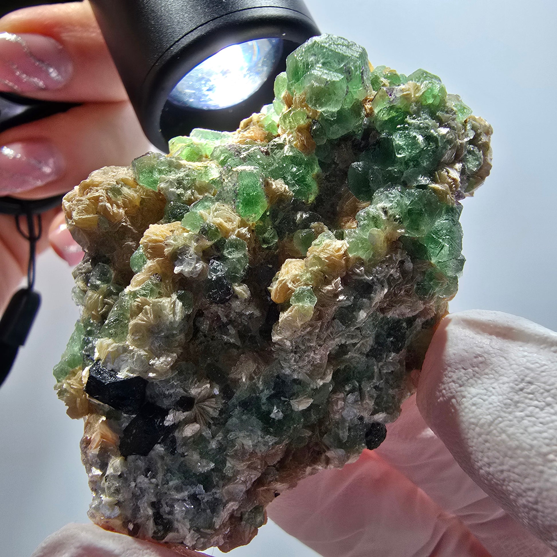 Schöne Mineralienstufe mit grün transparenten Phantom Fluorit Würfeln, die faszinierende Phantome im Inneren zeigen. Ergänzt durch gelb metallisch glänzende Muskovit Kristalle und schwarze Schörl Turmalin Kristalle auf Muskovit Stufe.