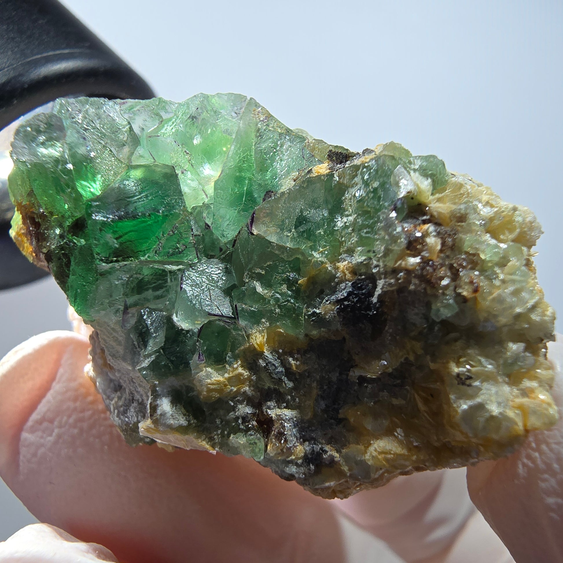 Schöne Mineralienstufe mit grün-lila-braun-gelben transparenten **Phantom Fluorit Würfeln**, Muskovit und Hyalit aus dem Erongo, Namibia. Die Fluorit-Kristalle zeigen faszinierende Phantome im Inneren, Muskovit glänzt gelb-metallisch und Hyalit leuchtet unter UV-Licht neongelb.