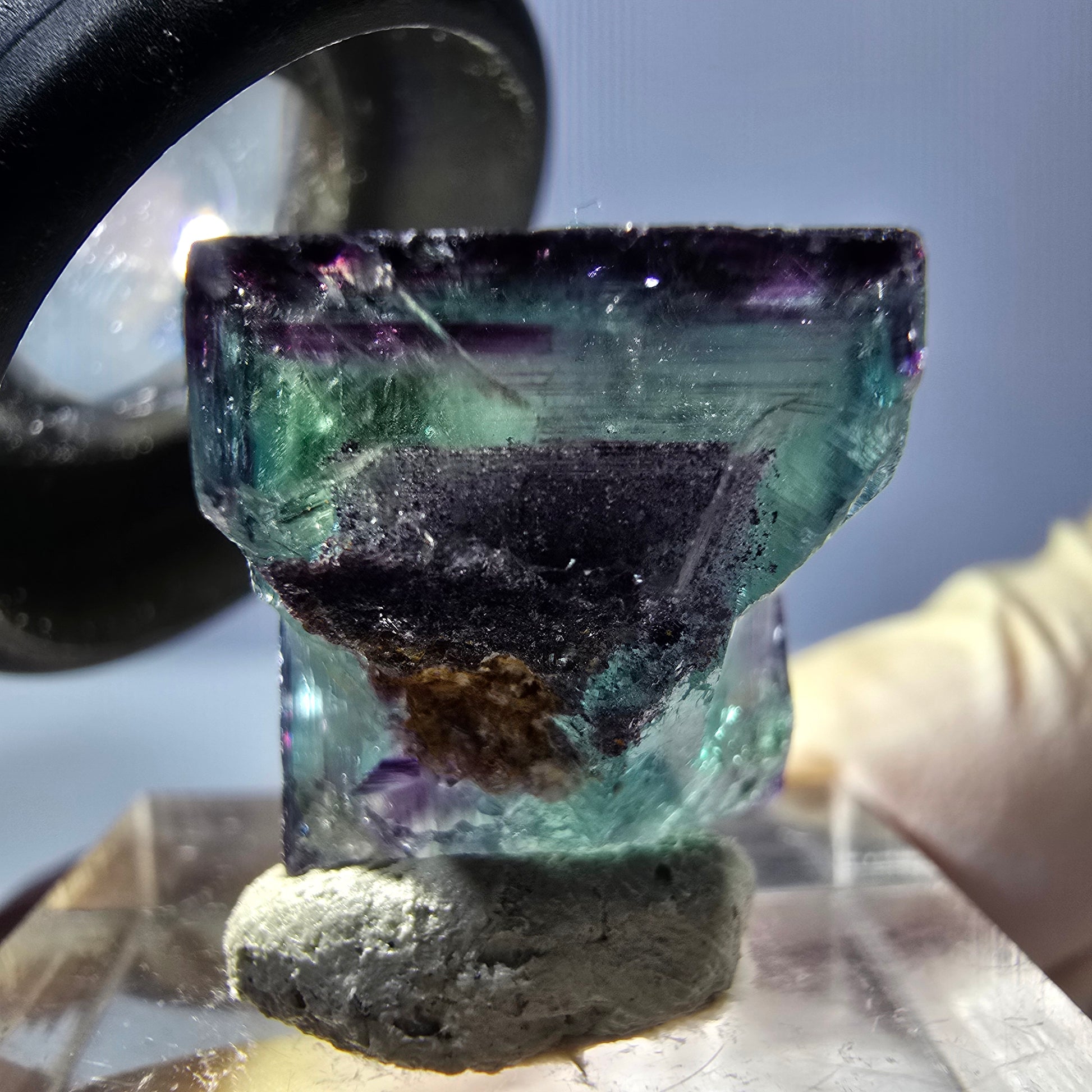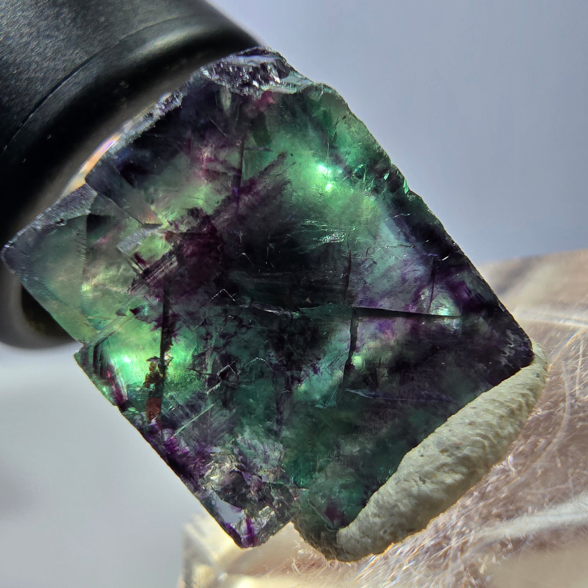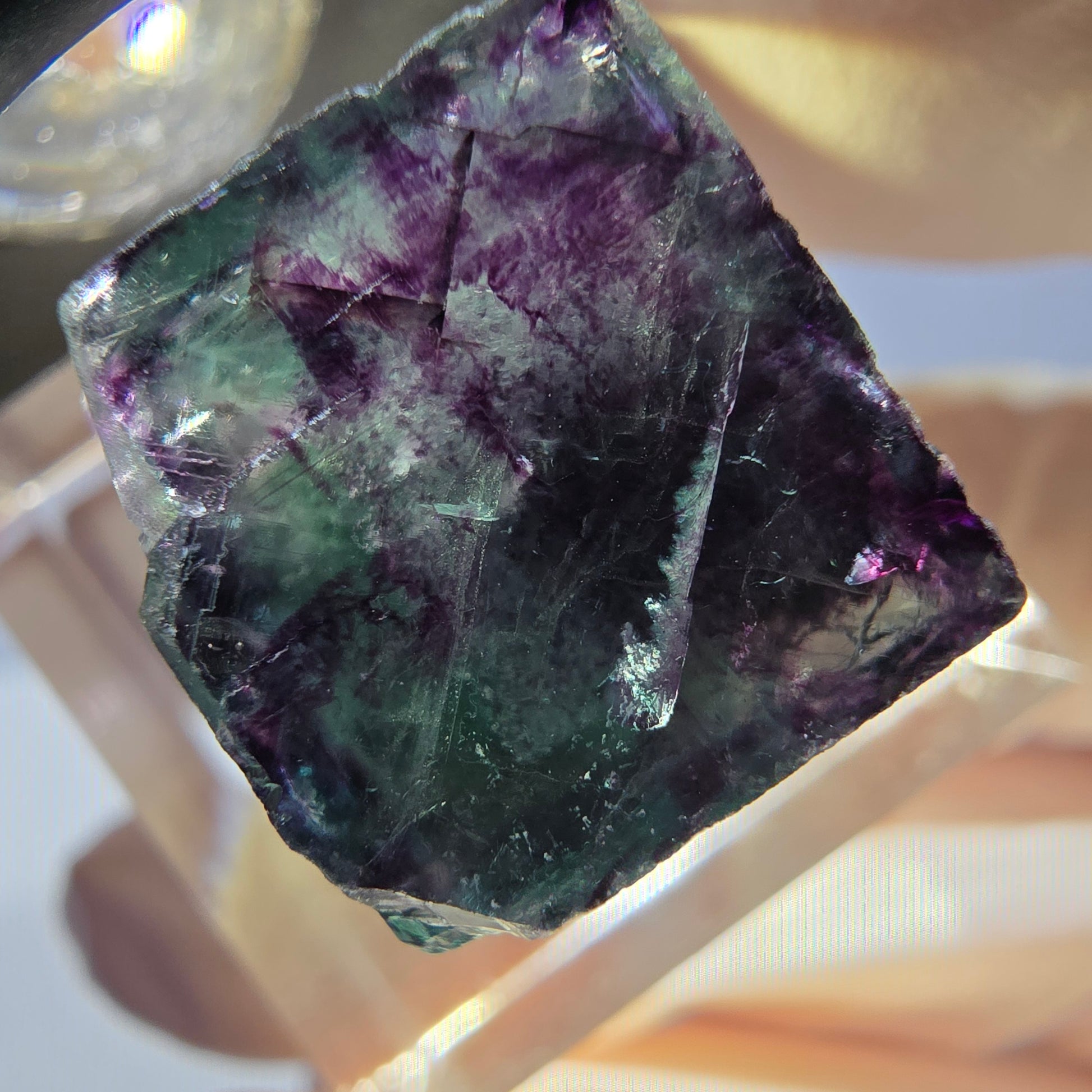 Entdecken Sie unseren einzigartigen Phantom Fluorit Würfel, ein atemberaubendes Naturprodukt, das mit seiner kubischen Form und der parkettierten Oberfläche besticht. Hergestellt aus klarem, grün-lila transparentem Fluorit, zieht dieser Kristall durch die schönen Phantome im Inneren alle Blicke auf sich.