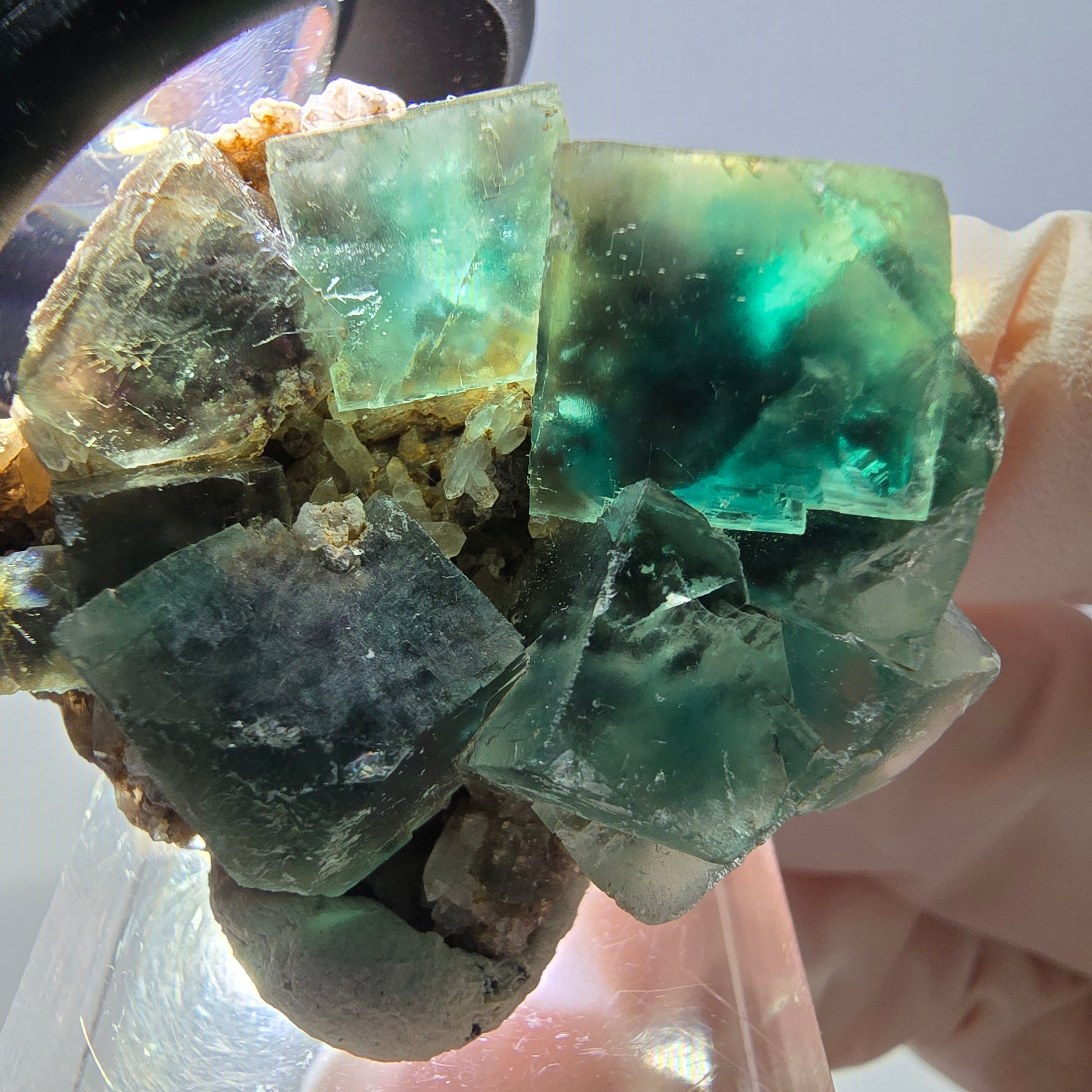 Entdecken Sie diese außergewöhnliche Stufe von Fluorit, die durch ihre klaren, grünen, transparenten kubischen Kristalle besticht. Jedes Exemplar zeigt faszinierende Phantome im Inneren und besitzt eine teilweise parkettierte Oberfläche, die das Licht auf einzigartige Weise reflektiert. Zudem sind auf der Matrix einige Quarz Kristallspitzen zu finden, die das Gesamtbild abrunden und die natürliche Schönheit dieser Mineralien betonen.