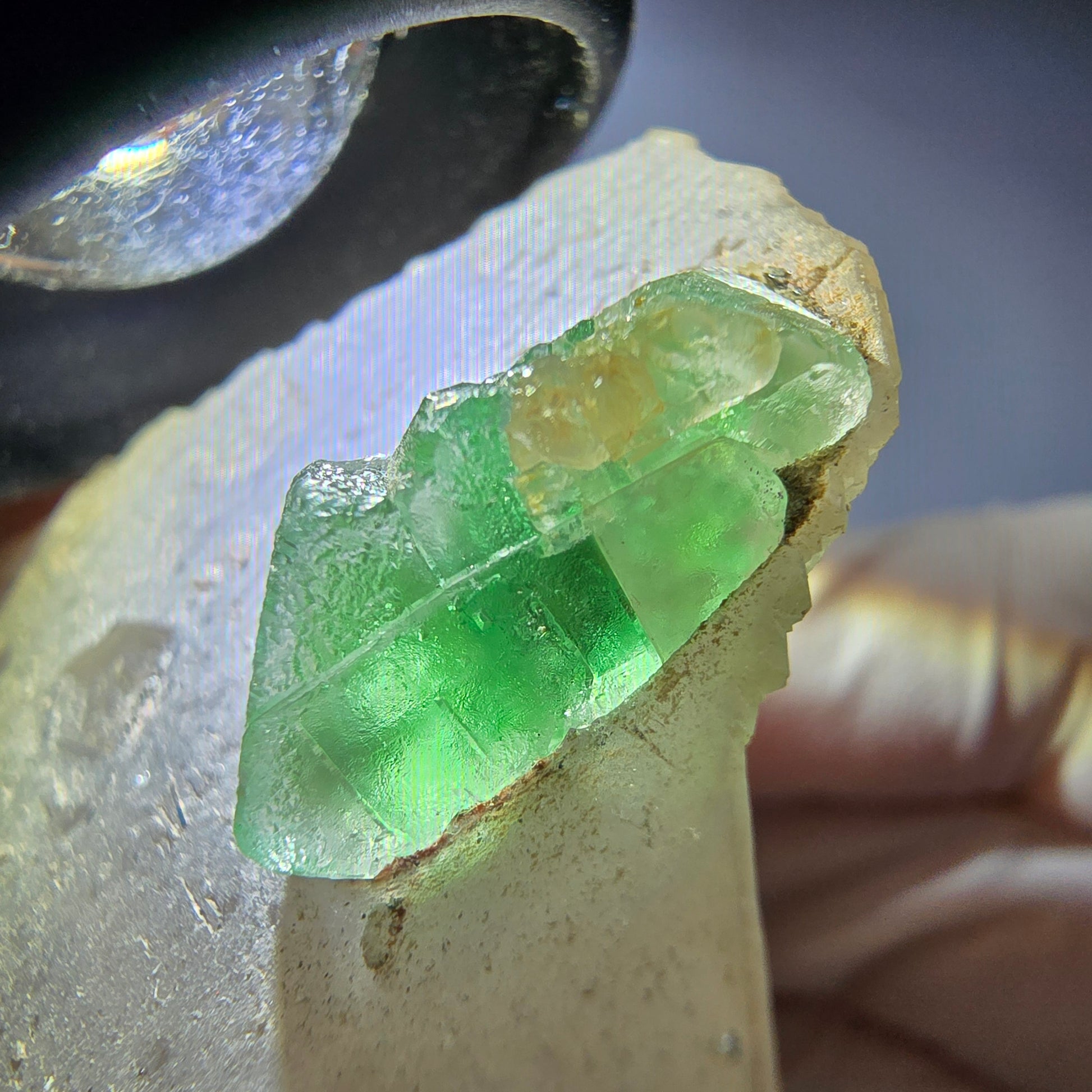 - Besonderheit: Grüne Phantom Fluorit Würfel mit sichtbaren Phantomen, Hyalit leuchtet unter UV-Licht neongelb