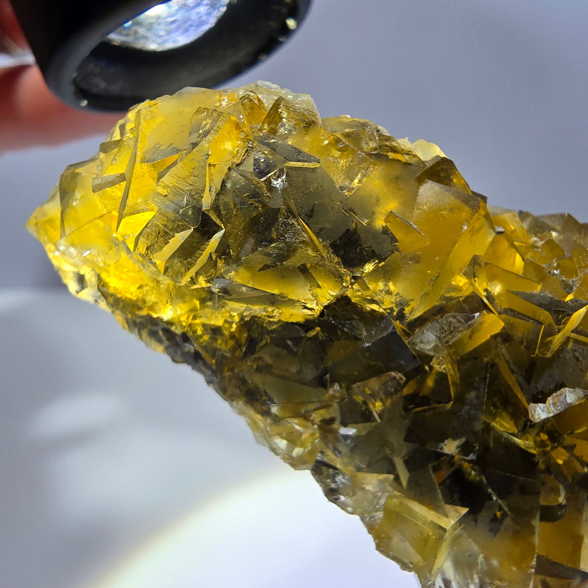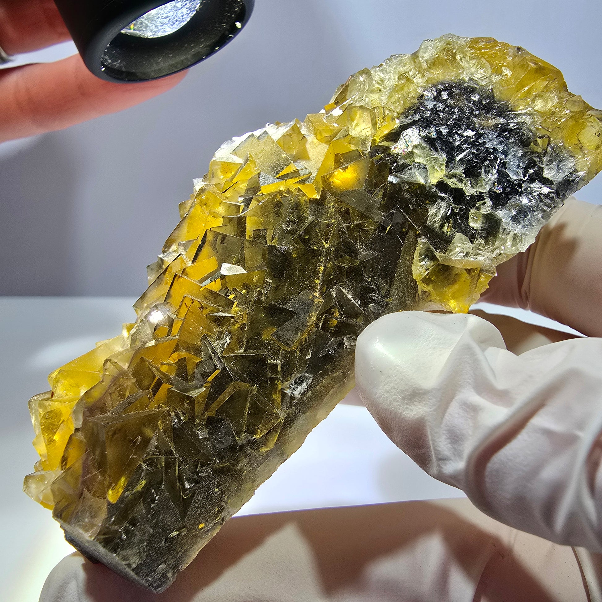 Entdecken Sie diese seltene gelb-grün transparente Fluorit Würfel Stufe. Diese beeindruckenden Kristalle zeigen wunderschöne kubische Formen und faszinierende Phantome im Inneren. Ein tolles Stück für Sammler und Liebhaber von Mineralien!