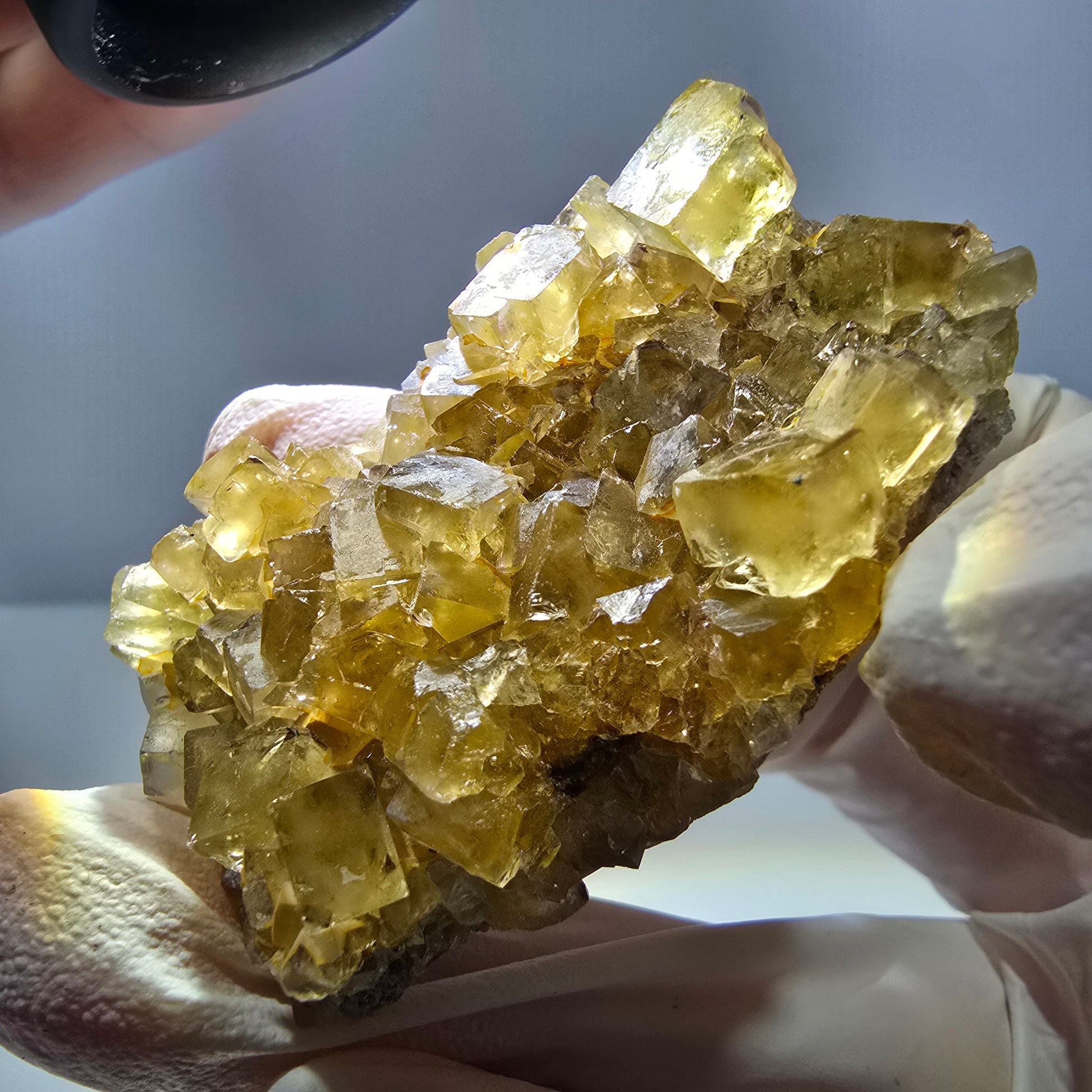 Entdecken Sie diese seltene, gelb transparente Fluorit Würfel Stufe mit wunderschön ausgeprägten kubischen Kristallen. Die faszinierenden Phantome im Inneren des Kristalls verleihen jedem Stück eine außergewöhnliche, mysteriöse Ausstrahlung. Die Maße betragen 53 x 33 x 18 mm und das Gewicht liegt bei 43 g. Dieser besondere Fund stammt aus Okorusu, Namibia, einer berühmten Fundstätte für hochwertige Mineralien und Kristalle.