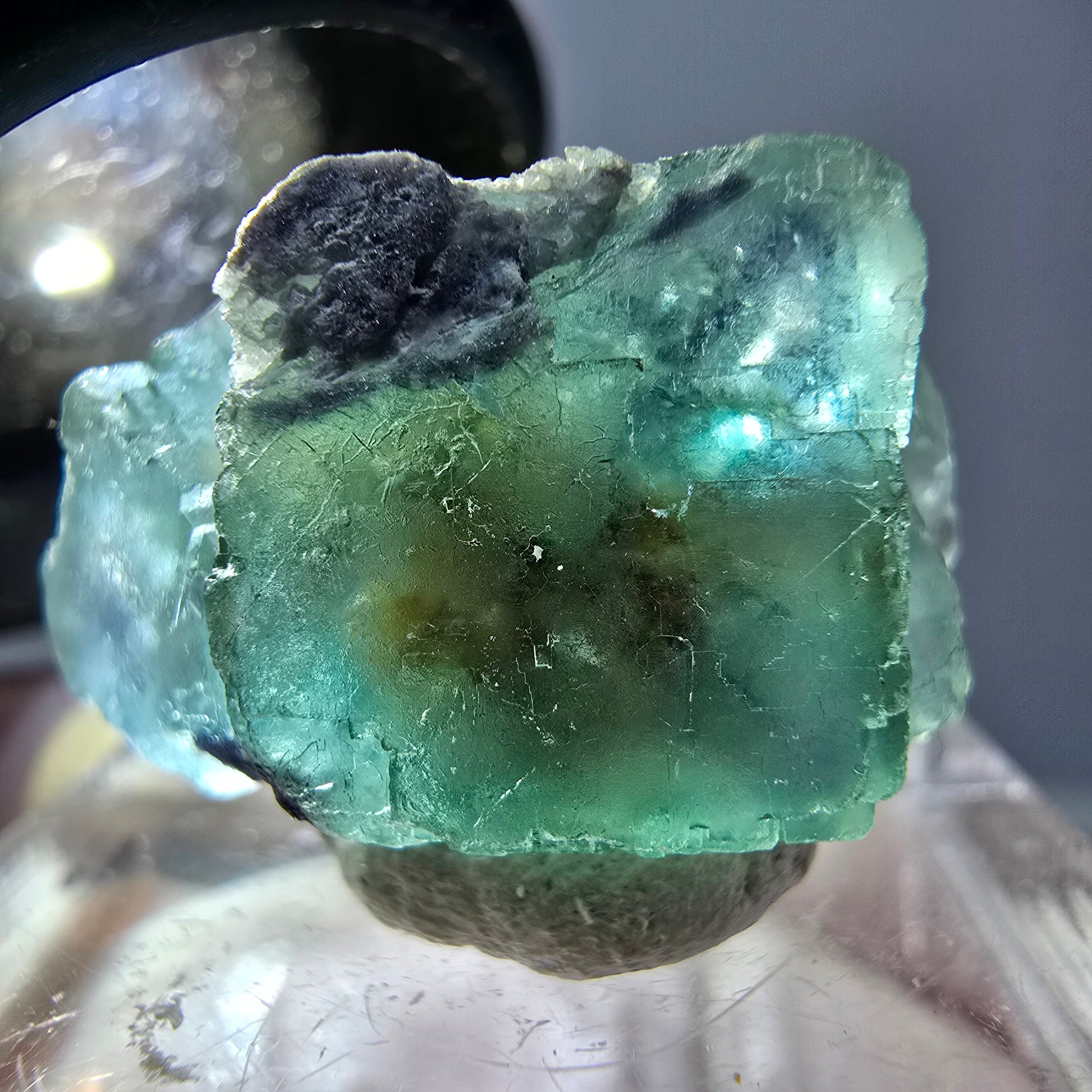 Entdecken Sie unseren seltenen grünen und lila transparenten Fluorit Würfel Stufe, der durch seine bemerkenswerten kubischen Kristalle und faszinierenden Phantome im Inneren besticht. Dieser einzigartige Mineralfund hat seinen Ursprung in Okorusu, Namibia, und überzeugt sowohl Sammler als auch Liebhaber von Kristallen.