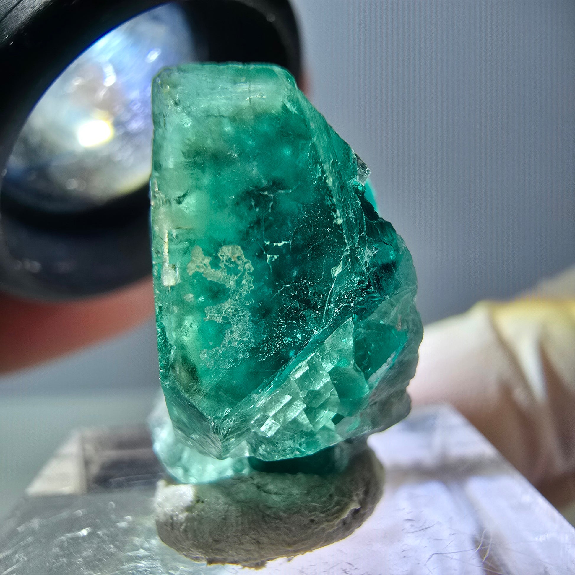 Die Maße dieses beeindruckenden Stücks betragen 21mm x 21mm x 13mm bei einem Gewicht von 8g. Gefunden wurde dieser wunderschöne Fluorit in Okorusu, Namibia, einem bekannten Standort für qualitativ hochwertige Mineralien.