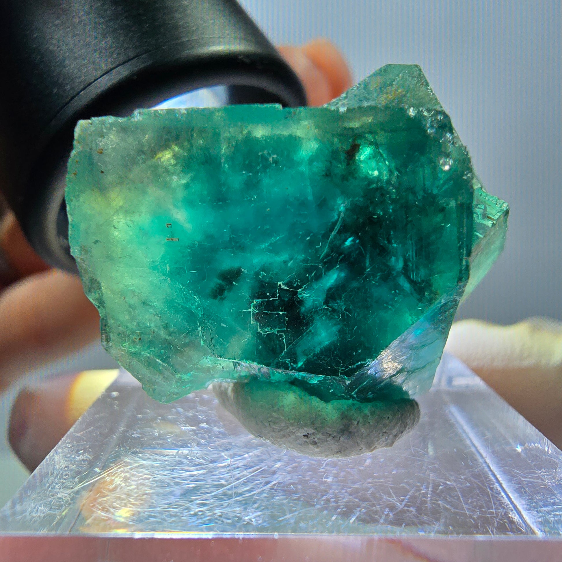Die teilweise parkettierte Oberfläche verleiht dieser Fluorit-Stufe zusätzlich einen besonderen Charme, der sie nicht nur zu einem großartigen Blickfang macht, sondern auch ideal für Sammler und Mineralienliebhaber ist. Diese Stufe hat die Maße von 30 x 22 x 20 mm und wiegt 16 g. Der Fundort dieser exklusiven Mineralien ist Okorusu, Namibia, einem renommierten Ort für beeindruckende Kristallfunde.