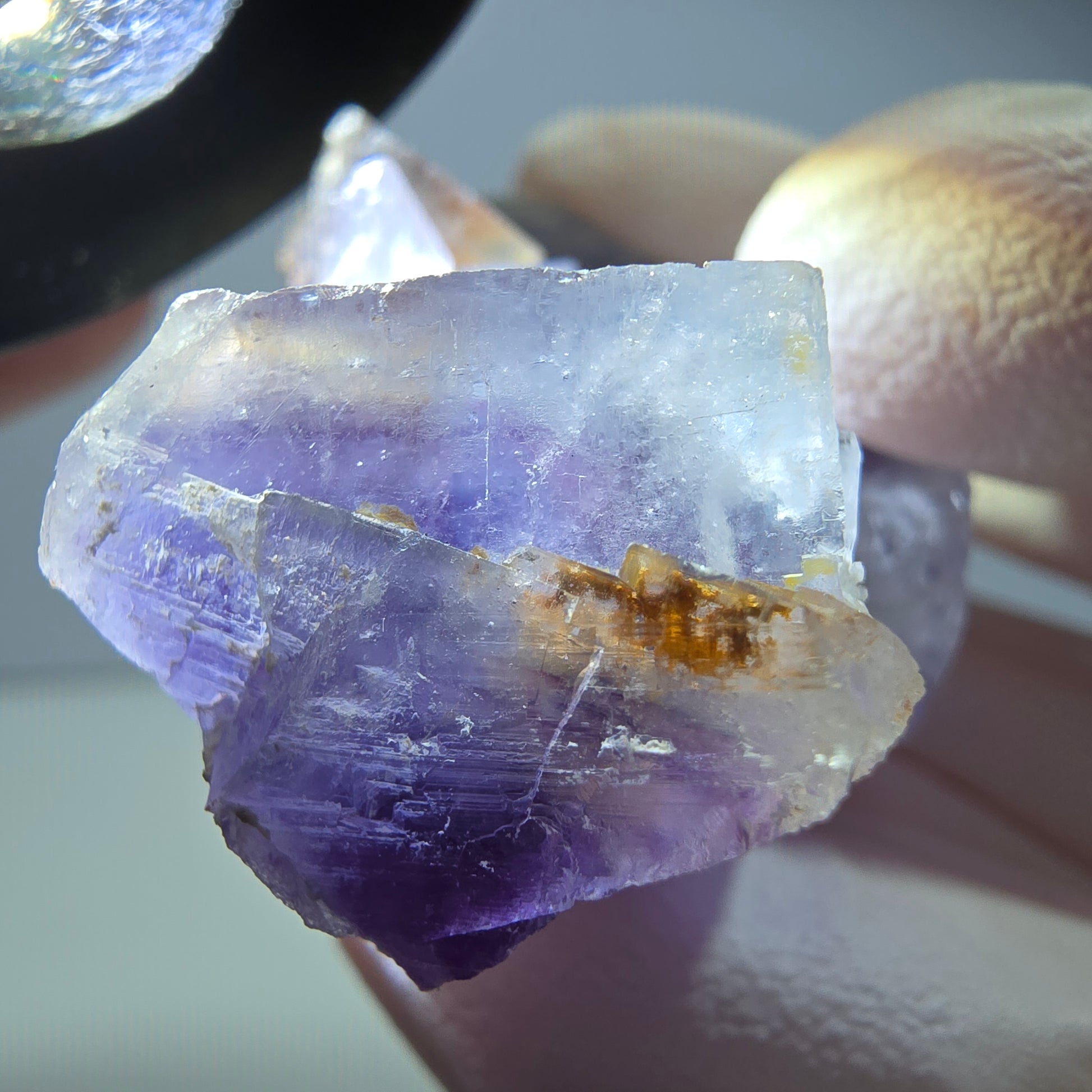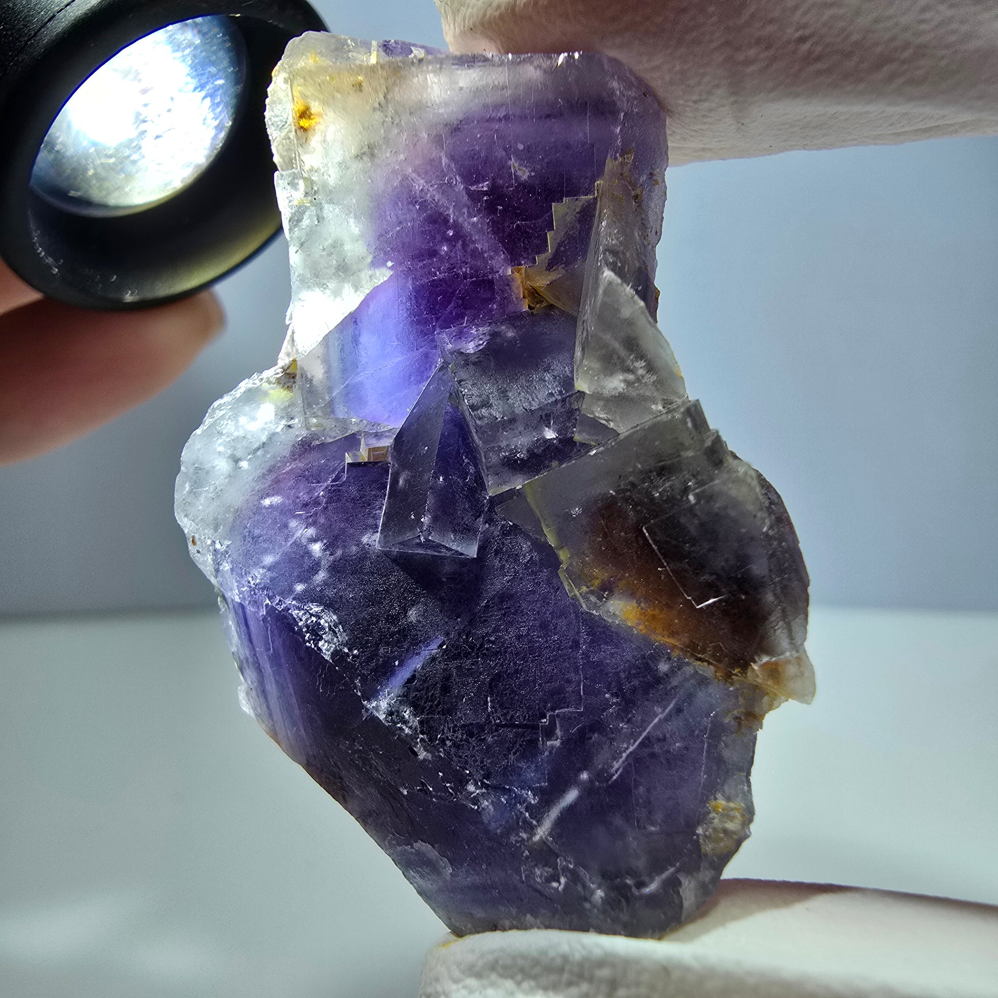 Entdecken Sie diesen außergewöhnlichen Phantom Fluorit in seiner einzigartigen lila und weißen Farbgebung. Diese seltene, transparente Fluorit Würfel Stufe beeindruckt mit wunderschönen kubischen Kristallen, die faszinierende Phantome im Inneren beherbergen. Die Kombination aus lila und weiß verleiht diesem Stück eine besondere Anziehungskraft und macht es zu einem herausragenden Sammlerstück oder einem eleganten Dekorationsobjekt.