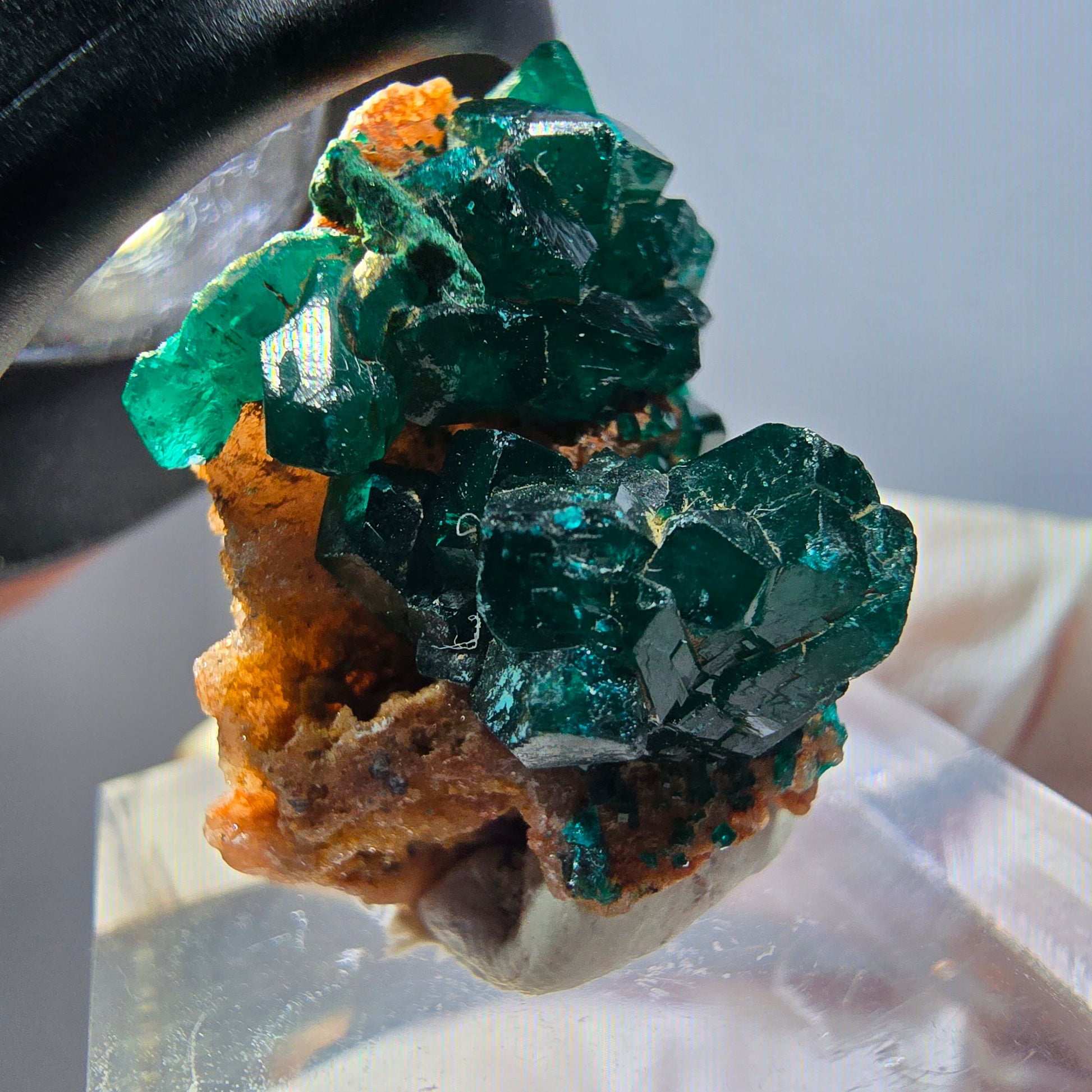 Seltene Dioptas auf Matrix Stufe aus der Republik Kongo. Die ausgeprägten, dunkelgrünen bis türkisen, kantig gewachsenen Kristalle thront auf einer schönen rot-braunen Matrix.