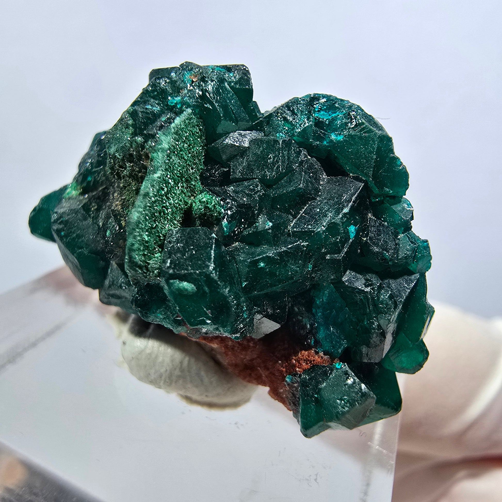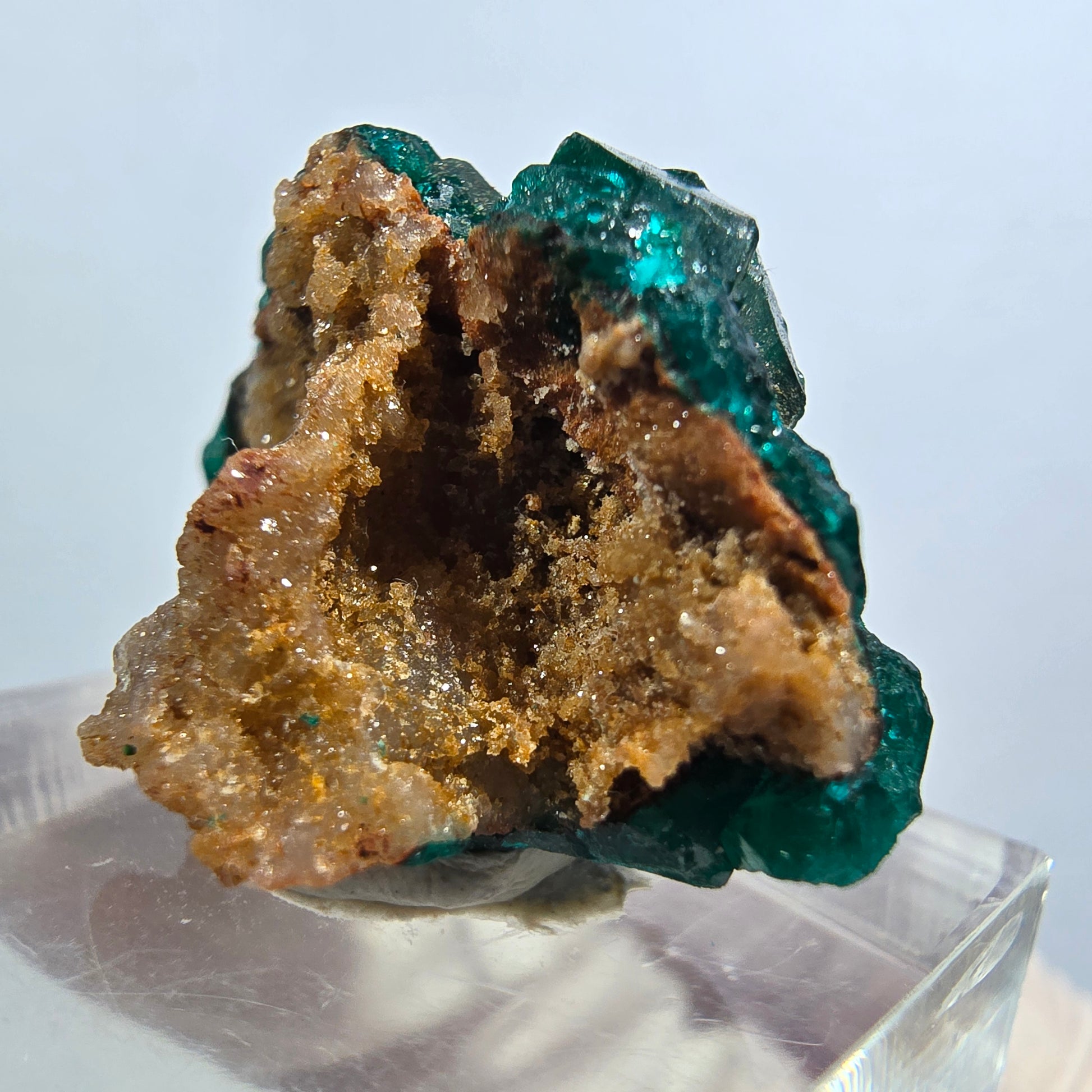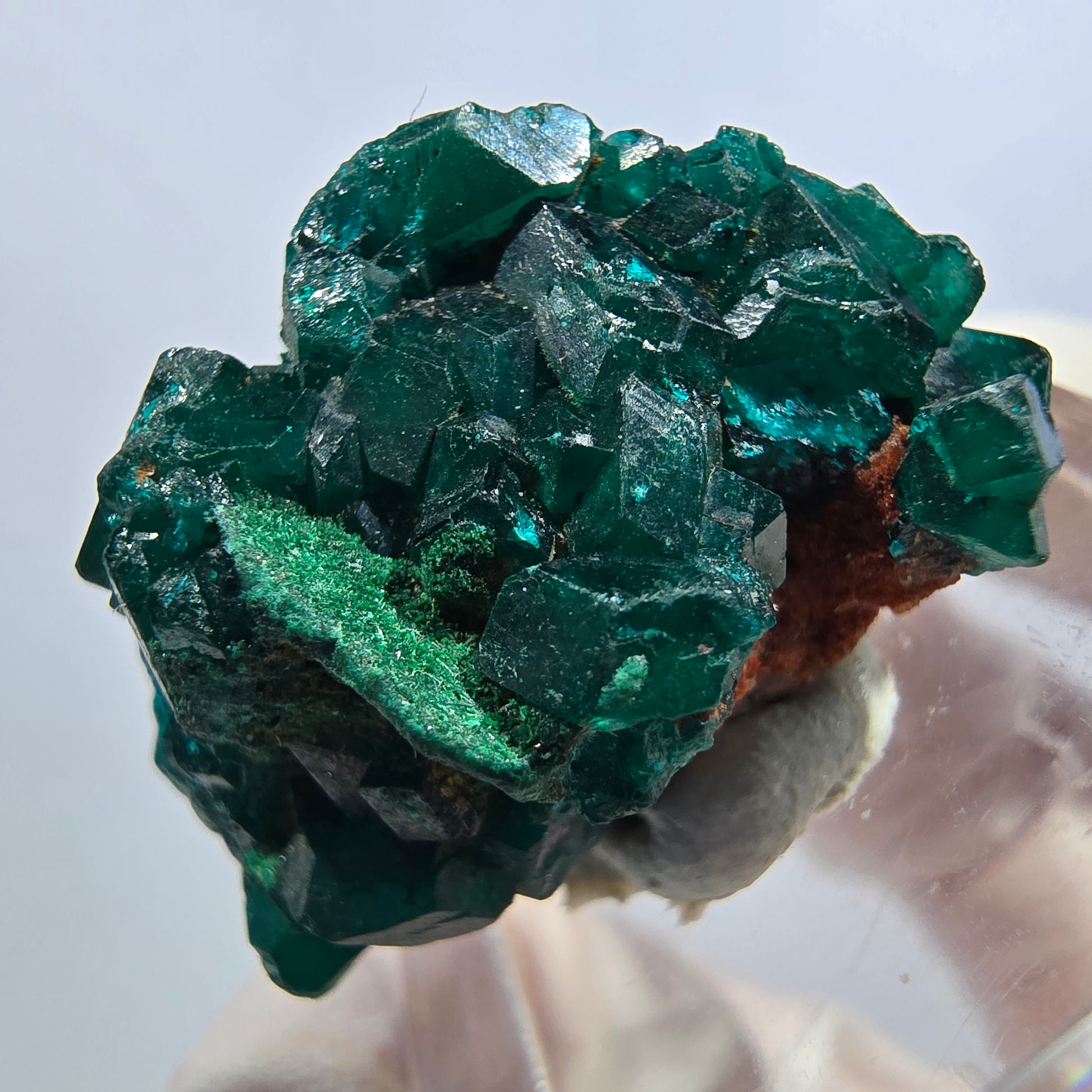 Seltene Dioptas auf Matrix-Stufe aus der Republik Kongo. Die ausgeprägten, dunkelgrünen bis türkisen, kantig gewachsenen Kristalle thront auf einer schönen rot-braunen Matrix.