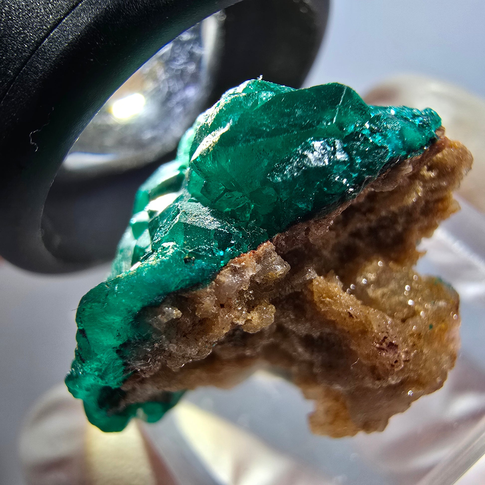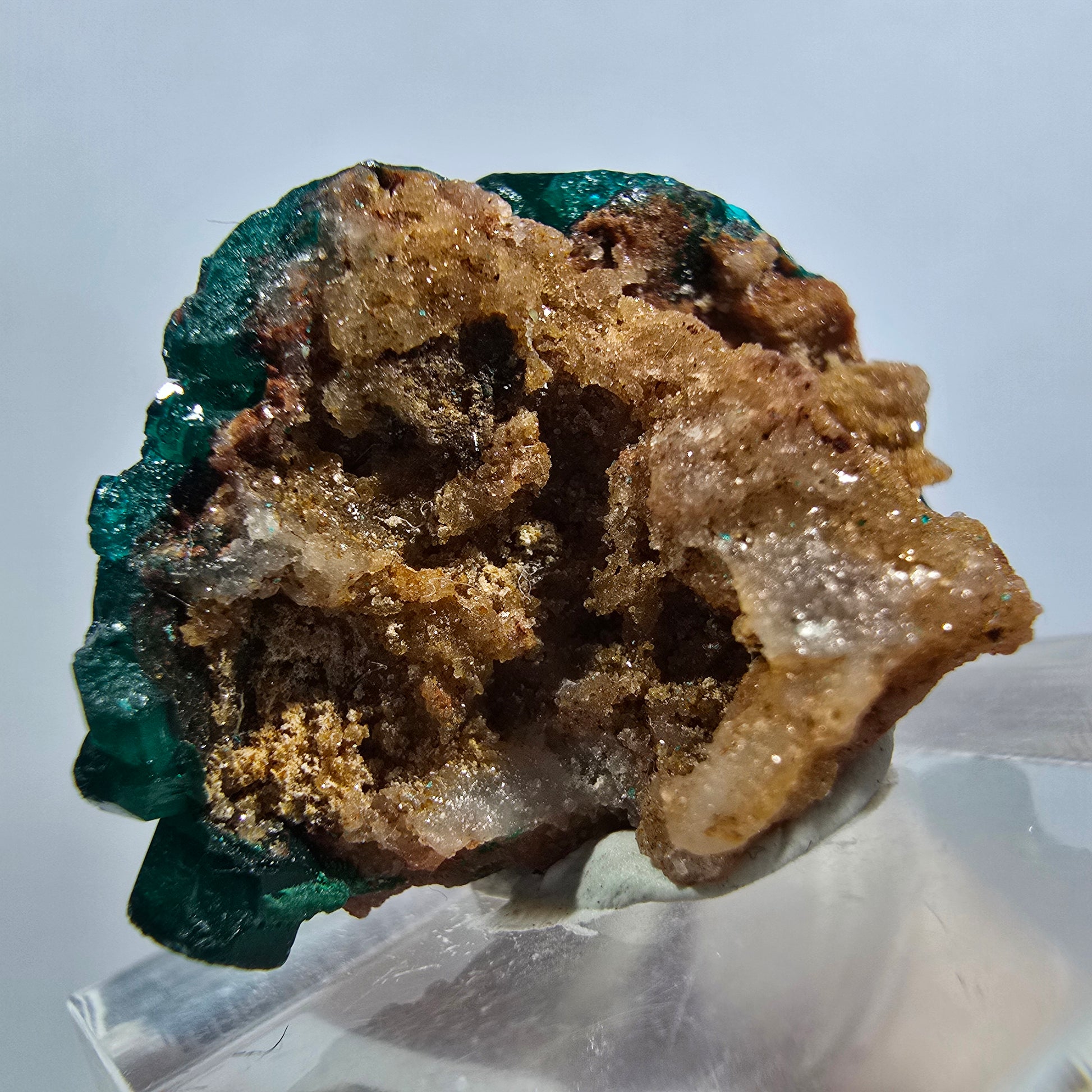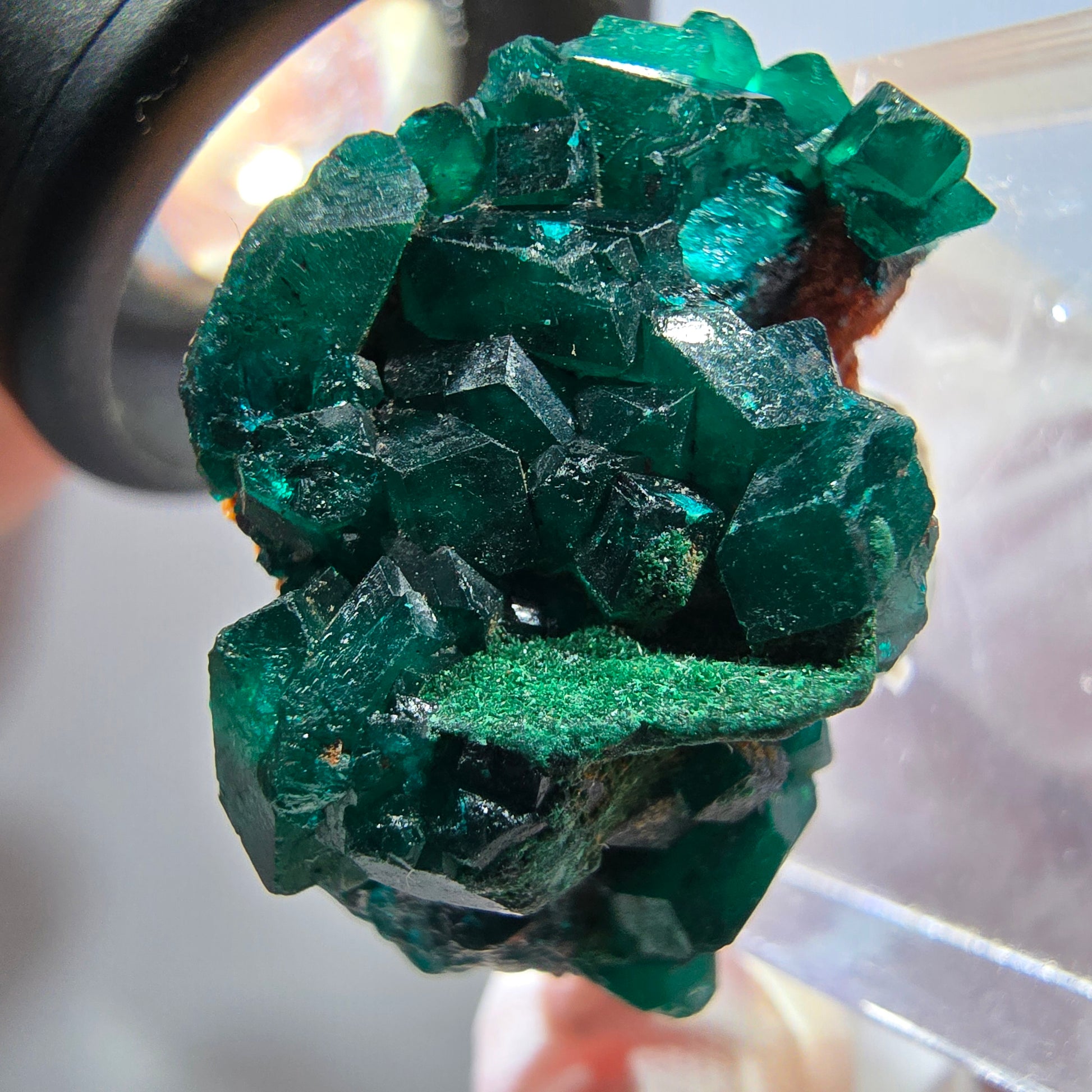 Seltene Dioptas auf Matrix-Stufe aus der Republik Kongo. Die ausgeprägten, dunkelgrünen bis türkisen, kantig gewachsenen Kristalle thront auf einer schönen rot-braunen Matrix.