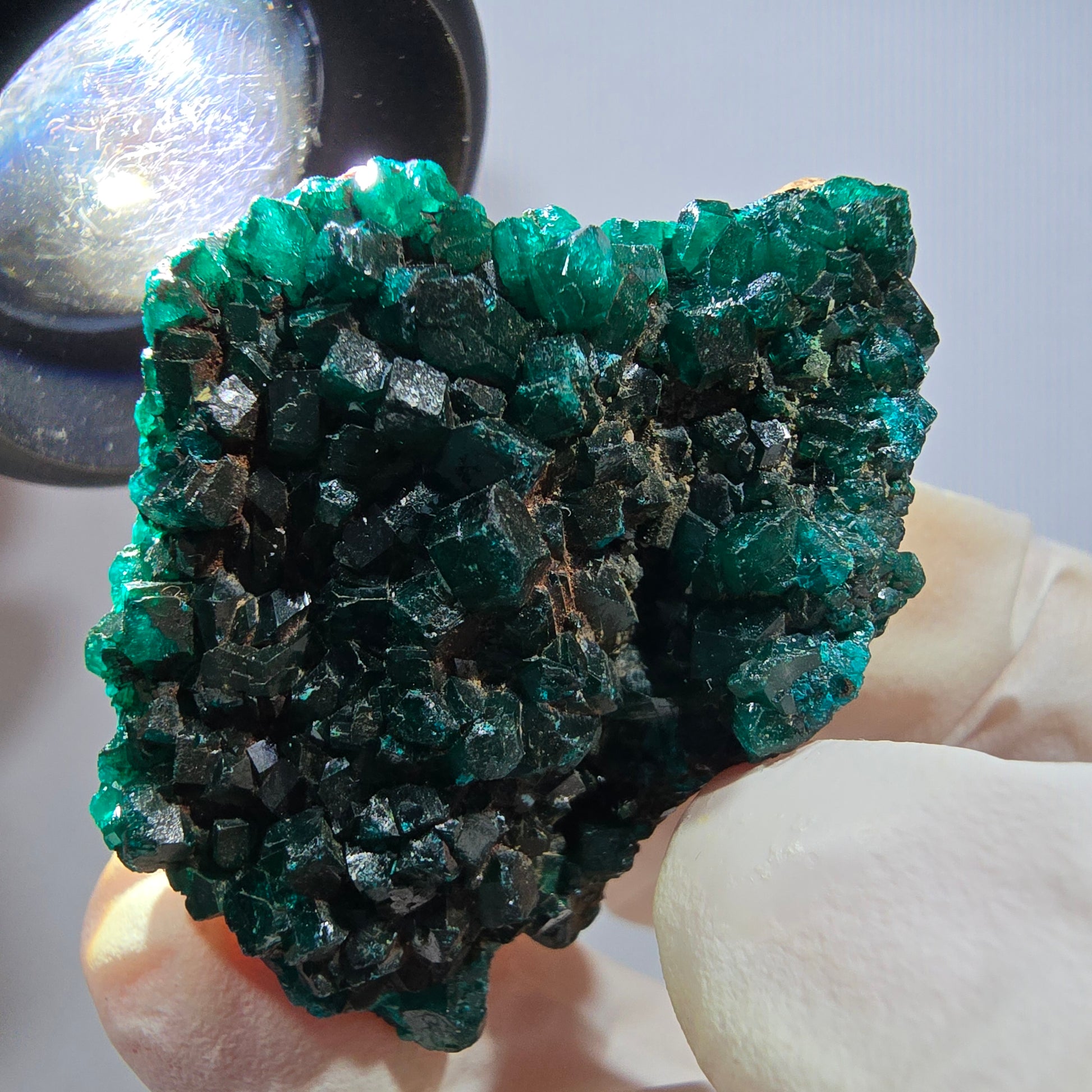 Seltene Dioptas auf Matrixstufe aus der Republik Kongo. Die dunkelgrünen, türkisen, kantig gewachsenen Kristalle prägen diese hochwertige Stufe auf schöner rot-brauner Matrix.