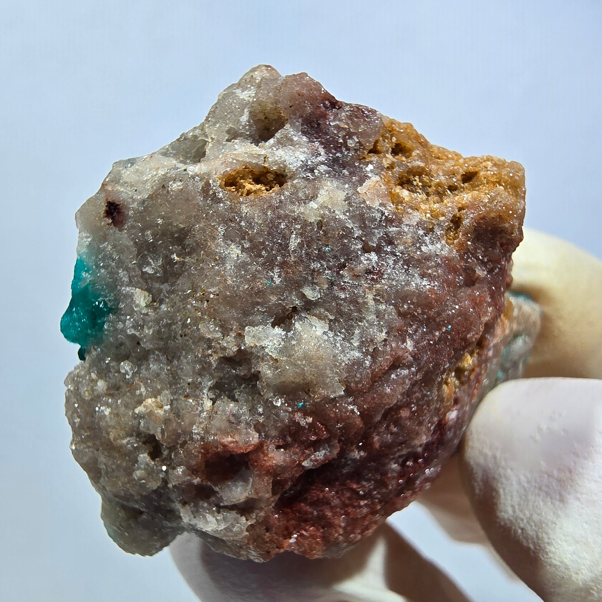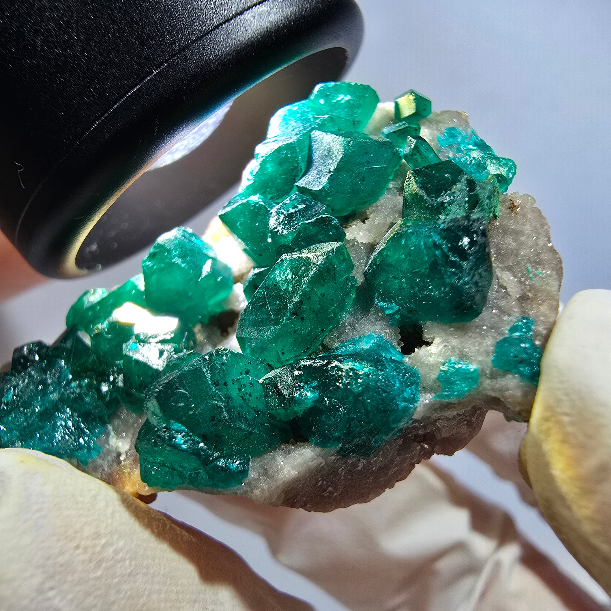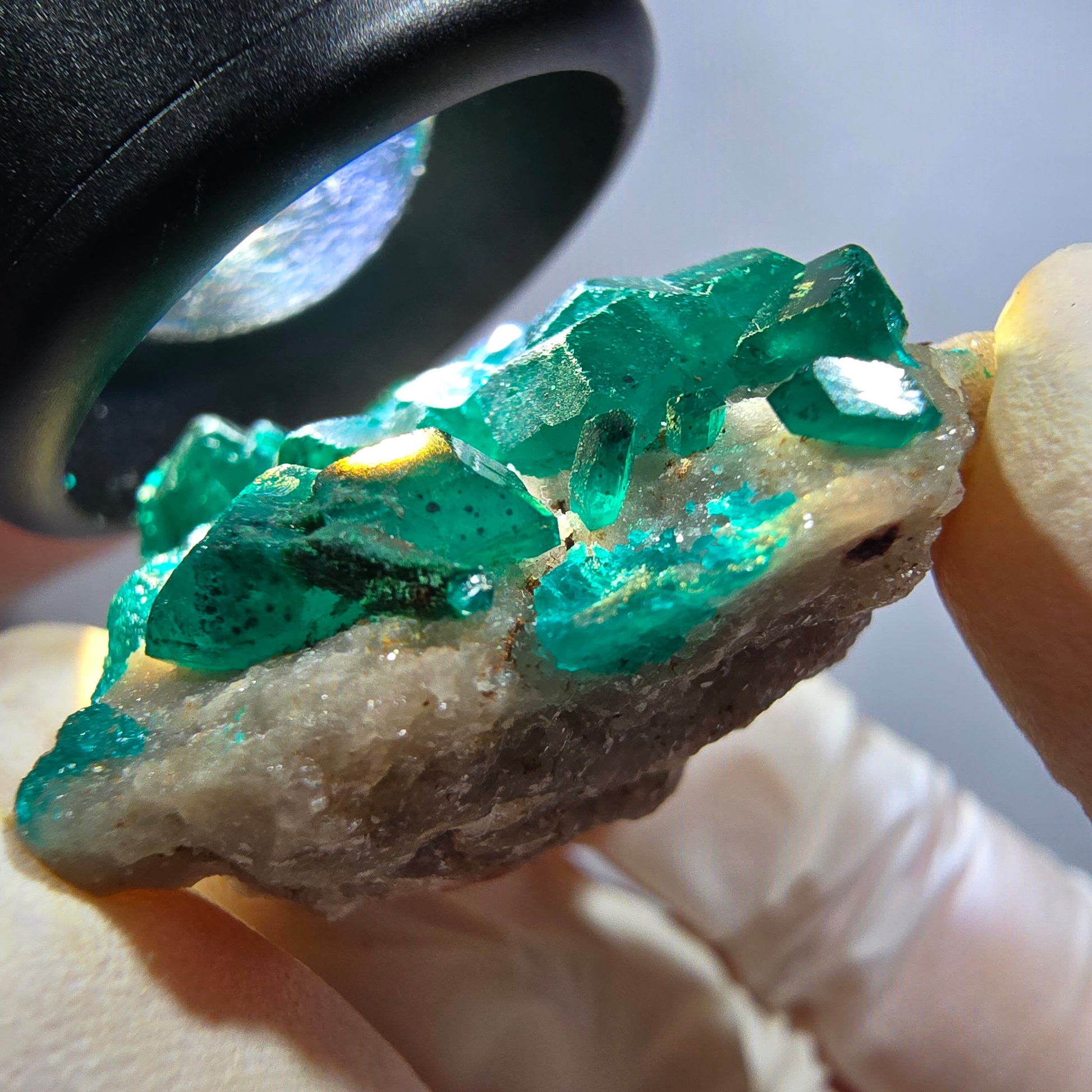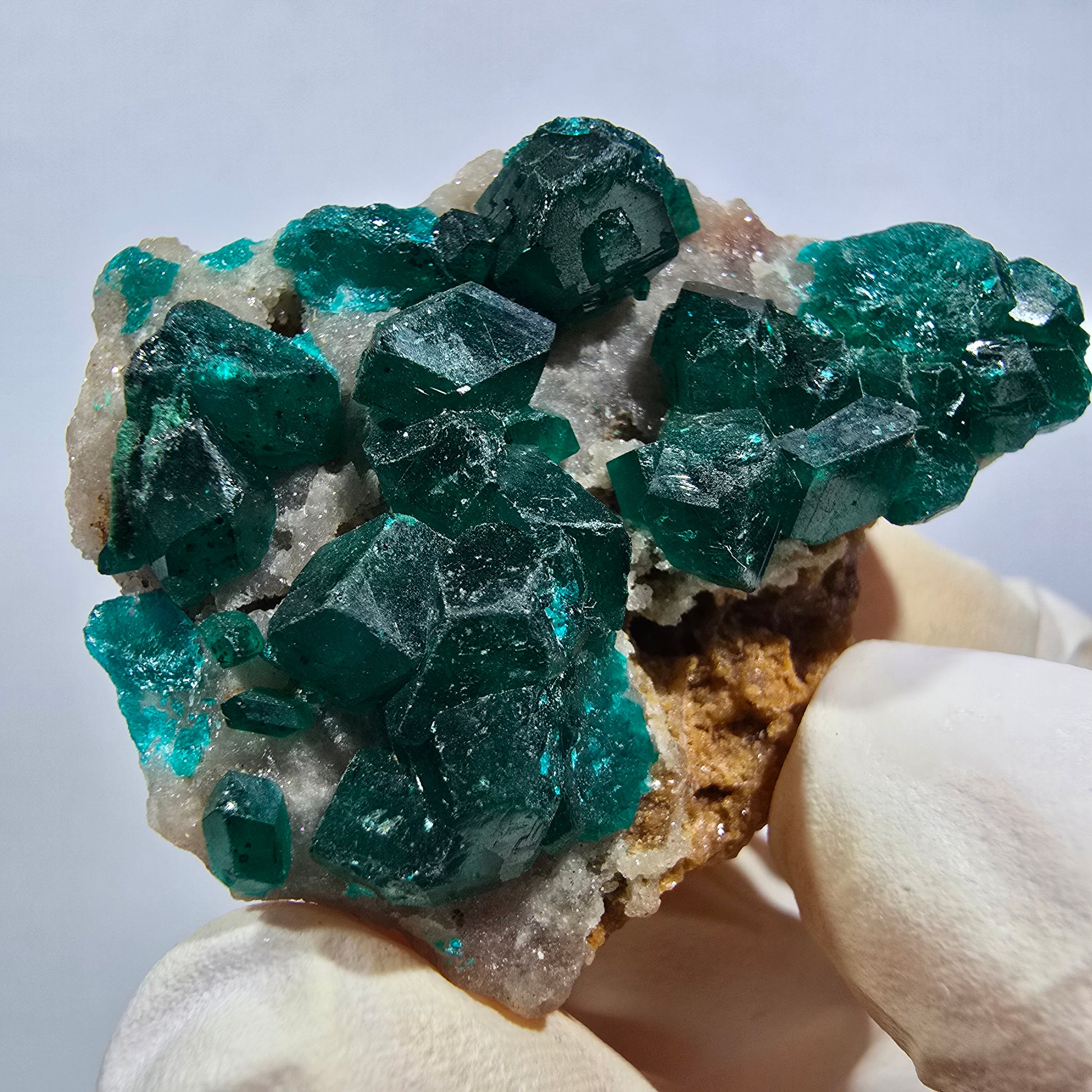 Seltene Dioptas auf Matrix Stufe aus der Republik Kongo – eine beeindruckende Mineralienstufe mit ausgeprägten, dunkelgrünen bis türkisen, kantig gewachsenen Kristallen auf rot-brauner Matrix. Maße 40x31x18 mm, Gewicht 18 g. Die Kristalle zeigen eine außergewöhnliche Qualität und kantenscharfe Struktur.