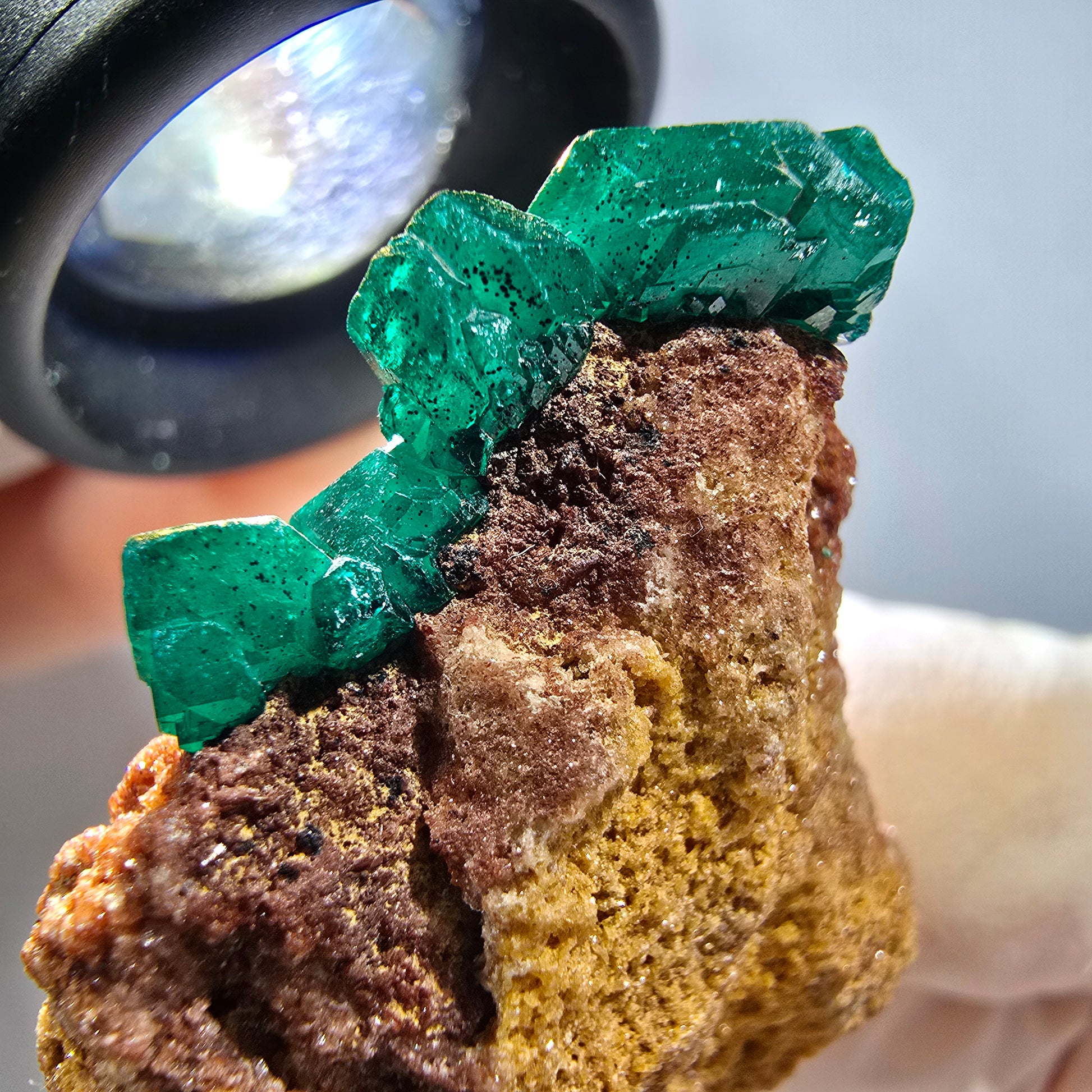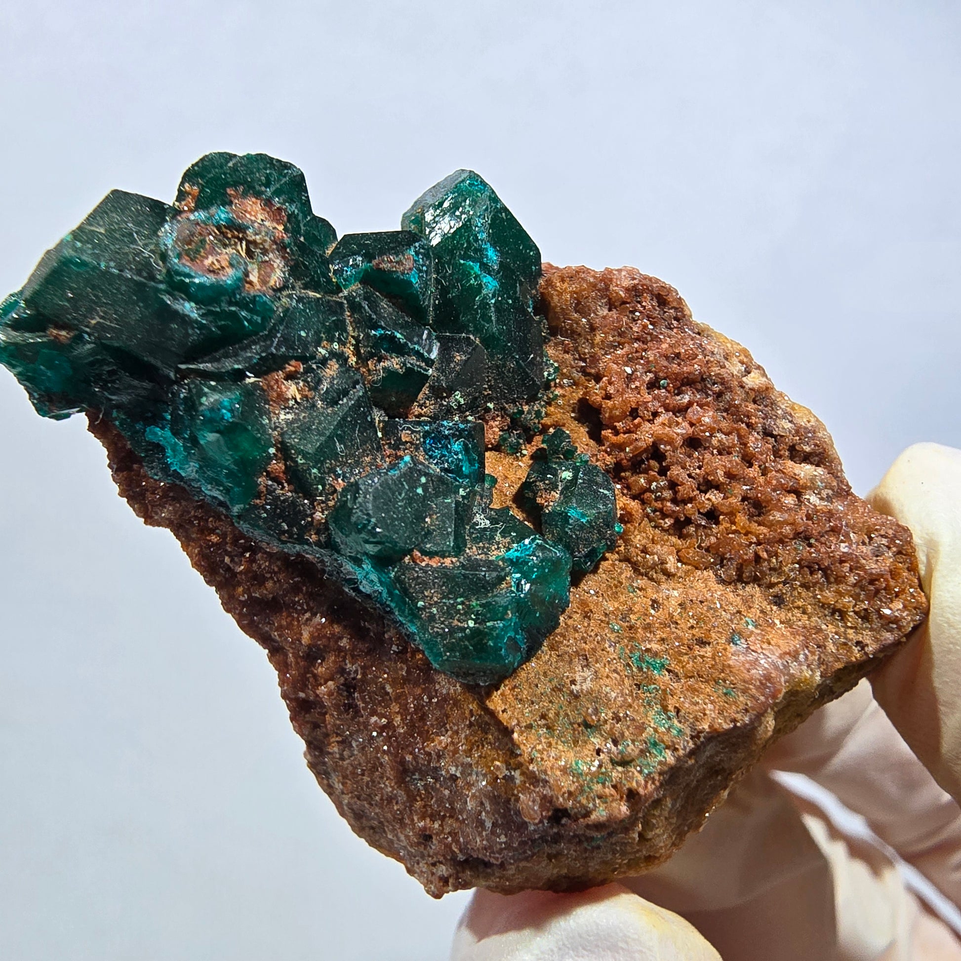 Seltene Dioptas-Stufe aus der Demokratischen Republik Kongo mit ausgeprägten, dunkelgrünen bis türkisen Kristallen auf einer charakteristischen rotbraun gefärbten Matrix. Dioptas ist ein begehrtes Kupfer-Silikat-Mineral mit intensiver smaragdgrüner Färbung, weshalb es auch als „Kupfersmaragd" bekannt ist. Diese feine Mineralienstufe besticht durch kantig gewachsene, glasglänzende Kristalle von hoher Klarheit und Farbtiefe – ein Highlight für jeden Mineraliensammler.