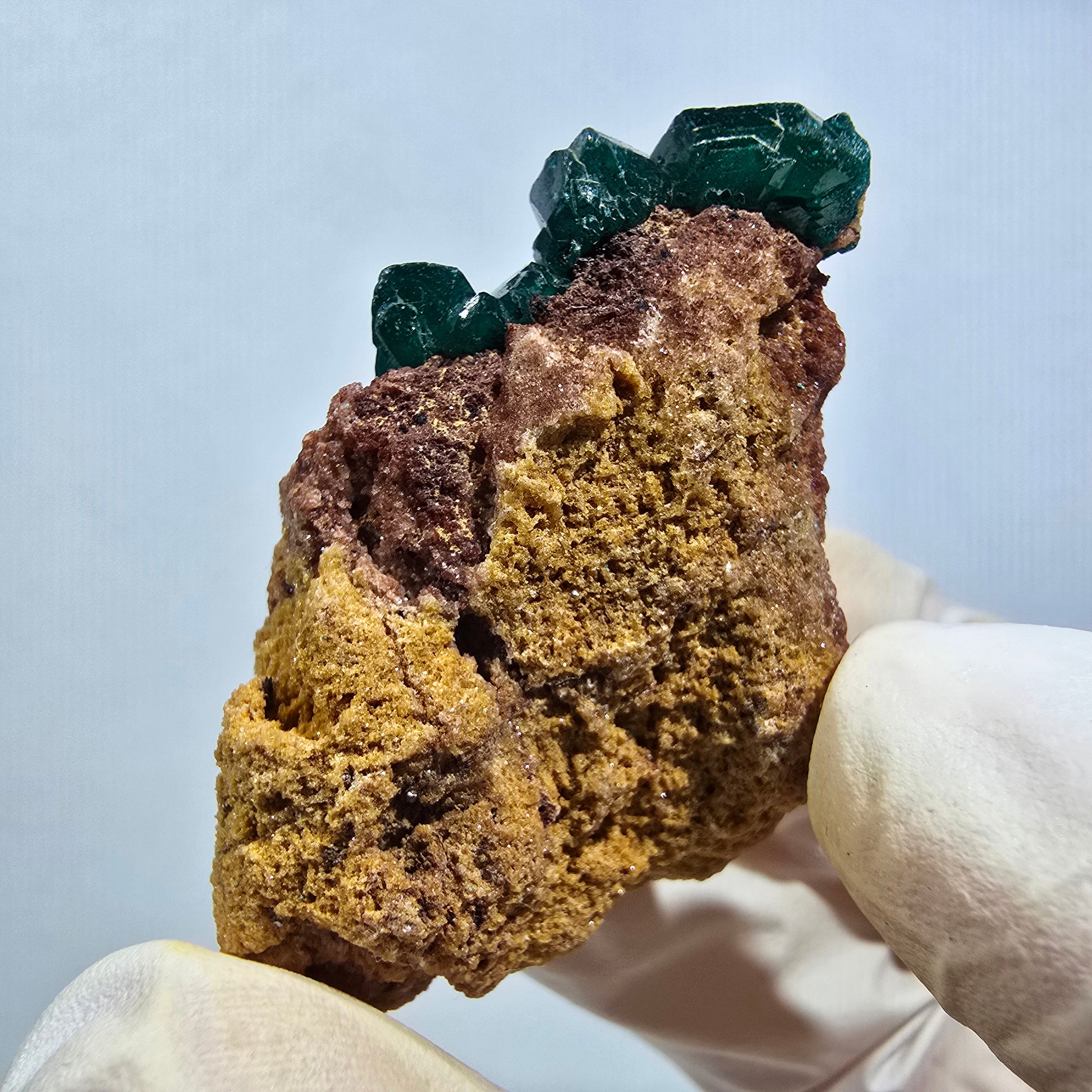 - Farbe: Dunkelgrün bis Türkis, Kristalle auf rotbrauner Matrix