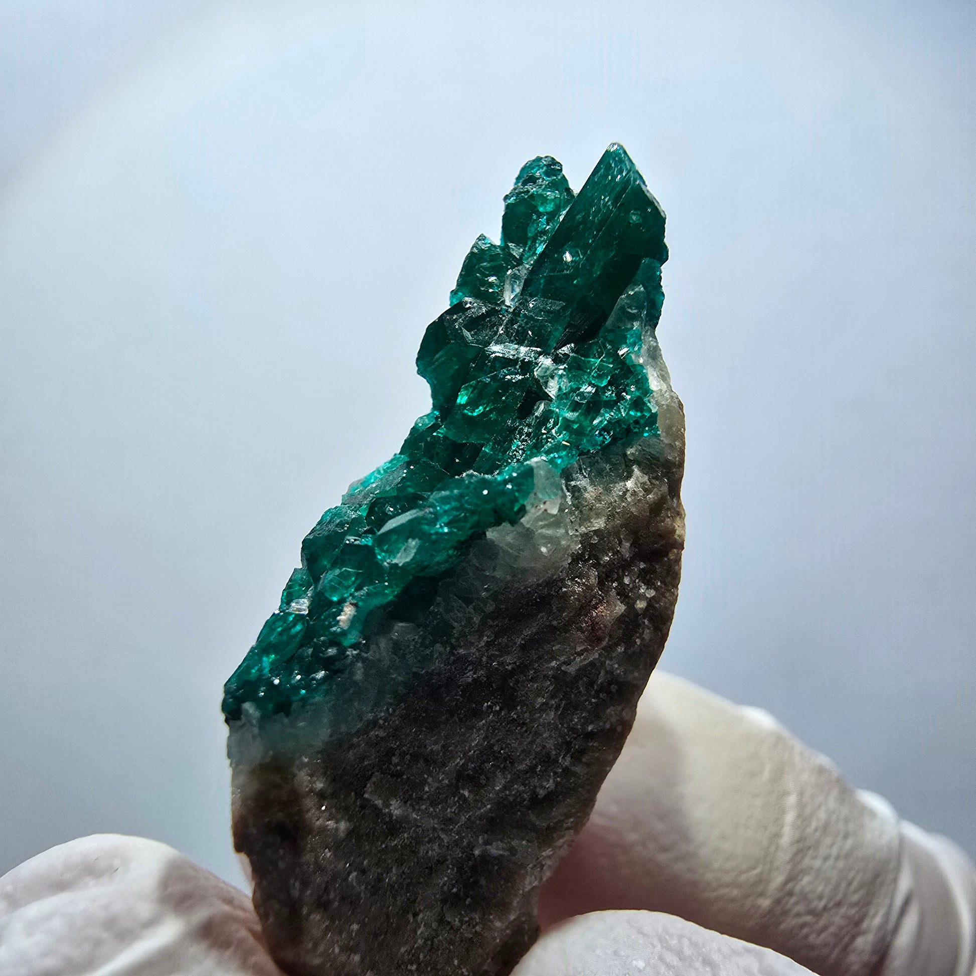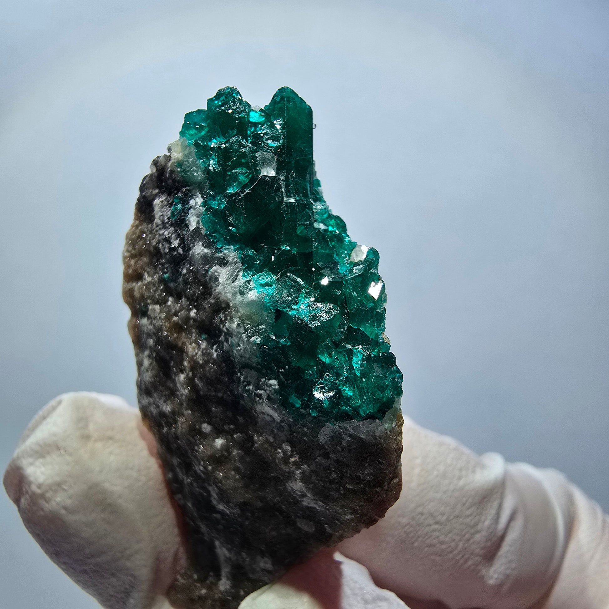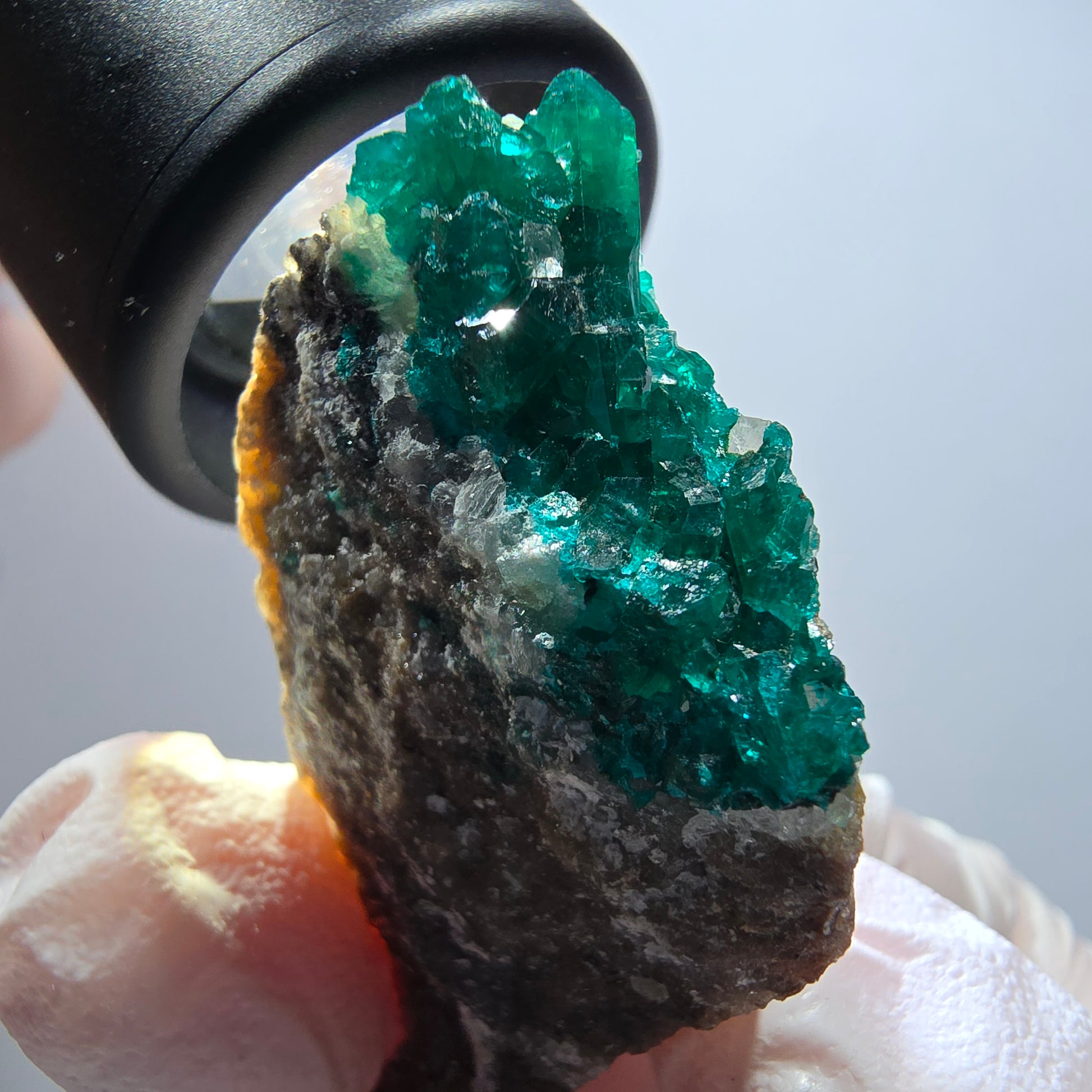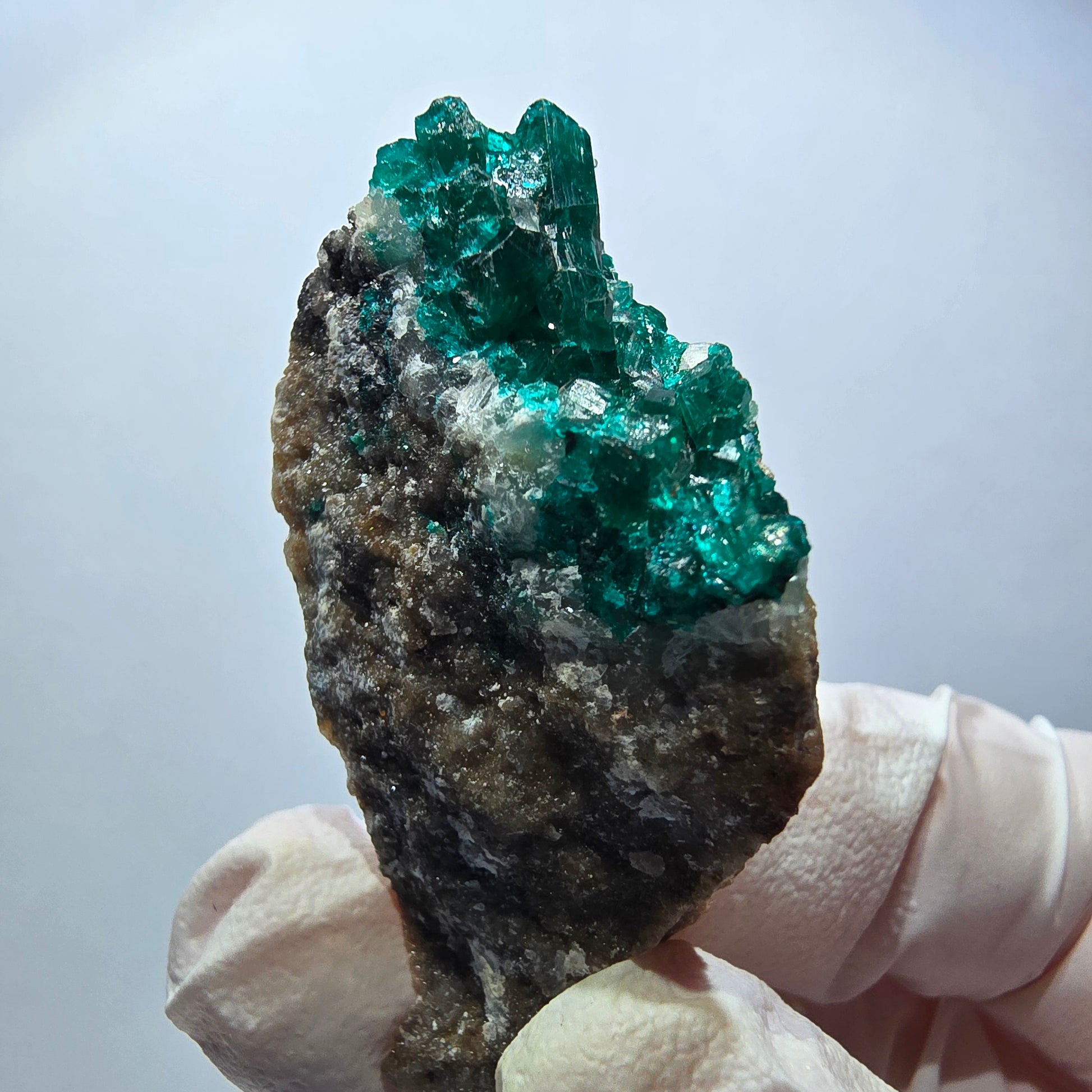 Seltene Dioptas auf Matrix Stufe aus der Republik Kongo. Die ausgeprägten, dunkelgrünen bis türkisen, kantig gewachsenen Kristalle zieren eine schöne grau-braune Matrix.