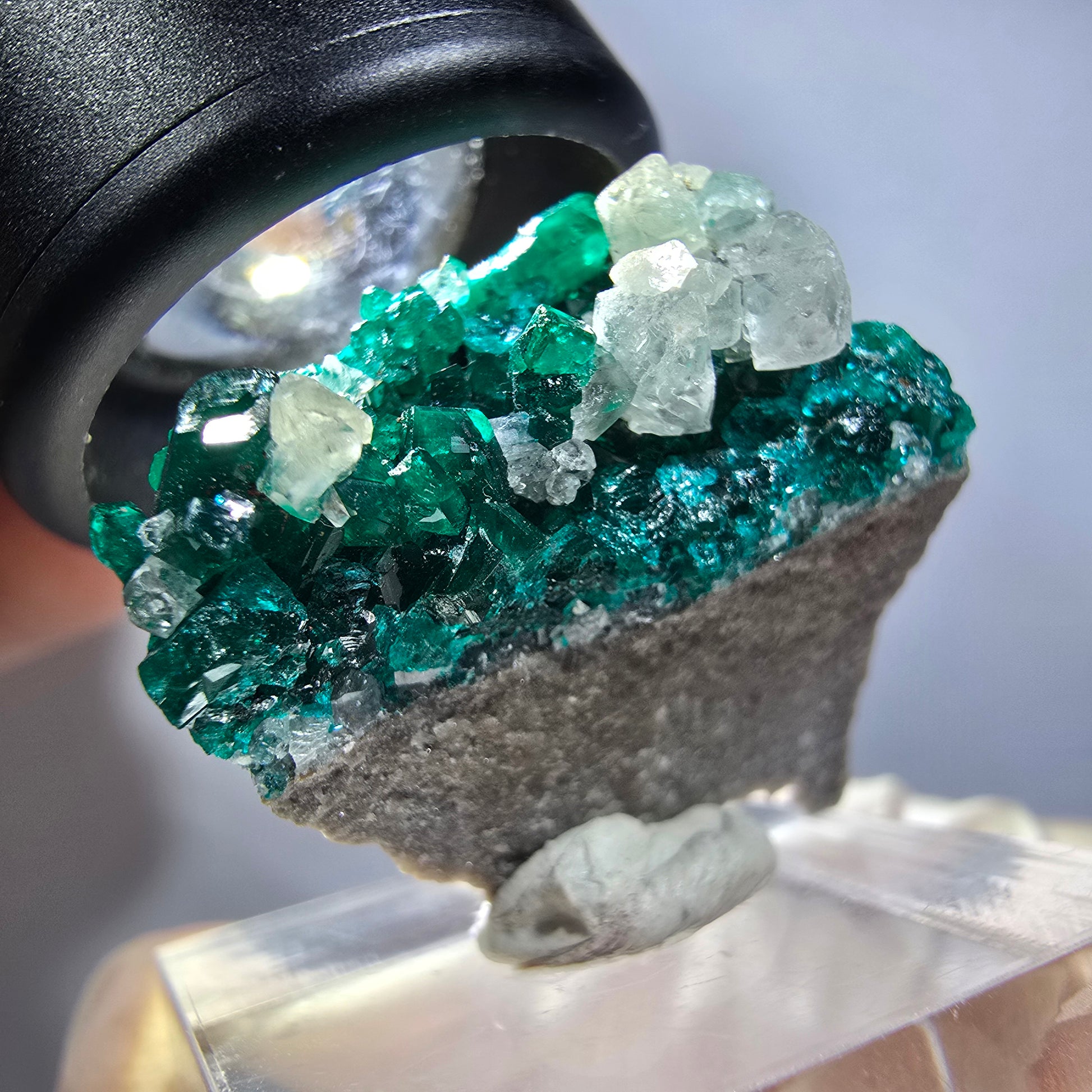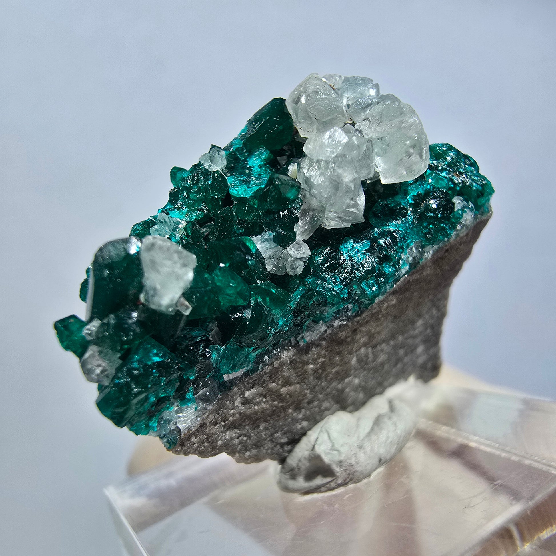 - Besonderheit: Dunkelgrüne, türkise, kantig gewachsene Dioptas-Kristalle mit weiß-transparentem Calcit
