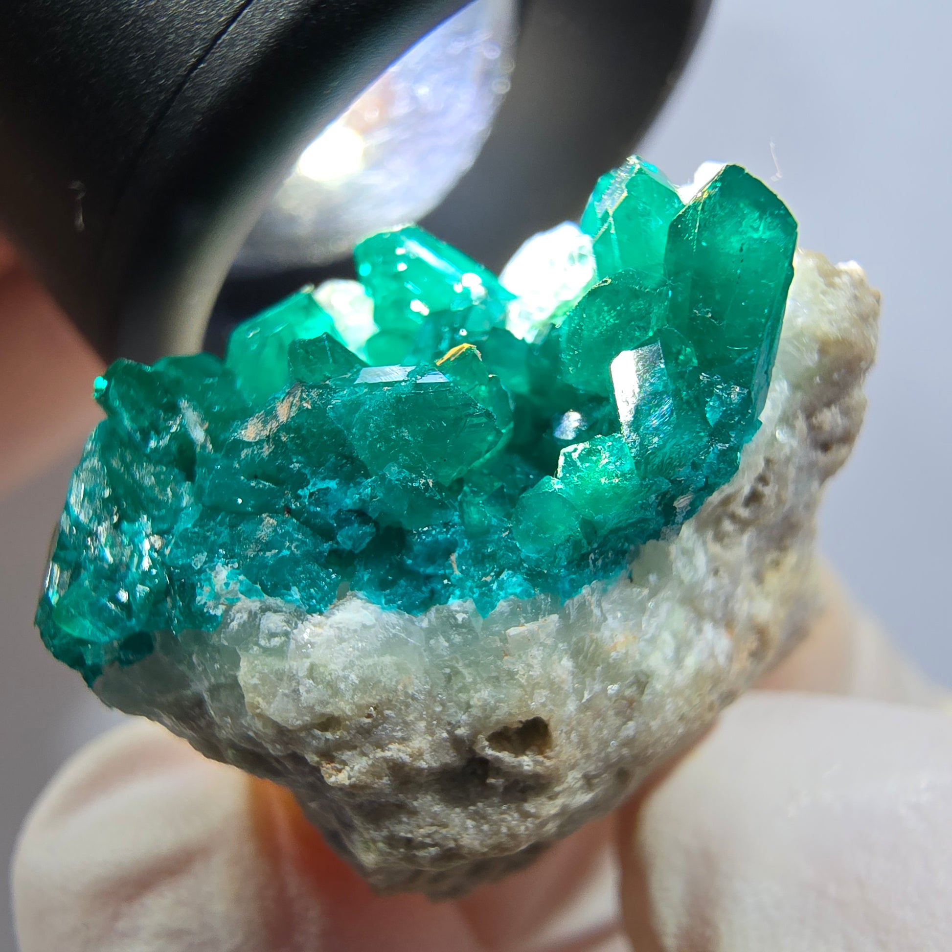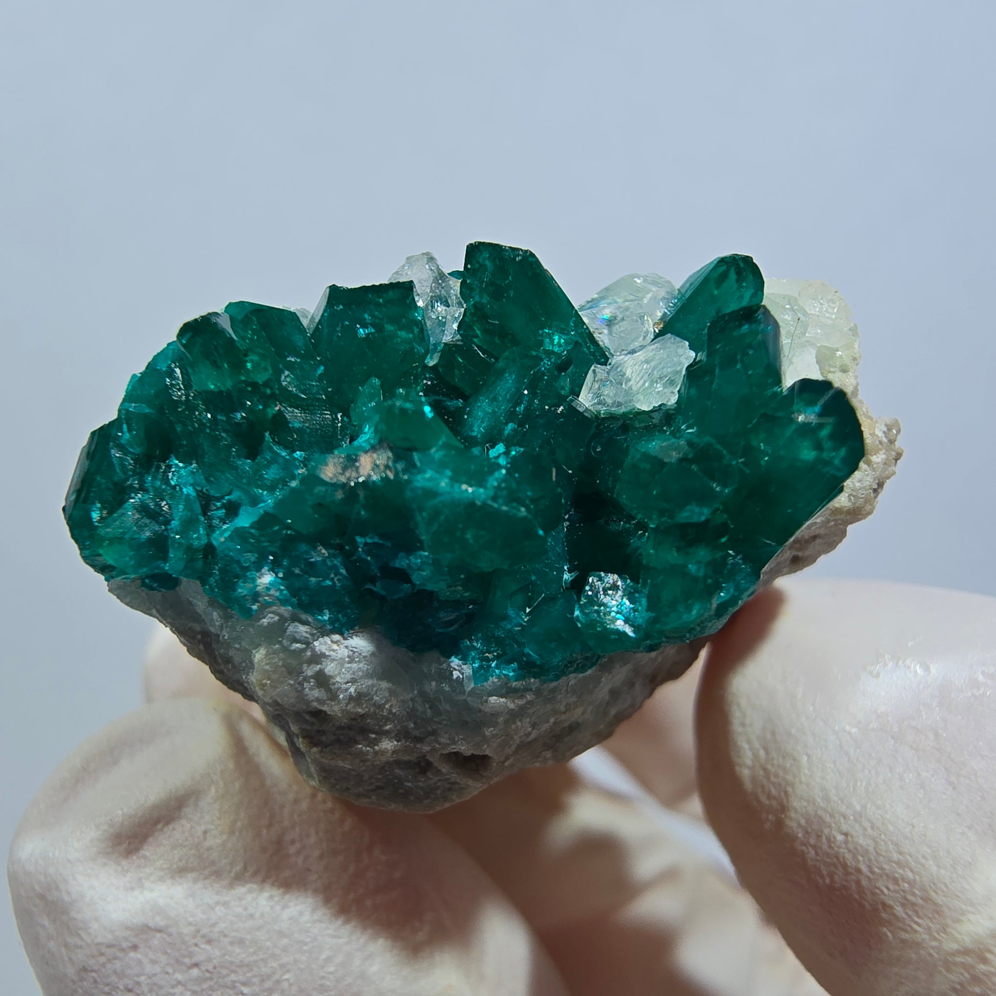 Seltene Dioptas XX auf Calcit Stufe aus der Republik Kongo. Diese außergewöhnliche Mineralienstufe präsentiert ausgeprägte, dunkelgrüne bis türkise, kantig gewachsene Dioptas-Kristalle neben weiß-transparenten Calcit-Kristallen. Mit Maßen von 33x26x15 mm und einem Gewicht von 13 g ist sie ein Highlight für Sammler.