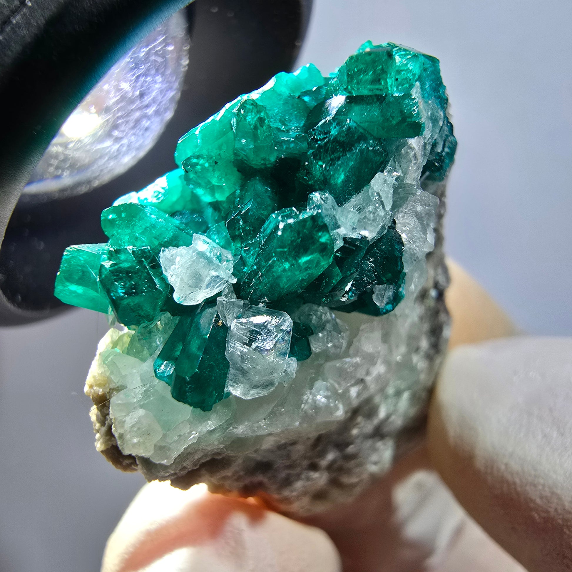 - Besonderheit: Seltene Stufe mit dunkelgrünen/türkisen, kantigen Dioptas-Kristallen und weiß-transparentem Calcit