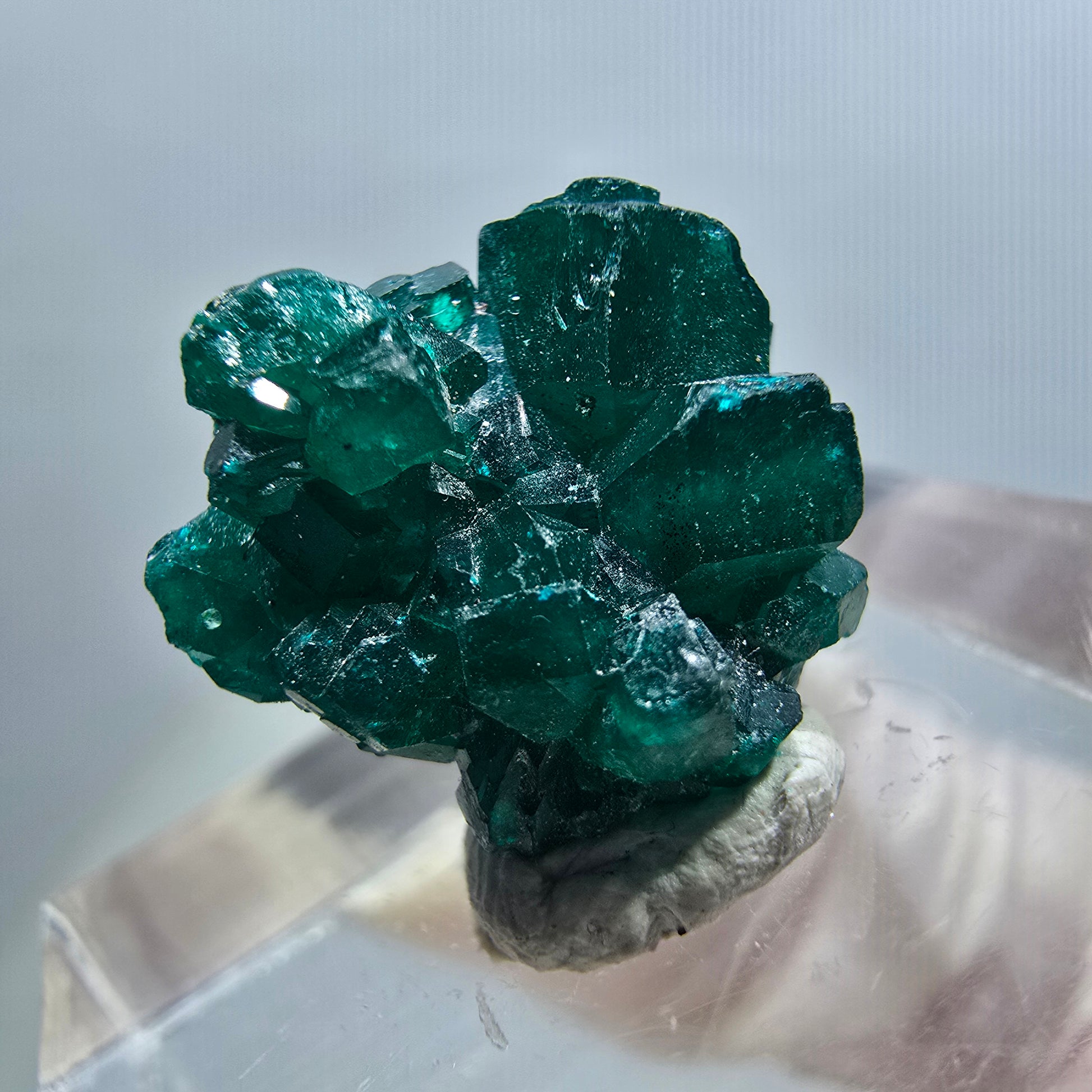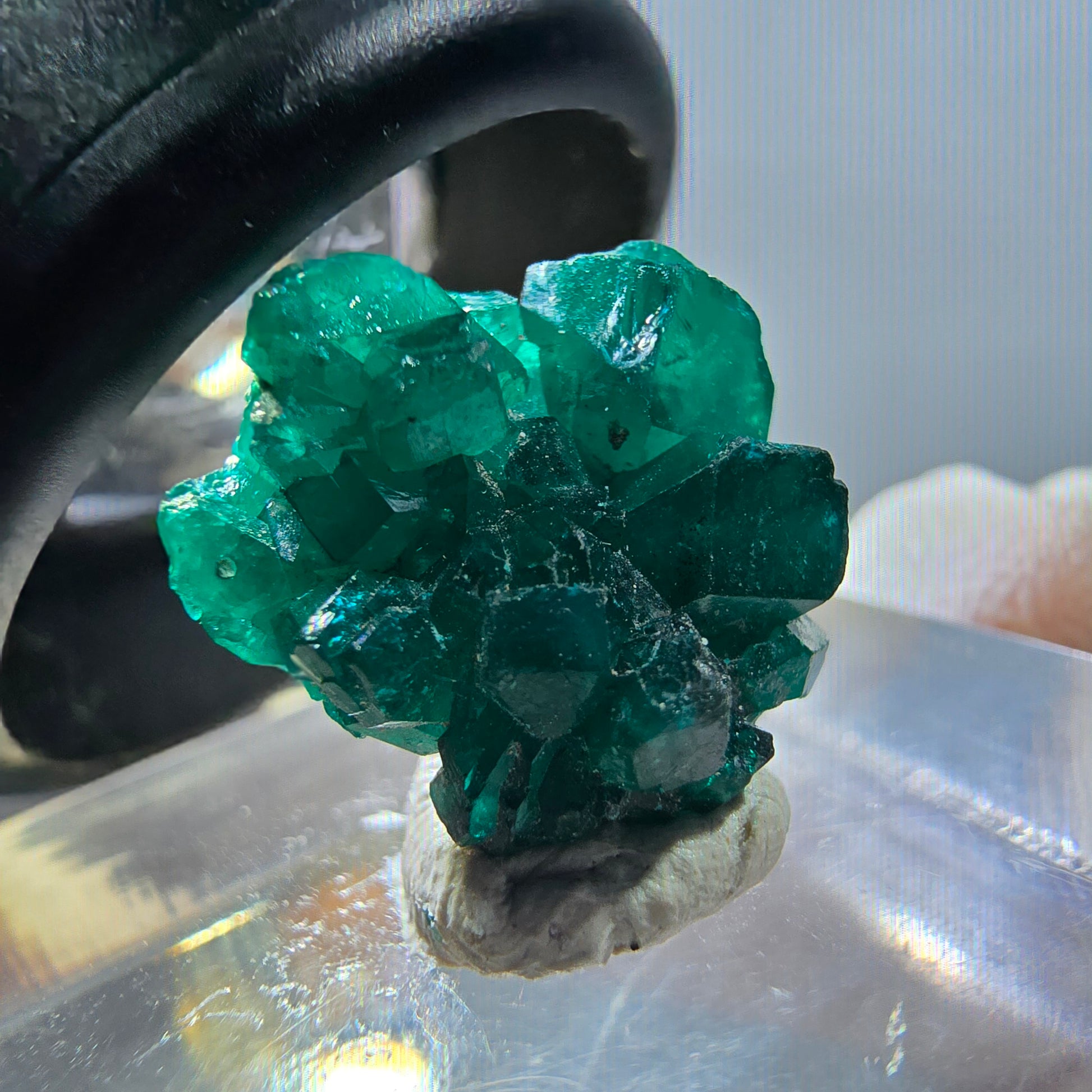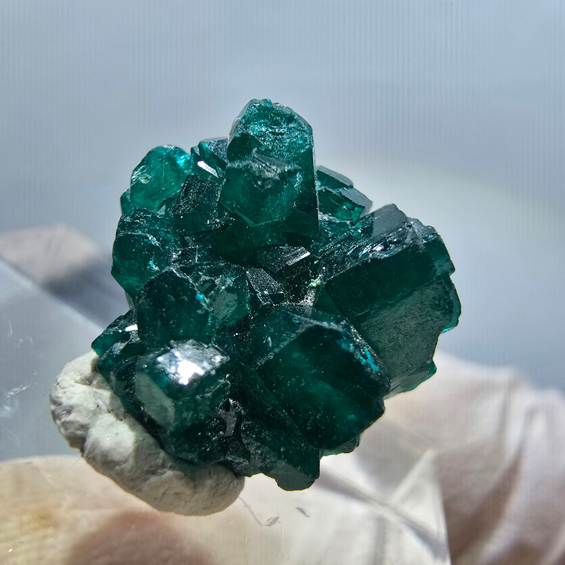 Entdecken Sie diese seltene Dioptas-XX-Stufe aus der Republik Kongo mit ausgeprägten, dunkelgrünen bis türkisen, kantig gewachsenen Kristallen.