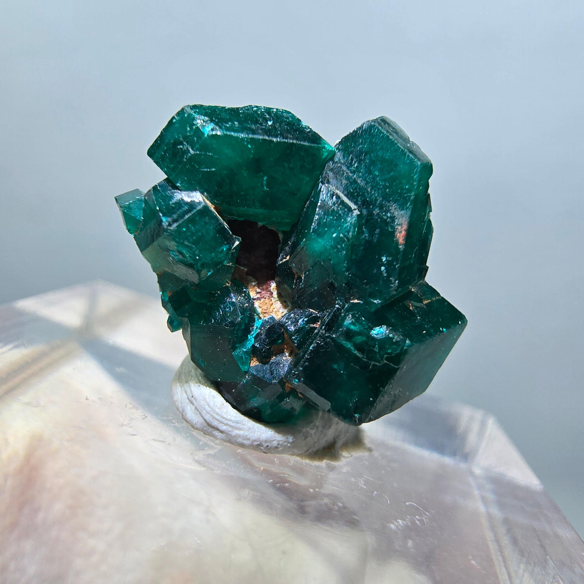Das Mineral zeichnet sich durch seinen glasartigen Glanz und die intensive grüne Färbung aus, die durch den hohen Kupfergehalt entsteht. Mit einer Mohshärte von 5 ist Dioptas deutlich weicher als Smaragd und daher hauptsächlich als Sammelobjekt geeignet. Die perfekte Spaltbarkeit und prismatischen Kristallstrukturen machen jedes Exemplar zu einem geologischen Unikat.