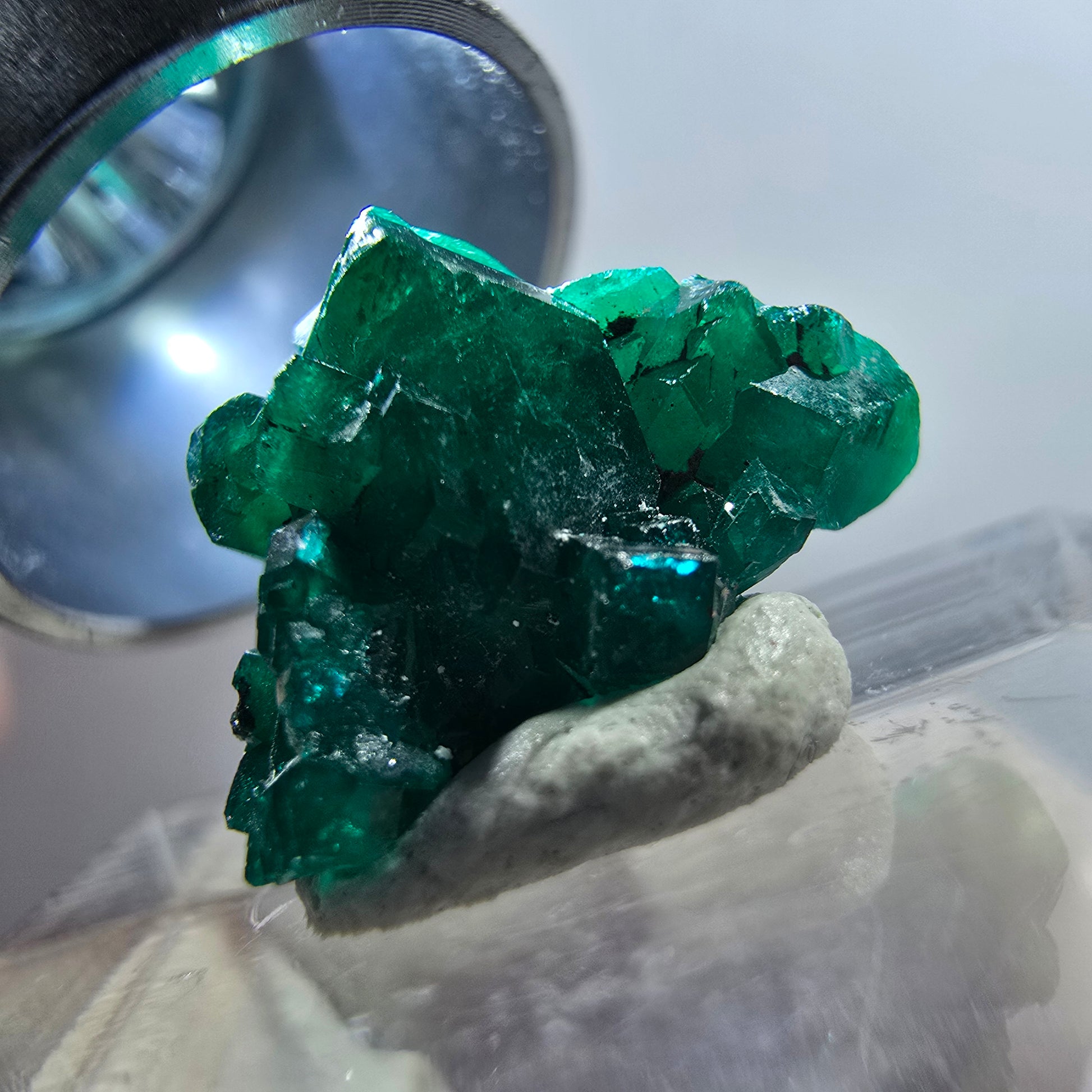 Entdecken Sie diese seltene Dioptas-XX-Stufe aus der Republik Kongo mit ihren ausgeprägten, dunkelgrünen bis türkisen, kantig gewachsenen Kristallen. Die Miniaturstufe misst 16x12x6 mm und wiegt 1,36 g – ein Highlight für Mineraliensammler. Perfekte Qualität durch intensive Farben und präzise Kristallbildung. Angebots-Nr. 11453.