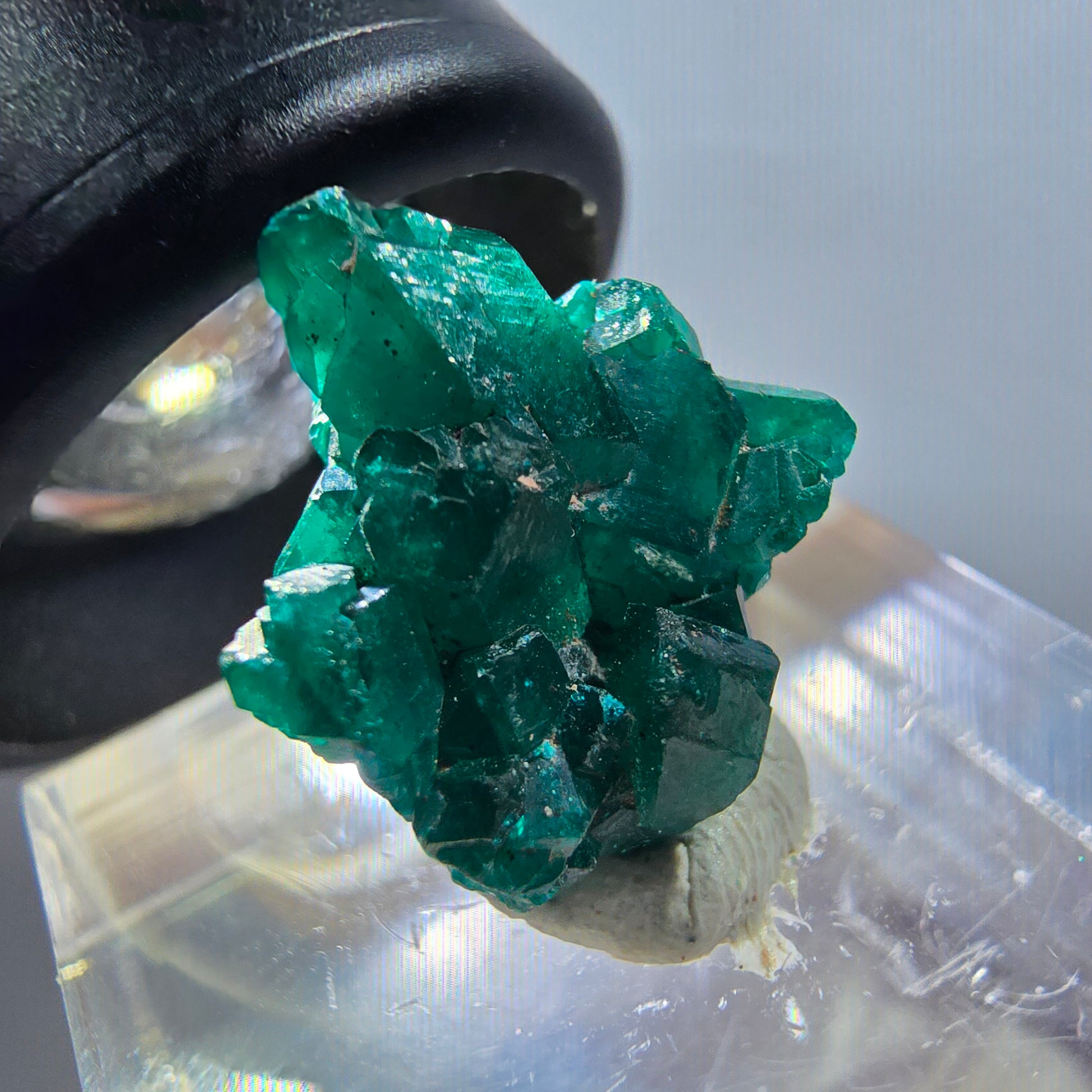 Seltene Dioptas XX Stufe aus der Republik Kongo in atemberaubendem Grün. Diese hochwertige Mineralienstufe präsentiert ausgeprägte, dunkelgrüne bis türkise, kantig gewachsene Dioptas-Kristalle in Maßen von 17x14x10 mm und einem Gewicht von 2,3 g.