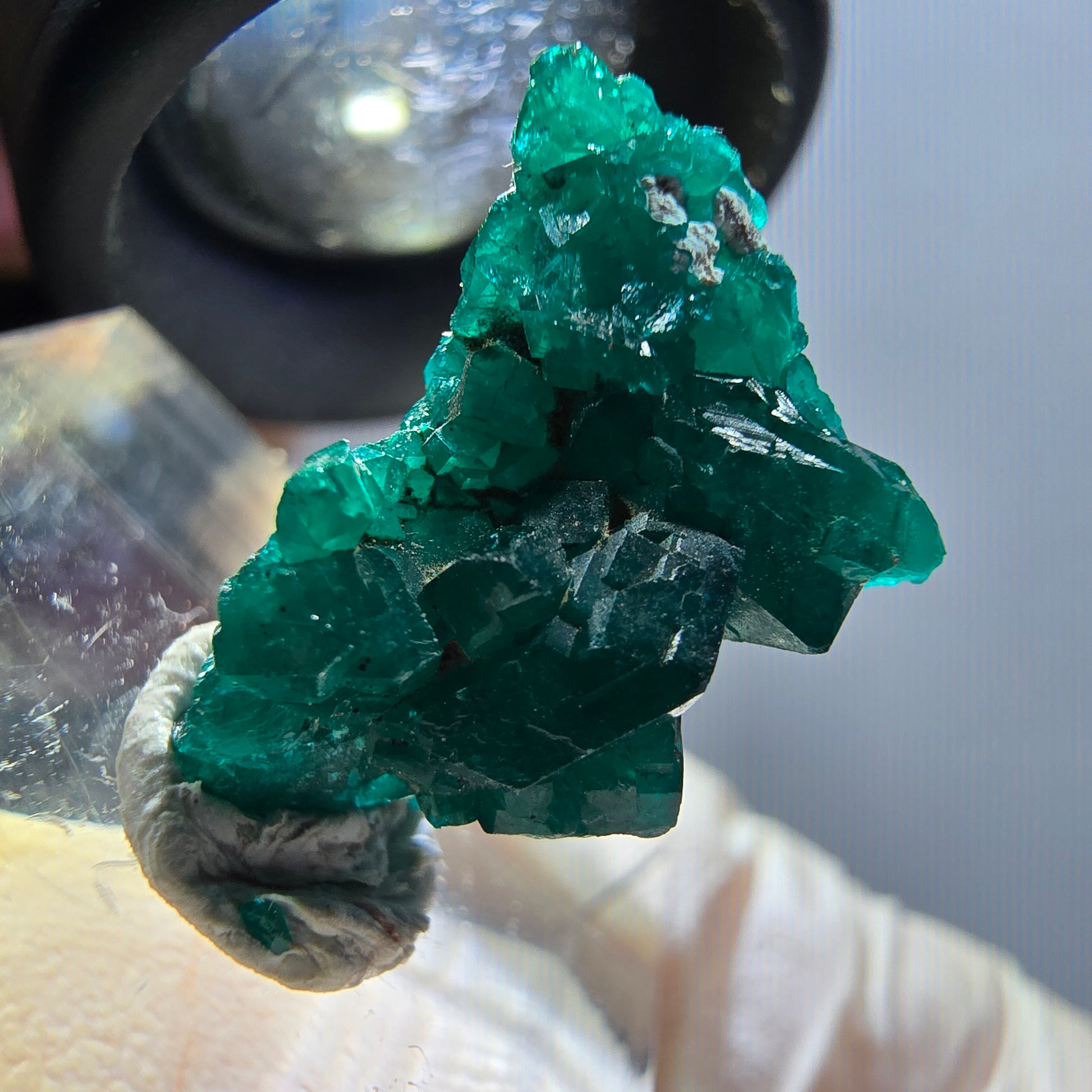 Entdecken Sie diese seltene Dioptas XX Stufe aus der Republik Kongo – eine beeindruckende Mineralienstufe mit ausgeprägten, dunkelgrünen bis türkisen, kantig gewachsenen Dioptas-Kristallen.