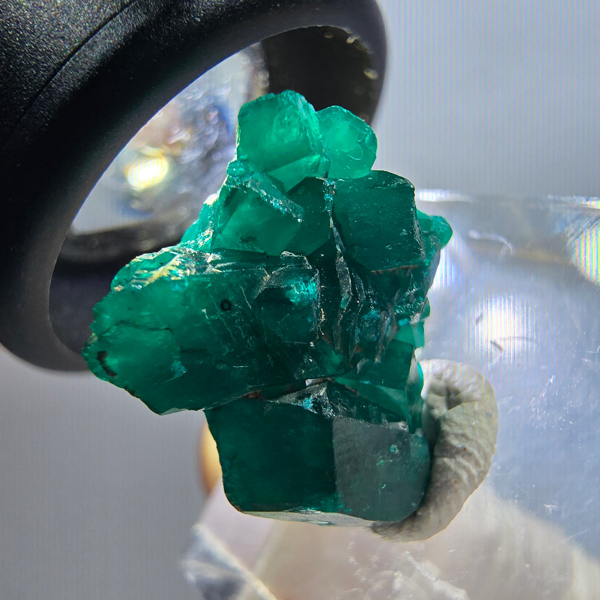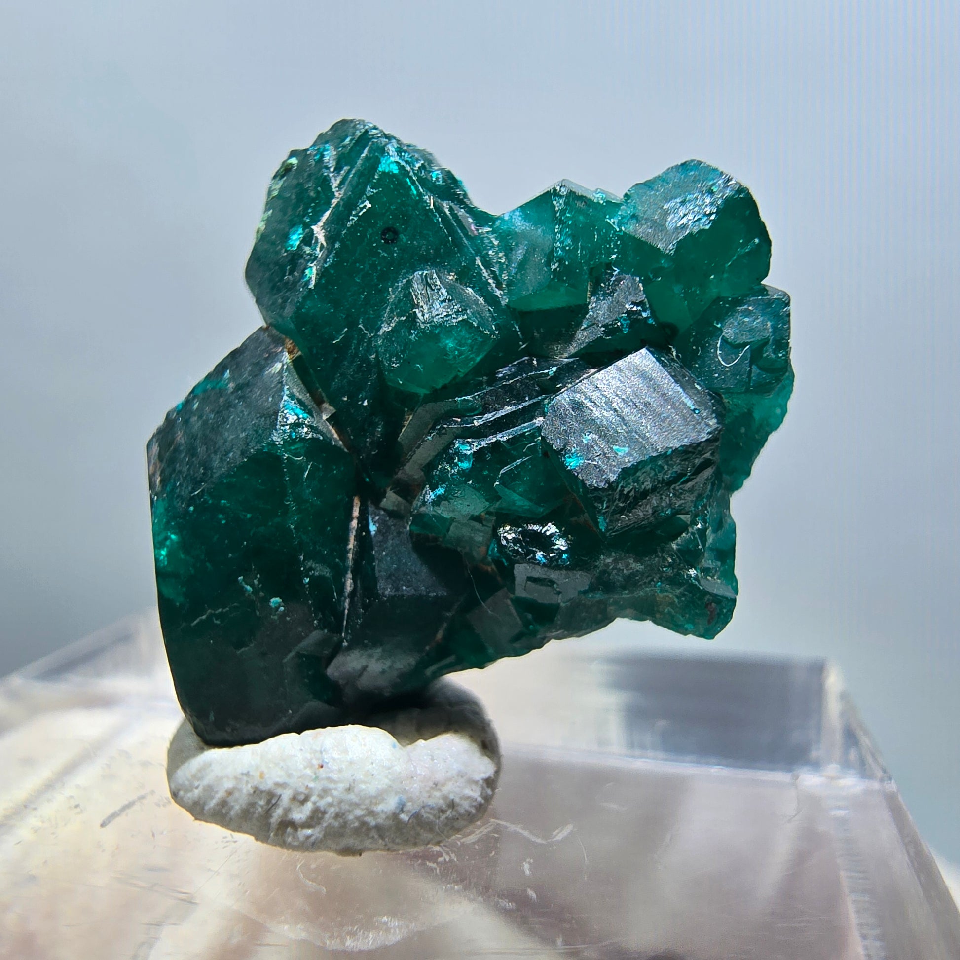 Diese hochwertige Mineralienstufe präsentiert ausgeprägte, dunkelgrüne bis türkise, kantig gewachsene Dioptas-Kristalle in Maßen von 19x17x7 mm und einem Gewicht von 2,82 g.