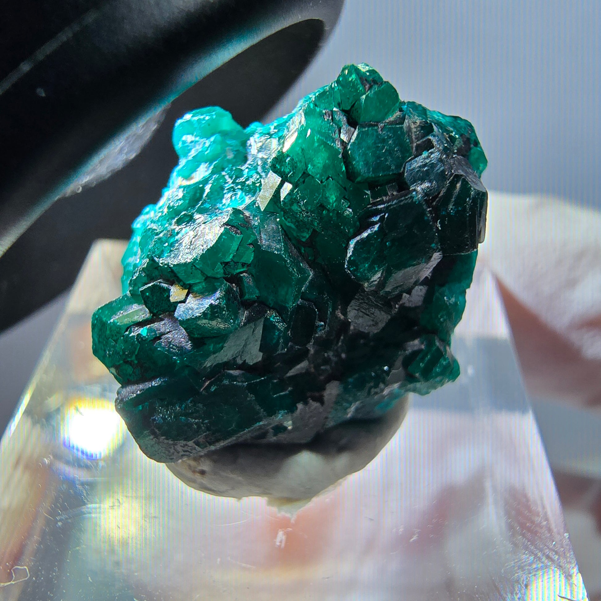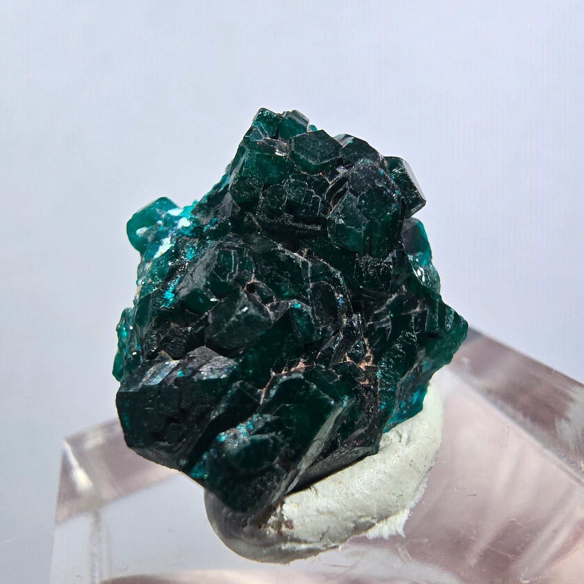 Seltene **Dioptas XX Stufe** aus der Republik Kongo mit ausgeprägten, dunkelgrünen bis türkisen, kantig gewachsenen Kristallen.