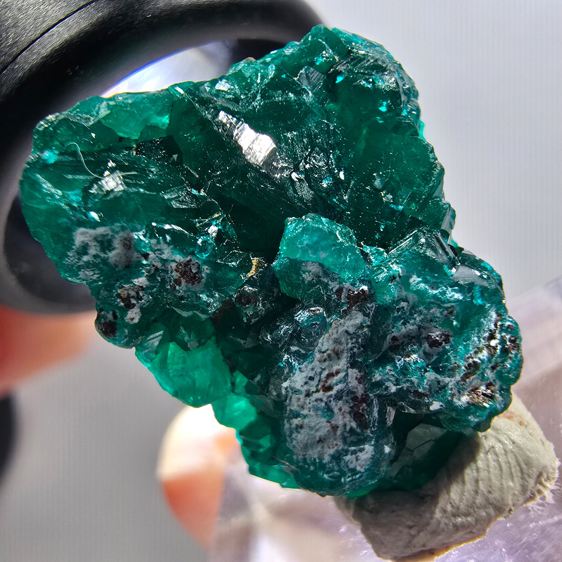 Seltene Dioptas XX Stufe aus der Republik Kongo in atemberaubendem Grün. Diese hochwertige Mineralienstufe präsentiert ausgeprägte, dunkelgrüne bis türkise, kantig gewachsene Dioptas-Kristalle.