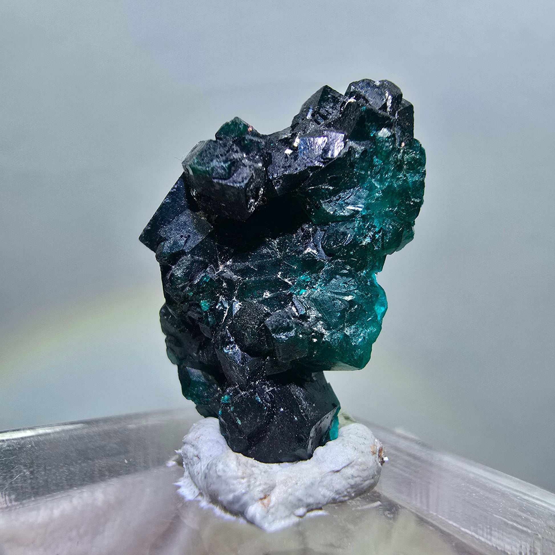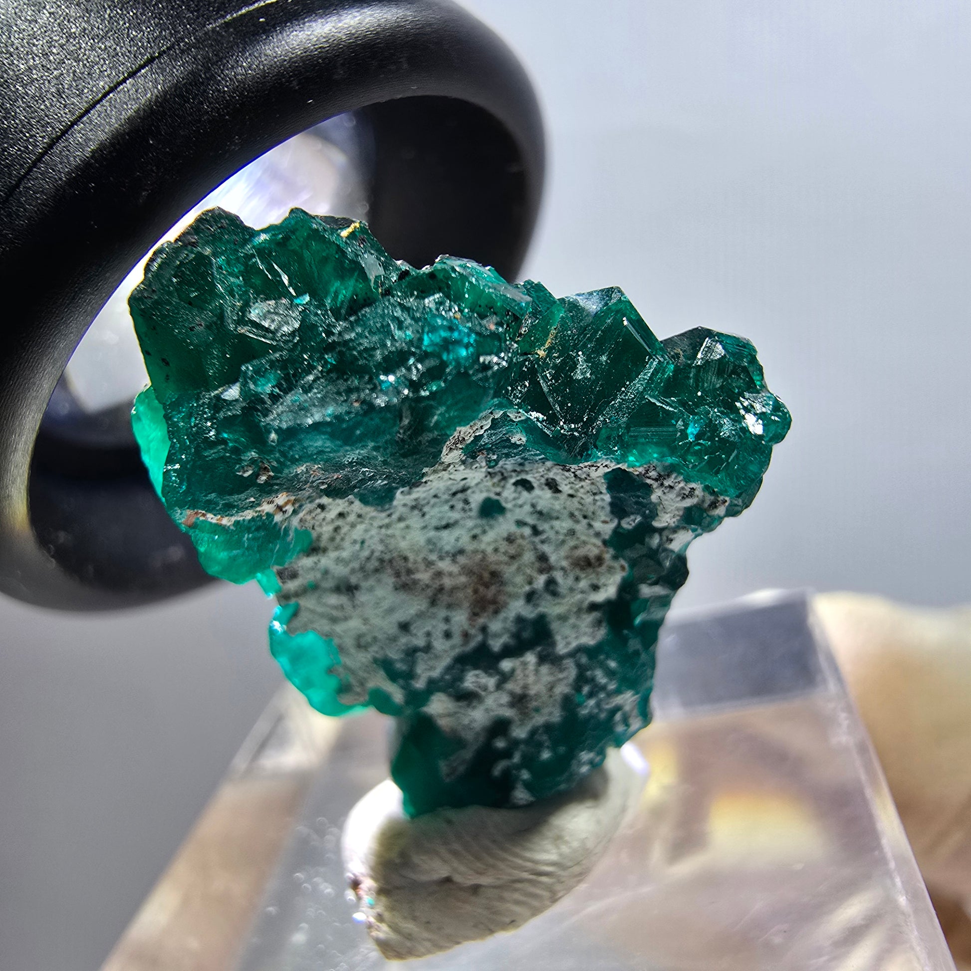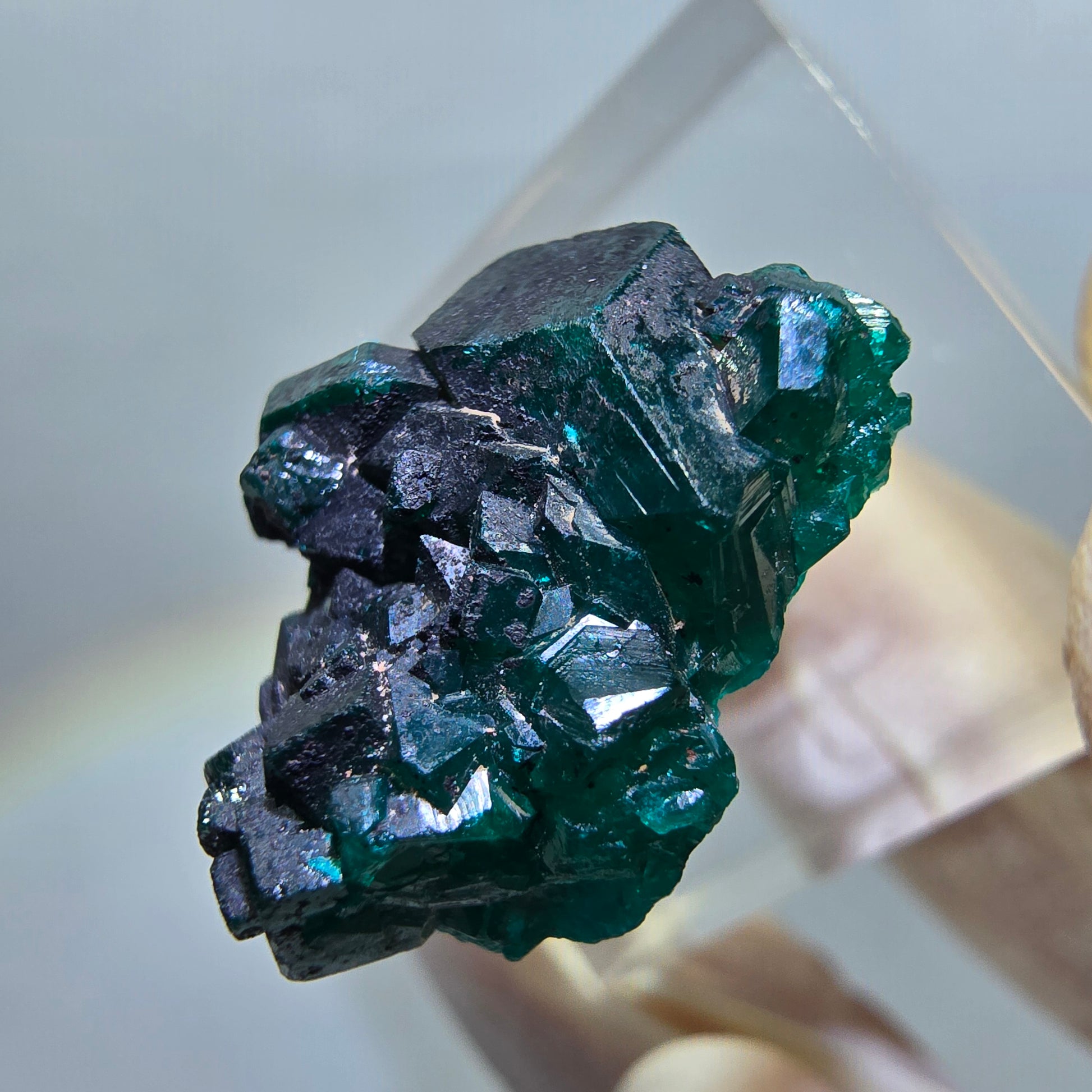 Seltene Dioptas XX Stufe aus der Republik Kongo in atemberaubendem Grün. Diese hochwertige Mineralienstufe präsentiert ausgeprägte, dunkelgrüne bis türkise, kantig gewachsene Dioptas-Kristalle auf einer 24 x 18 x 12 mm großen Stufe bei einem Gewicht von 5,99 g.