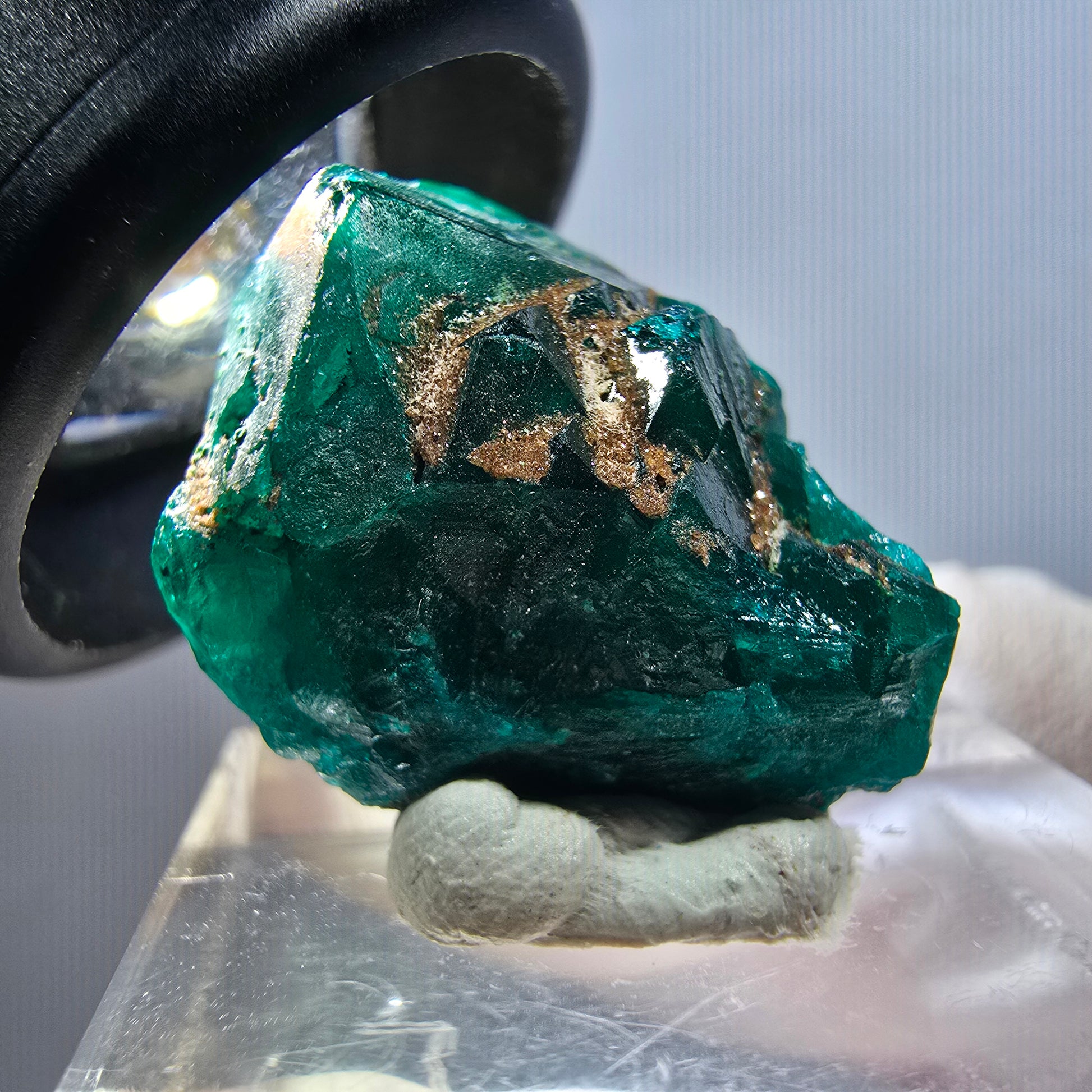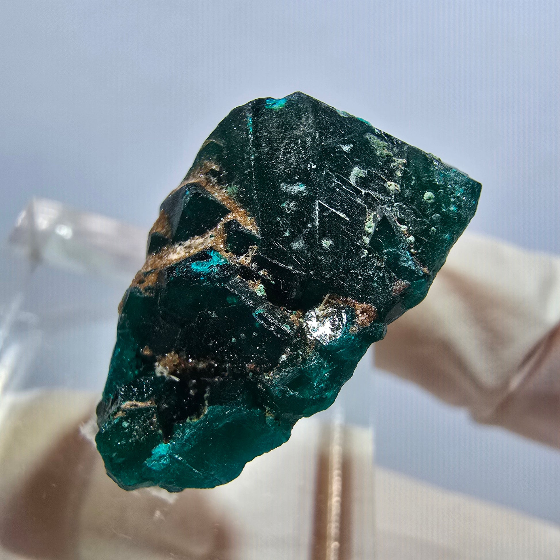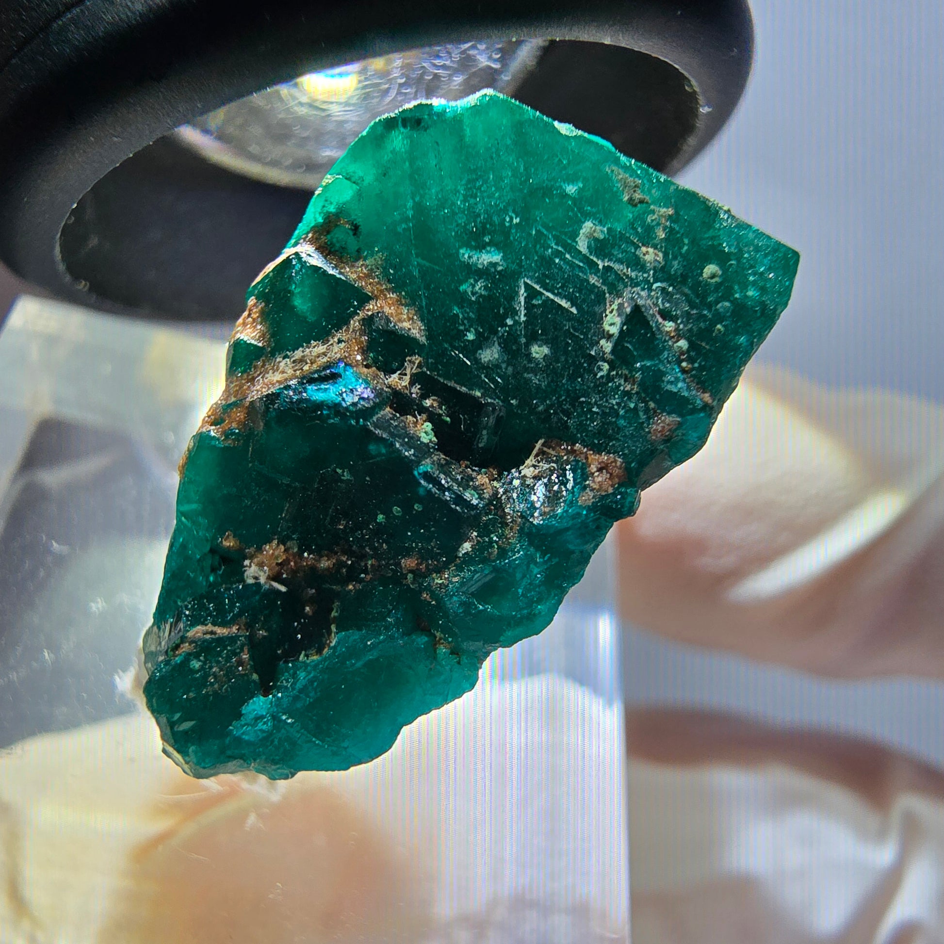 Entdecken Sie diese seltene Dioptas-XX-Stufe aus der Republik Kongo mit ausgeprägten, dunkelgrünen bis türkisen, kantig gewachsenen Kristallen. Die beeindruckende Mineralienstufe misst 25x19x11 mm und wiegt 7,07 g.