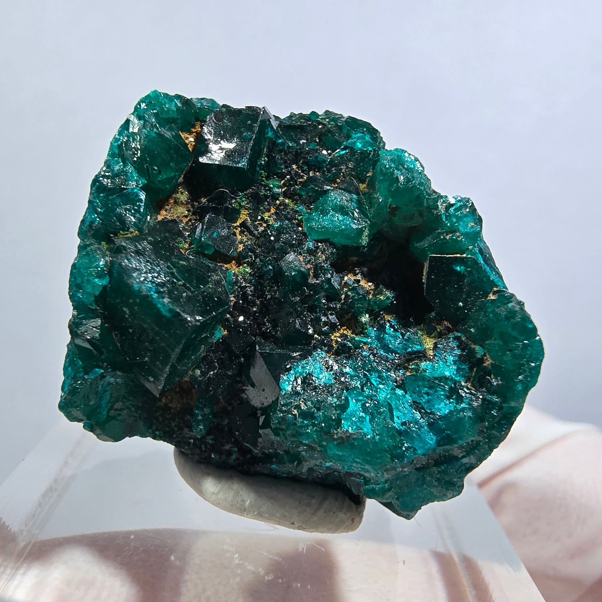 Diese Mineralienstufe (25 x 23 x 17 mm, 11 g) präsentiert ausgeprägte, dunkelgrüne bis türkise, kantig gewachsene Dioptas-Kristalle höchster Sammlerqualität.