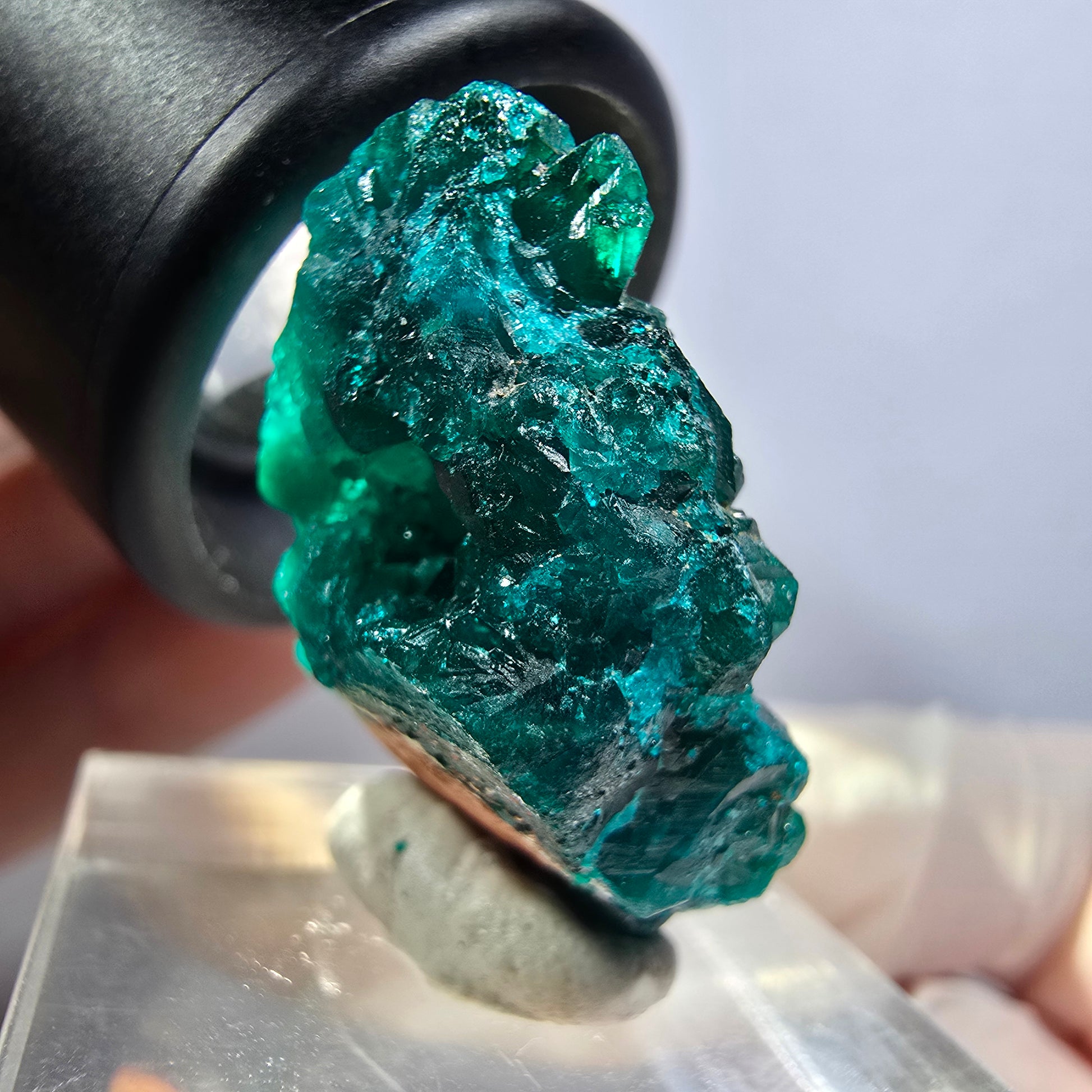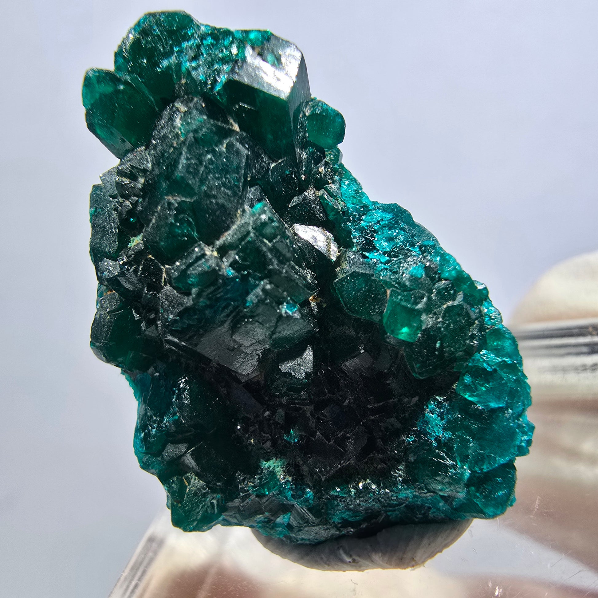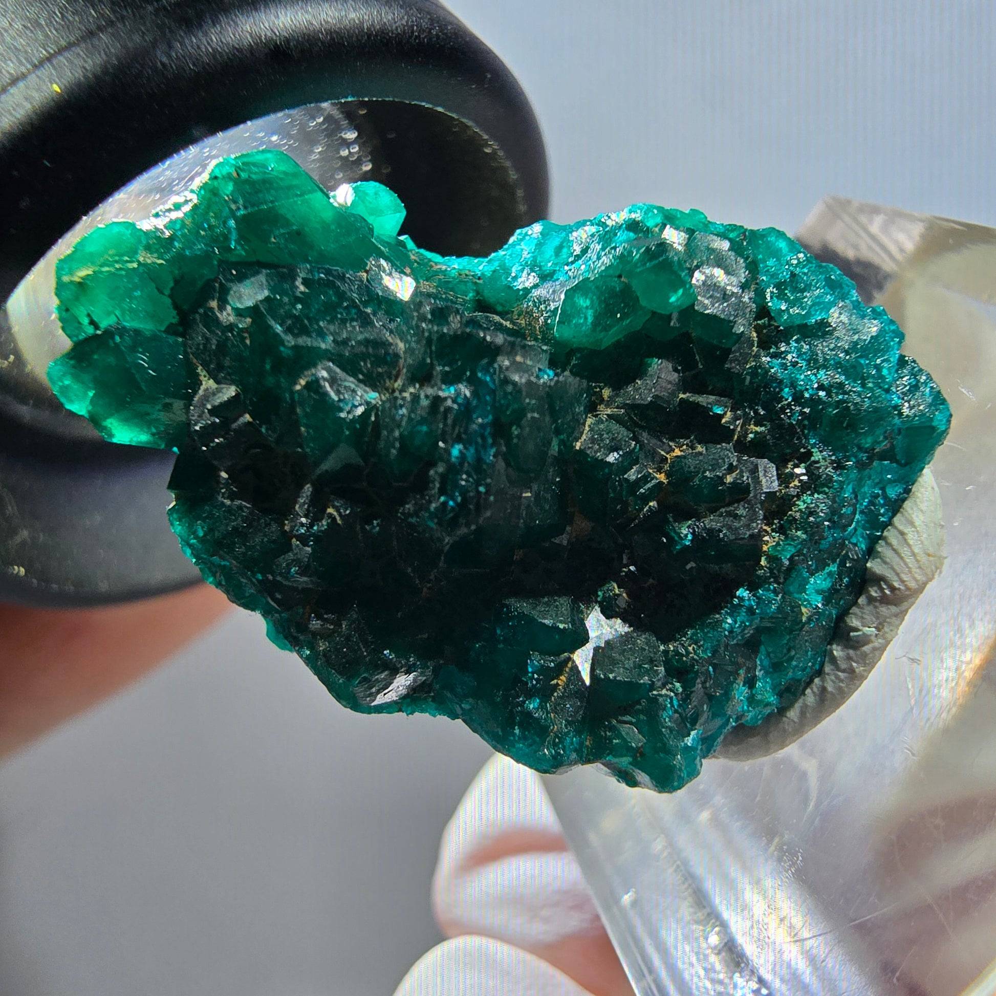 Entdecken Sie diese seltene Dioptas XX Stufe aus der Republik Kongo – eine außergewöhnliche Mineralienstufe mit ausgeprägten, dunkelgrünen bis türkisen, kantig gewachsenen Dioptas-Kristallen. Die 28 x 19 x 14 mm große Stufe wiegt 9,07 g und fasziniert durch ihre intensive Farbe und Kristallstruktur.