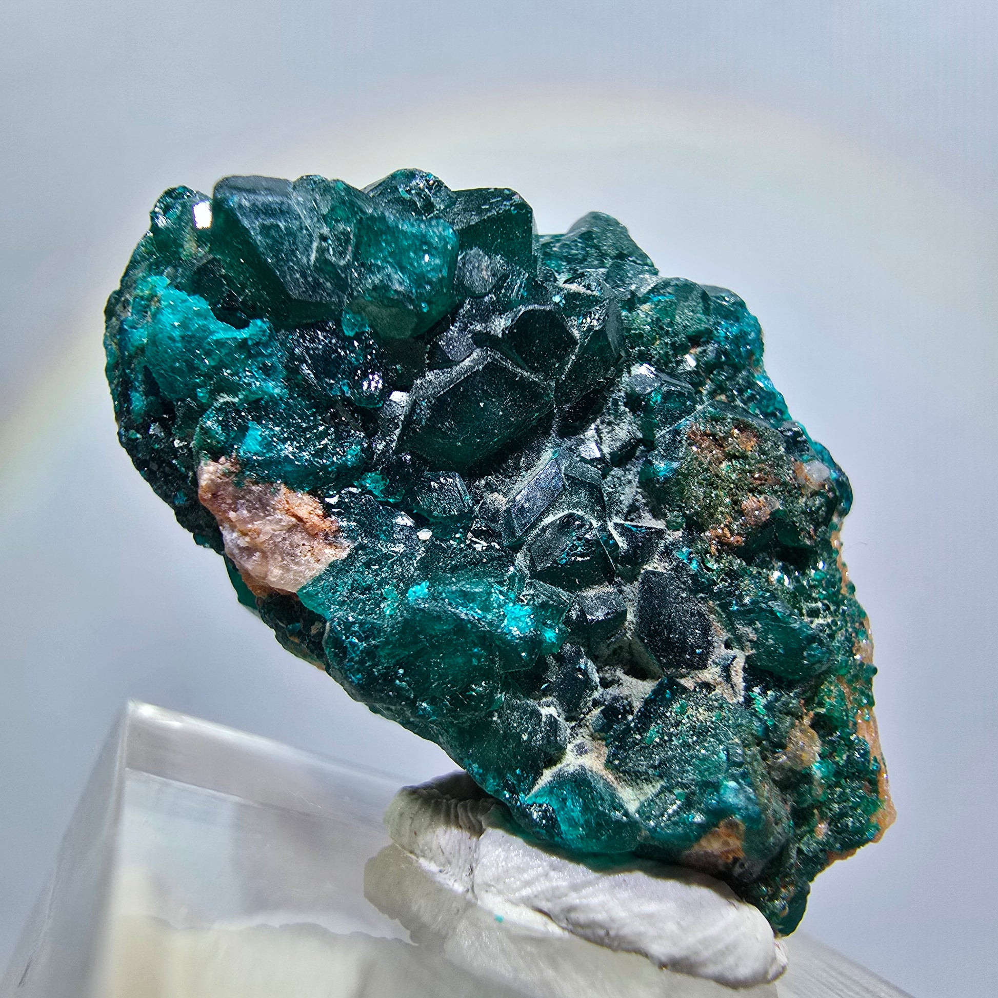 Entdecken Sie diese seltene Dioptas-XX-Stufe aus der Republik Kongo mit ausgeprägten, dunkelgrünen bis türkisen, kantig gewachsenen Kristallen. Die hochwertige Mineralienstufe misst 32x19x11 mm und wiegt 8,32 g.