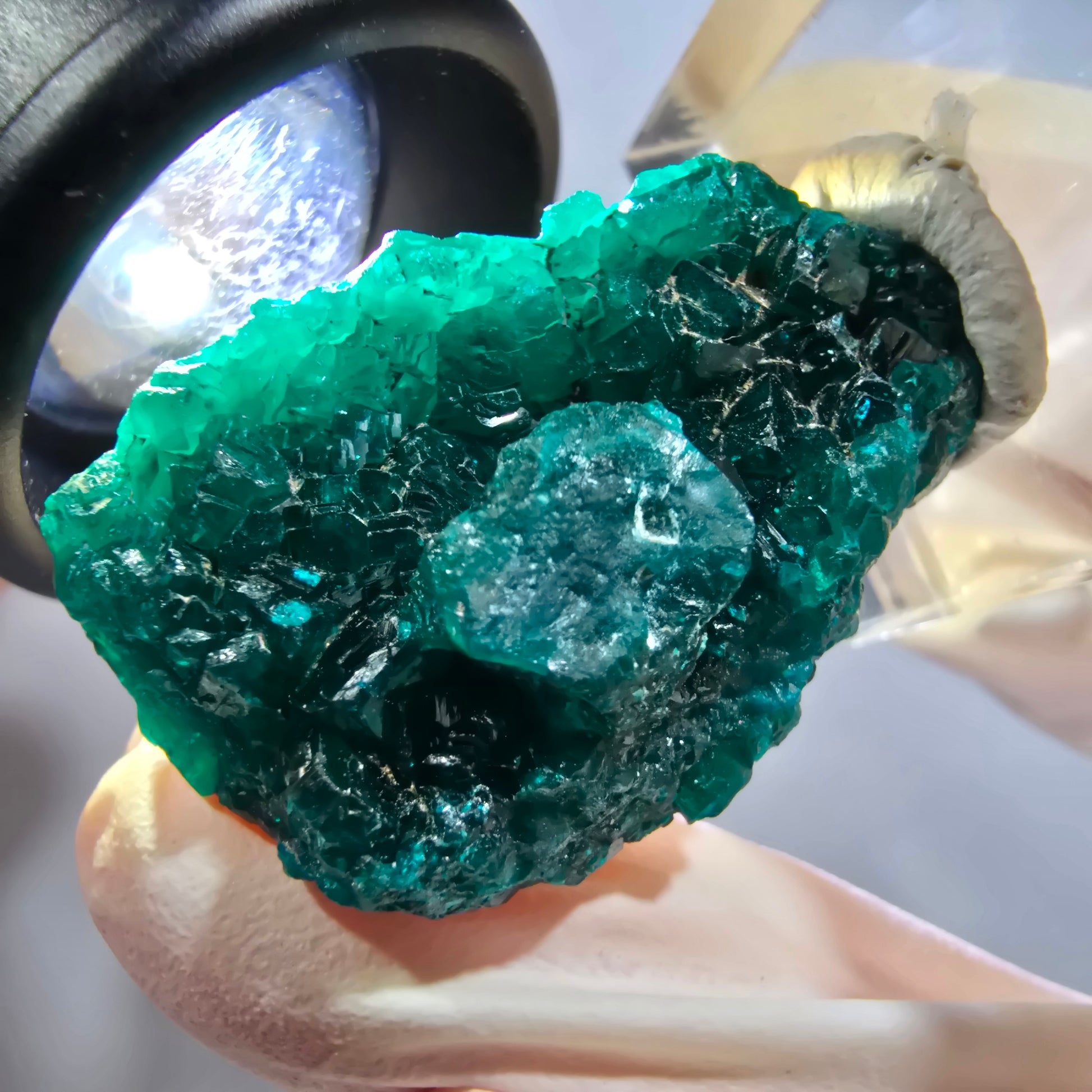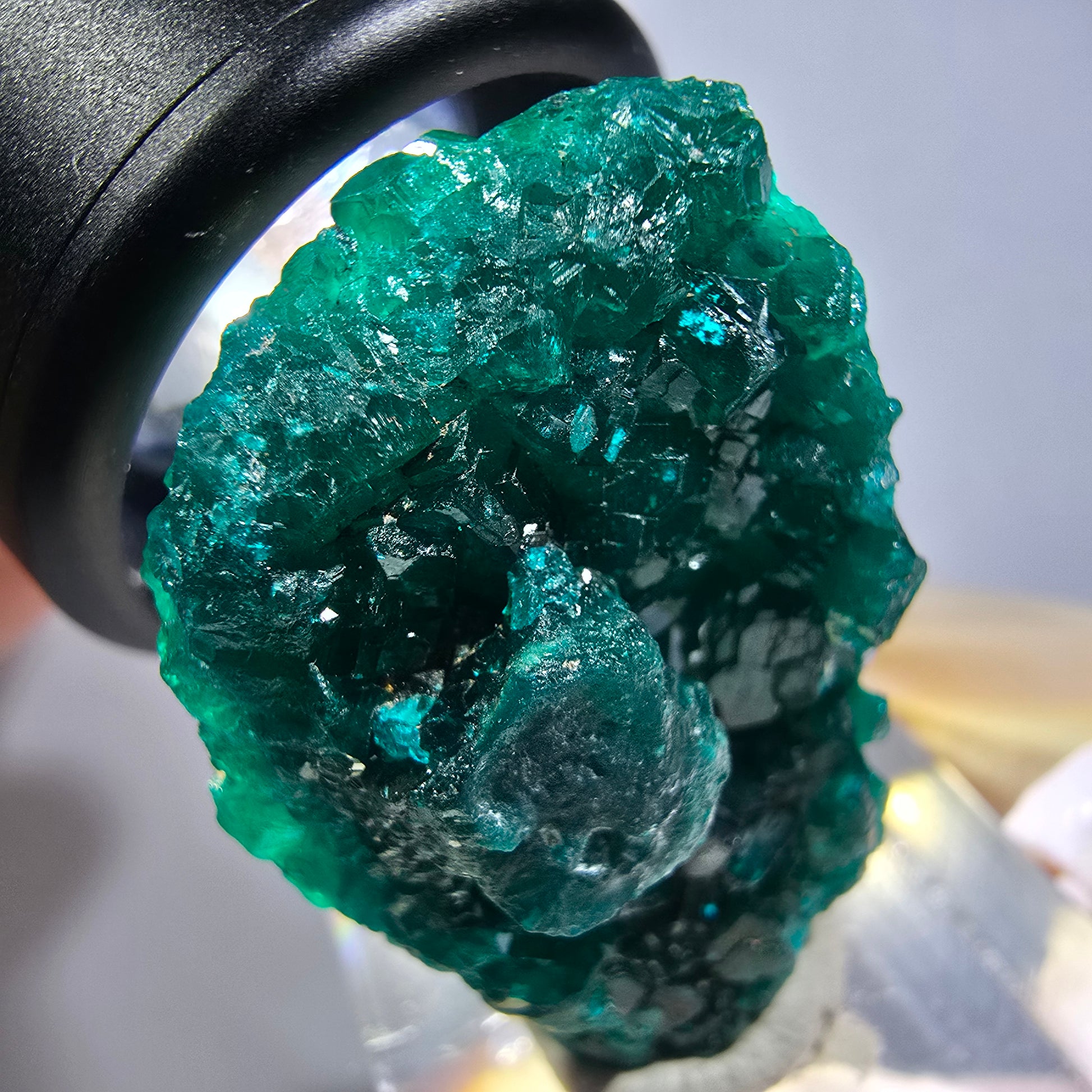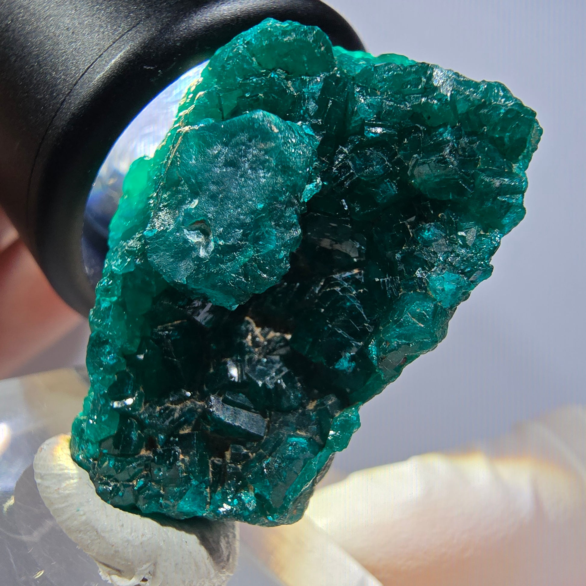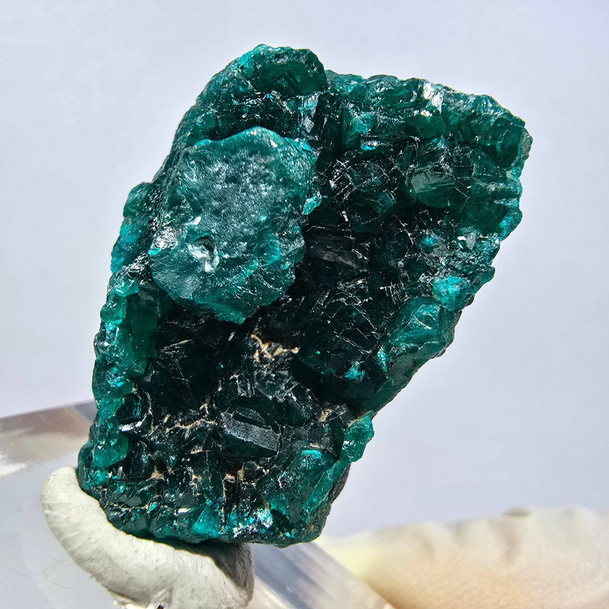 Entdecken Sie diese seltene Dioptas-XX-Stufe aus der Republik Kongo mit ausgeprägten, dunkelgrünen bis türkisen, kantig gewachsenen Dioptas-Kristallen. Die hochwertige Mineralienstufe misst 33x23x15 mm und wiegt 14 g – ein echtes Sammlerstück mit intensiver smaragdgrüner Färbung.