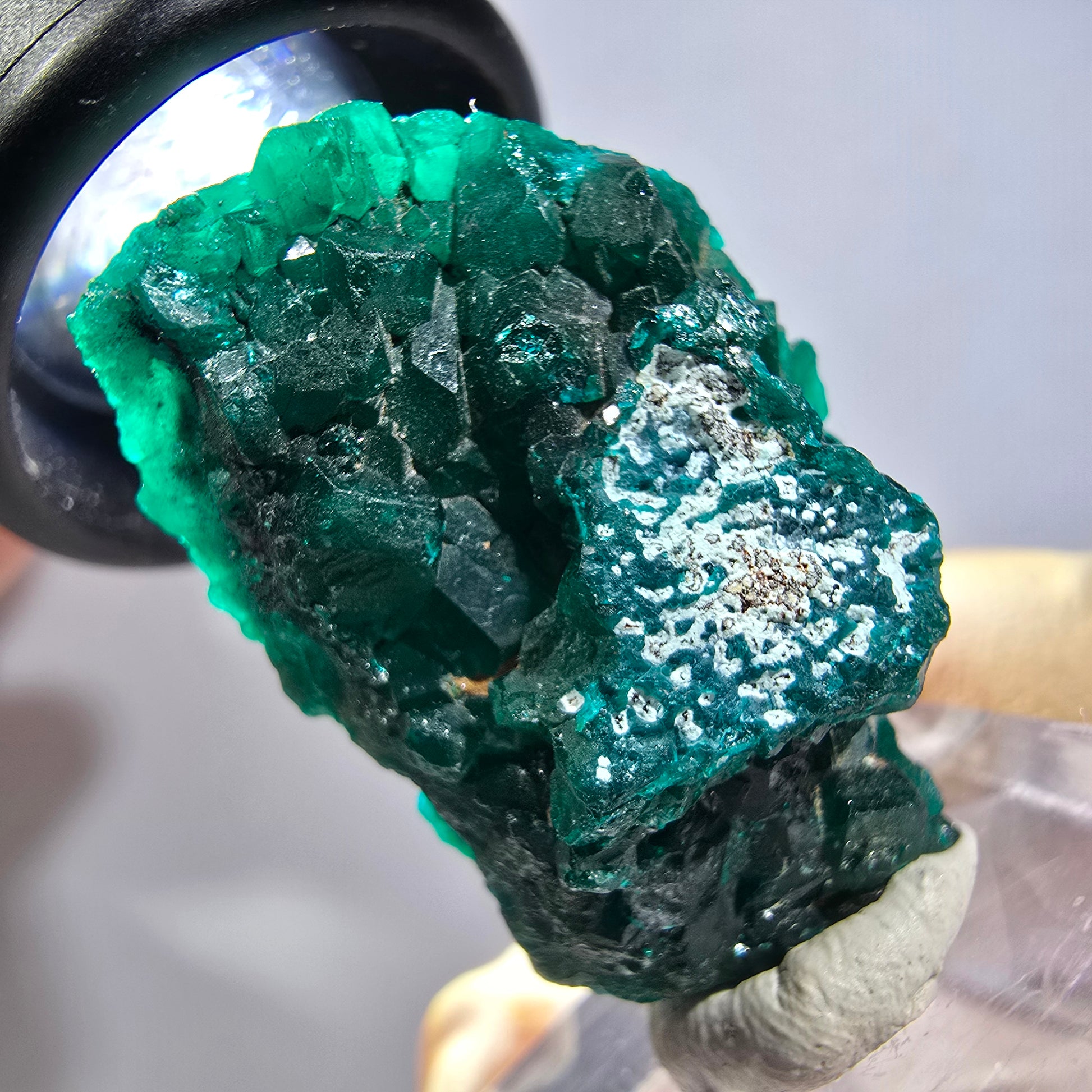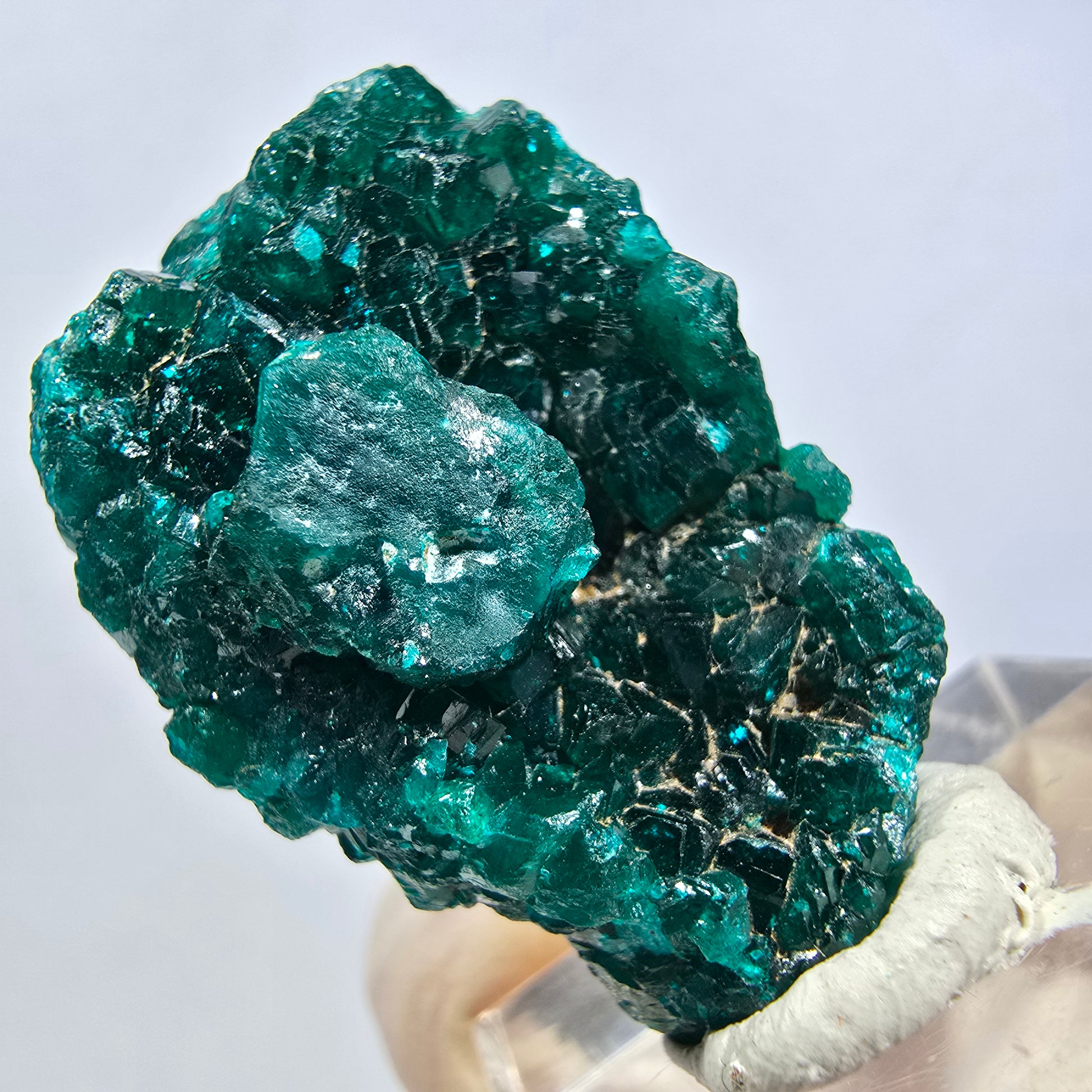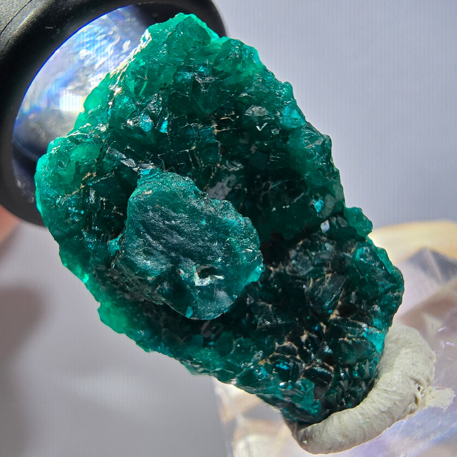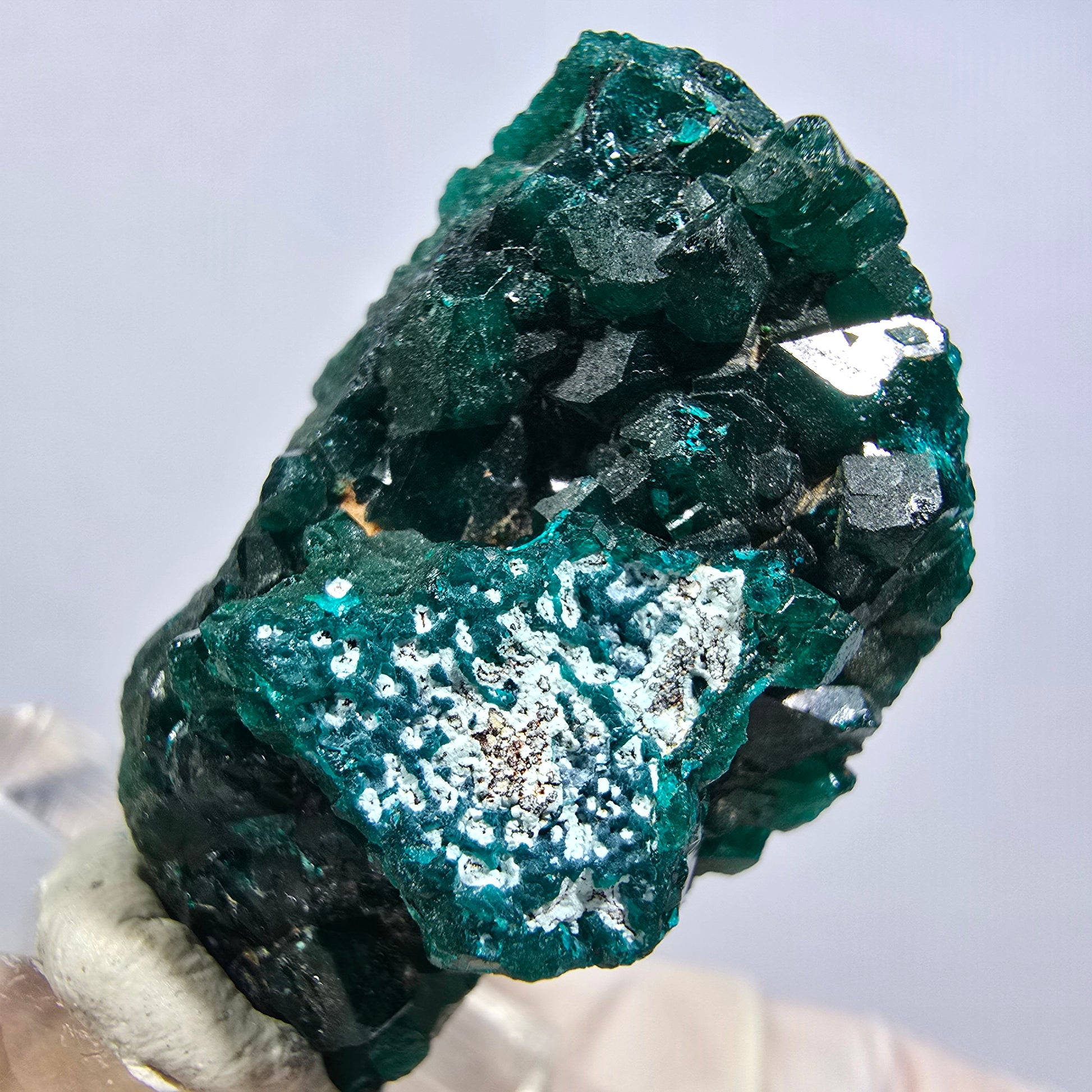 - Besonderheiten: Ausgeprägte, dunkelgrüne, türkise, kantig gewachsene Dioptas-Kristalle