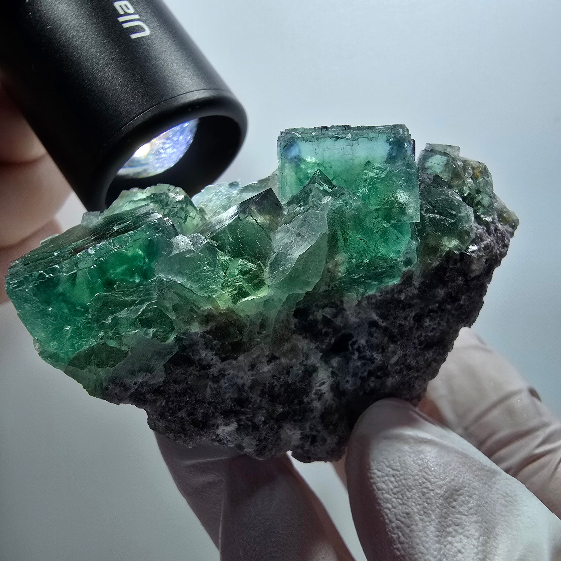 Entdecken Sie diese seltene Phantom Fluorit Würfel Stufe, parkettiert in grün transparenter Farbe mit beeindruckenden Phantomen im Inneren. Die schöne Mineralienstufe stammt aus Okorusu, Namibia, und misst 83x46x44 mm bei einem Gewicht von 180 g.