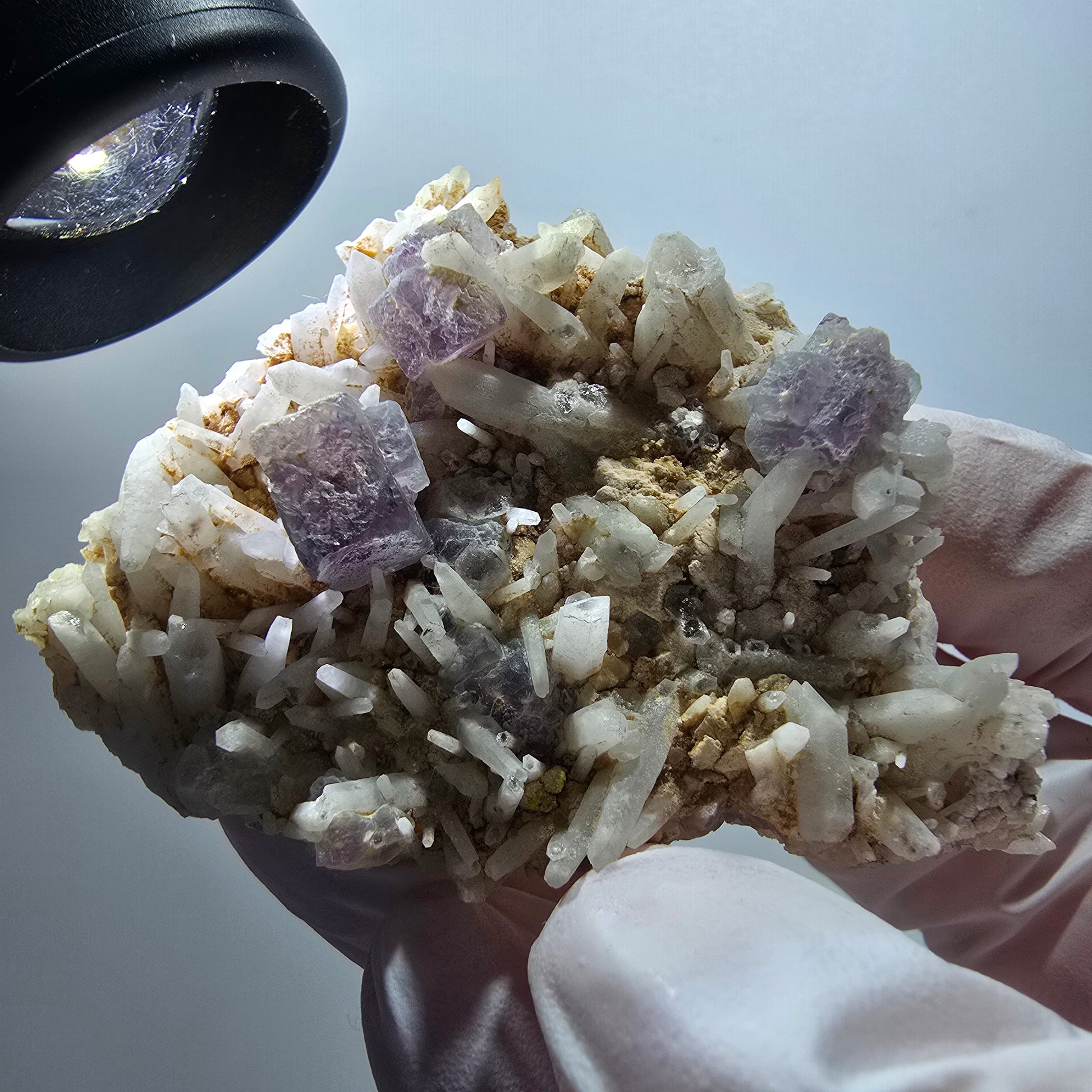 Entdecken Sie diese seltene Phantom Fluorit Würfel Quarz Stufe mit grün-lila Phantomkristallen im Inneren und weißen Quarzspitzen. Aus dem Brandberg in Namibia, Maße 63x45x22 mm, Gewicht 48 g.