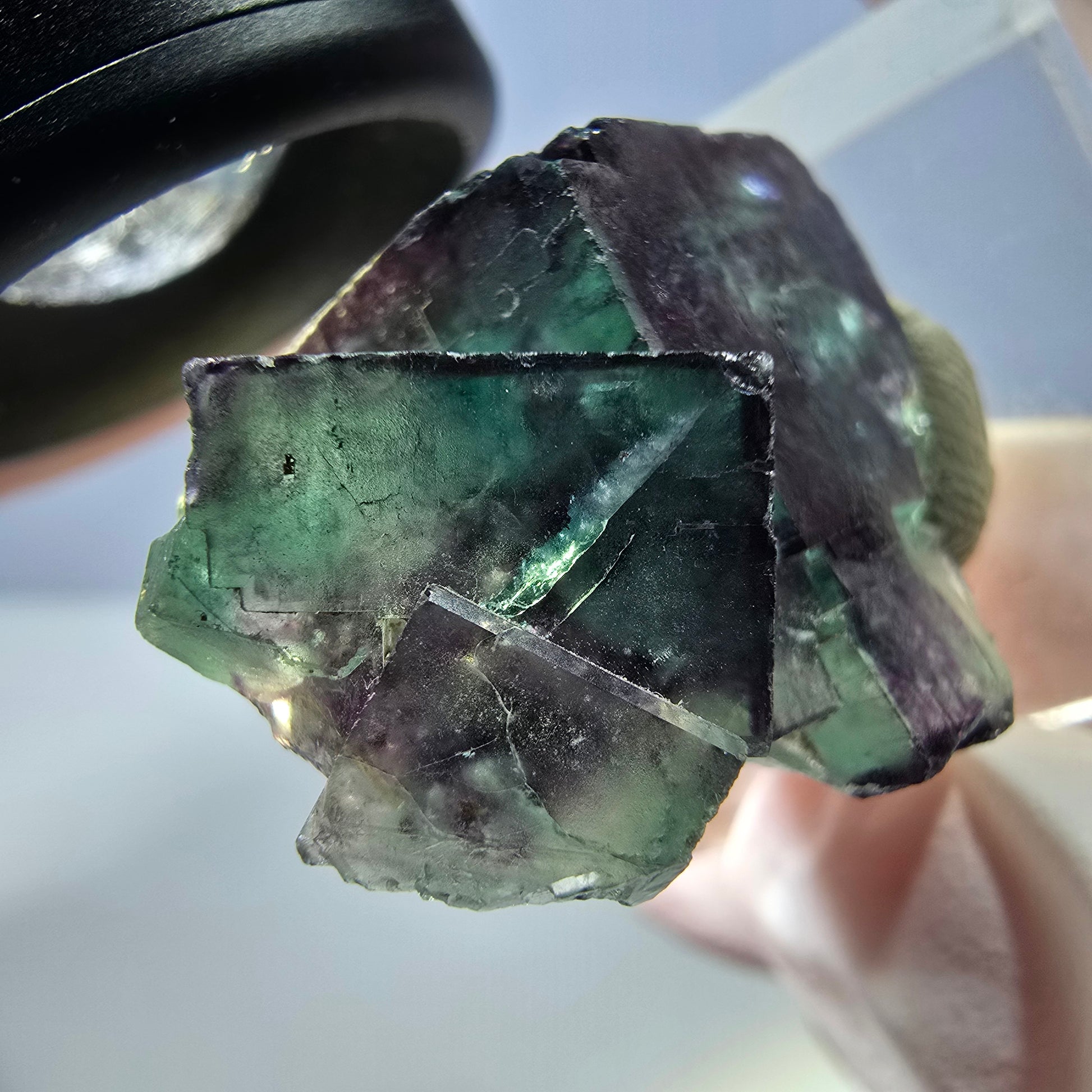 Diese seltene Phantom Fluorit Würfel Stufe aus Okorusu, Namibia, besticht durch ihre grün-lila transparente Farbe und die beeindruckenden kubischen Kristalle mit schönen Phantomen im Inneren. Die Stufe misst 28 x 27 x 15 mm und wiegt 14 g, was sie zu einem besonders hochwertigen Sammlerstück macht.
